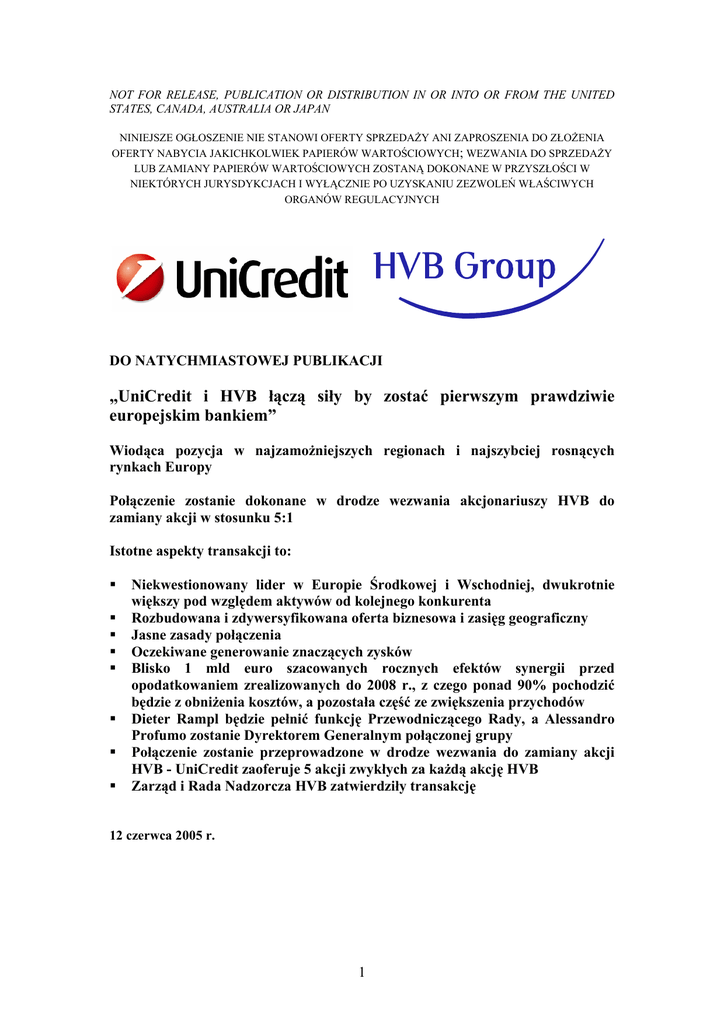 NOT FOR RELEASE, PUBLICATION OR DISTRIBUTION IN OR INTO OR FROM THE UNITED STATES, CANADA, AUSTRALIA OR JAPAN NINIEJSZE OGŁOSZENIE NIE STANOWI OFERTY SPRZEDAŻY ANI ZAPROSZENIA DO ZŁOŻENIA OFERTY NABYCIA JAKICHKOLWIEK PAPIERÓW WARTOŚCIOWYCH; WEZWANIA DO SPRZEDAŻY LUB ZAMIANY PAPIERÓW WARTOŚCIOWYCH ZOSTANĄ DOKONANE W PRZYSZŁOŚCI W NIEKTÓRYCH JURYSDYKCJACH I WYŁĄCZNIE PO UZYSKANIU ZEZWOLEŃ WŁAŚCIWYCH ORGANÓW REGULACYJNYCH DO NATYCHMIASTOWEJ PUBLIKACJI „UniCredit i HVB łączą siły by zostać pierwszym prawdziwie europejskim bankiem” Wiodąca pozycja w najzamożniejszych regionach i najszybciej rosnących rynkach Europy Połączenie zostanie dokonane w drodze wezwania akcjonariuszy HVB do zamiany akcji w stosunku 5:1 Istotne aspekty transakcji to: Niekwestionowany lider w Europie Środkowej i Wschodniej, dwukrotnie większy pod względem aktywów od kolejnego konkurenta Rozbudowana i zdywersyfikowana oferta biznesowa i zasięg geograficzny Jasne zasady połączenia Oczekiwane generowanie znaczących zysków Blisko 1 mld euro szacowanych rocznych efektów synergii przed opodatkowaniem zrealizowanych do 2008 r., z czego ponad 90% pochodzić będzie z obniżenia kosztów, a pozostała część ze zwiększenia przychodów Dieter Rampl będzie pełnić funkcję Przewodniczącego Rady, a Alessandro Profumo zostanie Dyrektorem Generalnym połączonej grupy Połączenie zostanie przeprowadzone w drodze wezwania do zamiany akcji HVB - UniCredit zaoferuje 5 akcji zwykłych za każdą akcję HVB Zarząd i Rada Nadzorcza HVB zatwierdziły transakcję 12 czerwca 2005 r. 1 UniCredit i HVB niniejszym ogłaszają, że Rada Dyrektorów UniCredit oraz Zarząd i Rada Nadzorcza HVB zatwierdziły połączenie HVB i UniCredit. Rady Dyrektorów UniCredit i Zarząd HVB, za zgodą Rady Nadzorczej HVB, postanowiły zawrzeć Umowę o Połączeniu Przedsiębiorstw (Business Combination Agreement; BCA), określającą warunki takiego połączenia. Uzasadnienie Transakcji Połączenie doprowadzi do utworzenia Nowej Siły w europejskiej bankowości z: Bazą ponad 28 milionów klientów; ponad 7,000 oddziałami w 19 krajach i łącznymi aktywami w wysokości 733 mld euro Wiodącą pozycją na wielu sąsiadujących rynkach krajowych (Włochy, Niemcy i Austria) z unikalną obecnością w Bawarii, Austrii i północnych Włoszech, które są jednymi z najzamożniejszych regionów Europy Niekwestionowanym przywództwem w krajach Europy Środkowej i Wschodniej pod względem aktywów ogółem i liczby oddziałów Zrównoważonym i zdywersyfikowanym portfelem biznesowym W swoim komentarzu na temat transakcji Alessandro Profumo, Dyrektor Generalny UniCredit, powiedział: „UniCredit oraz HVB będą nową siłą zakorzenioną w sercu Europy z trzema sąsiadującymi rynkami krajowymi stanowiącymi jeden z najlepiej prosperujących regionów kontynentu. Staniemy się pierwszym prawdziwie europejskim bankiem łączącym nasze siły w celu świadczenia rozbudowanych usług i służenia innowacjami naszym klientom i zwiększania wartości dla naszych akcjonariuszy”. Komentując transakcję Dieter Rampl, Dyrektor Generalny HVB stwierdził: „Dzięki tej transakcji, UniCredit i HVB stają się liderami konsolidacji europejskiej bankowości, która umożliwiła obu stronom wybór najlepszego partnera. Tworzymy nowe perspektywy wzrostu dla naszych akcjonariuszy, klientów i pracowników, które nie byłyby możliwe do osiągnięcia w pojedynkę. Niemcy będą w dalszym ciągu odgrywać ważną rolę w pierwszej transakcji przeprowadzonej na taką skalę w Europie. ” Połączony podmiot („Grupa”) będzie miał następujące cele strategiczne: Dalsze umocnienie swojej pozycji konkurencyjnej na rynkach, na których jest już obecna Utrzymanie i umocnienie wiodącej pozycji w Europie Środkowej i Wschodniej Optymalizacja i konsolidacja działalności na rynkach Europy Środkowej i Wschodniej, w tym umocnienie wspólnego wizerunku Wykorzystanie uzupełniających się mocnych stron i masy krytycznej w dziedzinach biznesowych funkcjonujących w oparciu o efekt skali, takich jak zarządzanie aktywami oraz bankowość inwestycyjna Skoncentrowanie się na rozwoju w wybranych regionach i dziedzinach biznesowych Maksymalizacja synergii w odniesieniu do przychodów i kosztów w drodze wzajemnego korzystania z najlepszych praktyk, optymalizacji zdolności produkcyjnych oraz racjonalizacji pokrywających się lub dublujących się funkcji Szczegóły Transakcji Transakcja będzie składać się z trzech dobrowolnych wezwań do zamiany akcji UniCredit na akcje HVB, Banku Austria i BPH, które będą zatwierdzone przez właściwe władze lokalne („Wezwania”). Wezwania na akcje Banku Austria i BPH będą również zawierać możliwość sprzedaży akcji. 2 Wezwanie dotyczące akcji HVB zostanie dokonane w oparciu o parytet zamiany 5 nowo emitowanych akcji zwykłych UniCredit za każdą akcję HVB. Parytet zamiany zawiera premię w wysokości 16,9% ponad 3-miesięczną średnią kursów zamknięcia akcji HVB na dzień 10 czerwca 2005 r.1, lub 10,4% - powyżej kursu zamknięcia HVB w dniu 25 maja 2005 r.2 (dzień przed rozpoczęciem znaczących spekulacji medialnych), co daje, w oparciu o kurs zamknięcia akcji UniCredit w dniu 10 czerwca 2005 r., łączną wartość transakcji w wysokości 15,4 mld euro za 100% kapitału zakładowego HVB. Wezwanie dotyczące akcji Banku Austria zostanie dokonane w oparciu o parytet zamiany 19,92 nowo emitowanych akcji zwykłych UniCredit za każdą akcję Banku Austria. Parytet zamiany zawiera premię w wysokości 16,9% ponad 3-miesięczną średnią kursów zamknięcia akcji Banku Austria na dzień 10 czerwca 2005 r.1, lub 12,1% - powyżej kursu zamknięcia akcji Banku Austria w dniu 25 maja 2005 r.2 Wezwanie dotyczące akcji BPH zostanie dokonane w oparciu o parytet zamiany 33,13 nowo emitowanych akcji zwykłych UniCredit za każdą akcję BPH. Parytet zamiany zakłada premię w wysoko