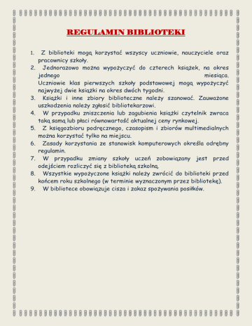 REGULAMIN BIBLIOTEKI 1. 2. 3. 4. 5. 6. 7. 8. 9. Z biblioteki mogą korzystać wszyscy uczniowie, nauczyciele oraz pracownicy szkoły. Jednorazowo można wypożyczyć do czterech książek, na okres jednego miesiąca. Uczniowie klas pierwszych szkoły podstawowej mogą wypożyczyć najwyżej dwie książki na okres dwóch tygodni. Książki i inne zbiory biblioteczne należy szanować. Zauważone uszkodzenia należy zgłosić bibliotekarzowi. W przypadku zniszczenia lub zagubienia książki czytelnik zwraca taką samą lub płaci równowartość aktualnej ceny rynkowej. Z księgozbioru podręcznego, czasopism i zbiorów multimedialnych można korzystać tylko na miejscu. Zasady korzystania ze stanowisk komputerowych określa odrębny regulamin. W przypadku zmiany szkoły uczeń zobowiązany jest przed odejściem rozliczyć się z biblioteką szkolną. Wszystkie wypożyczone książki należy zwrócić do biblioteki przed końcem roku szkolnego (w terminie wyznaczonym przez bibliotekę). W bibliotece obowiązuje cisza i zakaz spożywania posiłków. REGULAMIN INTERNETOWEGO CENTRUM INFORMACJI MULTIMEGIALNEJ 1. Centrum Multimedialne służy wszystkim uczniom i nauczycielom do celów edukacyjnych i informacyjnych 2. Centrum Multimedialne służy wszystkim uczniom i nauczycielom do celów edukacyjnych i informacyjnych 3. Przy jednym stanowisku komputerowym mogą pracować najwyżej dwie osoby. 4. W przypadku dużej ilości chętnych do korzystania z komputerów mogą być wprowadzone limity czasowe. 5. Każdy korzystający z centrum jest odpowiedzialny za udostępnione mu urządzenia i odpowiada materialnie za wyrządzone szkody. 6. Z drukarki i kopiarki korzysta się w uzasadnionych przypadkach, za zgodą opiekuna Centrum Multimedialnego. 7. Każde zauważone nieprawidłowości w pracy urządzeń powinny być zgłoszone opiekunowi centrum. 8. Opiekunem Centrum Multimedialnego jest bibliotekarz. Nadzór techniczny sprawuje nauczyciel informatyki. 9. Korzystanie z centrum do celów innych niż naukowe jest możliwe w przypadku wolnych stanowisk i za zgodą bibliotekarza. 10. Wykorzystanie komputerów niezgodne z regulaminem jest równoznaczne z wykluczeniem spośród osób mogących korzystać z centrum. 11. Każdy korzystający z Centrum Multimedialnego ma obowiązek przestrzegania regulaminu