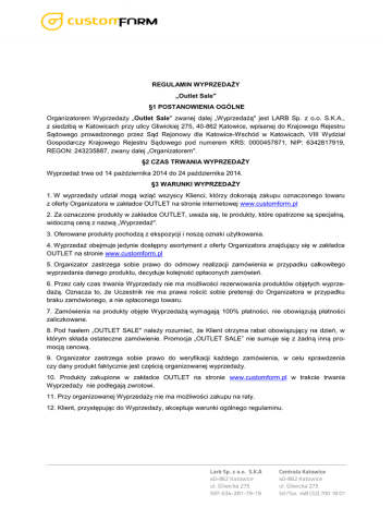 REGULAMIN WYPRZEDAŻY „Outlet Sale" §1 POSTANOWIENIA OGÓLNE Organizatorem Wyprzedaży „Outlet Sale" zwanej dalej „Wyprzedażą" jest LARB Sp. z o.o. S.K.A., z siedzibą w Katowicach przy ulicy Gliwickiej 275, 40-862 Katowice, wpisanej do Krajowego Rejestru Sądowego prowadzonego przez Sąd Rejonowy dla Katowice-Wschód w Katowicach, VIII Wydział Gospodarczy Krajowego Rejestru Sądowego pod numerem KRS: 0000457871, NIP: 6342817919, REGON: 243235887, zwany dalej „Organizatorem". §2 CZAS TRWANIA WYPRZEDAŻY Wyprzedaż trwa od 14 października 2014 do 24 października 2014. §3 WARUNKI WYPRZEDAŻY 1. W wyprzedaży udział mogą wziąć wszyscy Klienci, którzy dokonają zakupu oznaczonego towaru z oferty Organizatora w zakładce OUTLET na stronie internetowej www.customform.pl 2. Za oznaczone produkty w zakładce OUTLET, uważa się, te produkty, które opatrzone są specjalną, widoczną ceną z nazwą „Wyprzedaż". 3. Oferowane produkty pochodzą z ekspozycji i noszą oznaki użytkowania. 4. Wyprzedaż obejmuje jedynie dostępny asortyment z oferty Organizatora znajdujący się w zakładce OUTLET na stronie www.customform.pl 5. Organizator zastrzega sobie prawo do odmowy realizacji zamówienia w przypadku całkowitego wyprzedania danego produktu, decyduje kolejność opłaconych zamówień. 6. Przez cały czas trwania Wyprzedaży nie ma możliwości rezerwowania produktów objętych wyprzedażą. Oznacza to, że Uczestnik nie ma prawa rościć sobie pretensji do Organizatora w przypadku braku zamówionego, a nie opłaconego towaru. 7. Zamówienia na produkty objęte Wyprzedażą wymagają 100% płatności, nie obowiązują płatności zaliczkowane. 8. Pod hasłem „OUTLET SALE" należy rozumieć, że Klient otrzyma rabat obowiązujący na dzień, w którym składa ostateczne zamówienie. Promocja „OUTLET SALE” nie sumuje się z żadną inną promocją cenową. 9. Organizator zastrzega sobie prawo do weryfikacji każdego zamówienia, w celu sprawdzenia czy dany produkt faktycznie jest częścią organizowanej wyprzedaży. 10. Produkty zakupione w zakładce OUTLET na stronie www.customform.pl w trakcie trwania Wyprzedaży nie podlegają zwrotowi. 11. Przy organizowanej Wyprzedaży nie ma możliwości zakupu na raty. 12. Klient, przystępując do Wyprzedaży, akceptuje warunki ogólnego regulaminu. §4 WARUNKI WYSYŁKI 1. W przypadku odbioru osobistego, Klient zobowiązany jest do zgłoszenia się do OUTLETU w Katowicach na ulicy Gliwickiej w którym znajduje się zakupiony towar, w celu odbioru zamówionych produktów do 5 dni roboczych, od poniedziałku do piątku w godzinach od 09:00 do 15:30. 2. W przypadku wysyłki zamówionych produktów nastąpi ona bezzwłocznie ( z zachowaniem standardowego czasu koniecznego do przygotowania paczek). Nie ma możliwości przetrzymywania, czy też magazynowania zamówionych produktów. 3. Koszt wysyłki będzie wyliczony przez sprzedawcę oraz przekazany Klientowi przed realizacją zamówienia. §5 ODPOWIEDZIALNOŚĆ Wszelkie ewentualne zastrzeżenia związane z Wyprzedażą, Uczestnik może kierować wyłącznie do Organizatora na podstawie zgłoszenia mailowego na adres [email protected]. §6 POSTANOWIENIA KOŃCOWE Niniejszy regulamin jest jedynym dokumentem określającym zasady udziału w Wyprzedaży. Organizator zastrzega sobie prawo zmiany Regulaminu. Niniejszy Regulamin jest dostępny w każdym Showroomie CUSTOMFORM w trakcie trwania Wyprzedaży oraz na stronie www.customform.pl