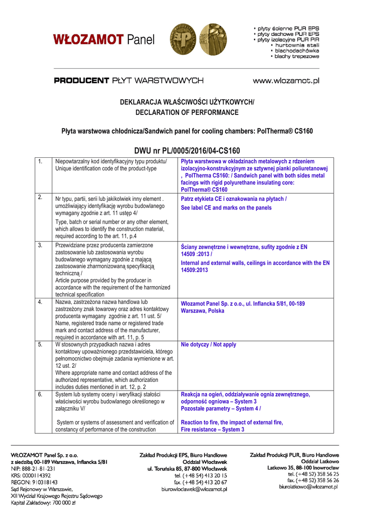DEKLARACJA WŁAŚCIWOŚCI UŻYTKOWYCH/ DECLARATION OF PERFORMANCE Płyta warstwowa chłodnicza/Sandwich panel for cooling chambers: PolTherma® CS160 DWU nr PL/0005/2016/04-CS160 1. Niepowtarzalny kod identyfikacyjny typu produktu/ Unique identification code of the product-type Płyta warstwowa w okładzinach metalowych z rdzeniem izolacyjno-konstrukcyjnym ze sztywnej pianki poliuretanowej , PolTherma CS160: / Sandwich panel with both sides metal facings with rigid polyurethane insulating core: PolTherma® CS160 2. Nr typu, partii, serii lub jakikolwiek inny element . umożliwiający identyfikację wyrobu budowlanego wymagany zgodnie z art. 11 ustęp 4/ Type, batch or serial number or any other element, which allows to identify the construction material, required according to the art. 11, p.4 Przewidziane przez producenta zamierzone zastosowanie lub zastosowania wyrobu budowlanego wymagany zgodnie z mającą zastosowanie zharmonizowaną specyfikacją techniczną / Article purpose provided by the producer in accordance with the requirement of the harmonized technical specification Nazwa, zastrzeżona nazwa handlowa lub zastrzeżony znak towarowy oraz adres kontaktowy producenta wymagany zgodnie z art. 11 ust. 5/ Name, registered trade name or registered trade mark and contact address of the manufacturer, required in accordance with art. 11, p. 5 W stosownych przypadkach nazwa i adres kontaktowy upoważnionego przedstawiciela, którego pełnomocnictwo obejmuje zadania wymienione w art. 12 ust. 2/ Where appropriate name and contact address of the authorized representative, which authorization includes duties mentioned in art. 12, p. 2 System lub systemy oceny i weryfikacji stałości właściwości wyrobu budowlanego określonego w załączniku V/ Patrz etykieta CE i oznakowania na płytach / See label CE and marks on the panels System or systems of assessment and verification of constancy of performance of the construction Reaction to fire, the impact of external fire, Fire resistance – System 3 3. 4. 5. 6. Ściany zewnętrzne i wewnętrzne, sufity zgodnie z EN 14509 :2013 / Internal and external walls, ceilings in accordance with the EN 14509:2013 Włozamot Panel Sp. z o.o., ul. Inflancka 5/81, 00-189 Warszawa, Polska Nie dotyczy / Not apply Reakcja na ogień, oddziaływanie ognia zewnętrznego, odporność ogniowa – System 3 Pozostałe parametry – System 4 / product, specified in the attachment V Other parameters – System 4 7. W przypadku deklaracji właściwości użytkowych dotyczącej wyrobu budowlanego objętego normą zharmonizowaną/ In case of the declaration of performance concerning a construction product covered by a harmonized standard EN 14509:2013 Jednostka notyfikowana ITB Warszawa nr notyfikacji 1488 Jednostka notyfikowana FIRES s.r.o. nr notyfikacji 1396/ EN 14509:2013 The notified body ITB Warszawa nr notification 1488 The notified body FIRES s.r.o. nr notification 1396 8. W przypadku deklaracji właściwości użytkowych dotyczącej wyrobu budowlanego dla którego została wydana Europejską Ocenę Techniczną / In case of the declaration of performance concerning a construction product for which a European Technical Assessment has been issued Deklarowane właściwości użytkowe/ Declared properties Nie dotyczy/ Not apply 9. Techniczne właściwości wyrobu w odniesieniu do jego konfiguracji oraz do wymagań rozporządzenia CPR 305/2011 i normy zharmonizowanej EN 14509:2013 są dostępne w załączniku do dokumentów dostawy / The technical properties of the product with respect to its configuration and the requirements of ordinance CPR 305/2011 and the harmonized standard EN 14509:2013, are provided as an attachment to the delivery documents W przypadku gdy na podstawie art. 37 lub 38 została zastosowana specjalna dokumentacja techniczna, wymagania, z którymi wyrób jest zgodny: Nie dotyczy / In case when the special technical documentation was applied on the basis of art. 37 or 38, requirements with which the product conforms: Not apply 10. Właściwości użytkowe wyrobu określone w pkt. 1 i 2 są zgodne z właściwościami użytkowymi deklarowanymi w pkt. 9 / The performance of the product identified in points 1 and 2 is in conformity with the declared performance in point 9. Niniejsza deklaracja właściwości użytkowych jest wydana na wyłączną odpowiedzialność producenta określonego w pkt. 4./ This declaration of performance is issued under the sole responsibility of the manufacturer identified in point 4. W imieniu producenta podpisał: Janusz Szczepański, PREZES ZARZĄDU (Imię i nazwisko; stanowisko) WŁOCŁAWEK, 01-04-2016 (Miejsce i data wydania) ………………………………… (podpis)