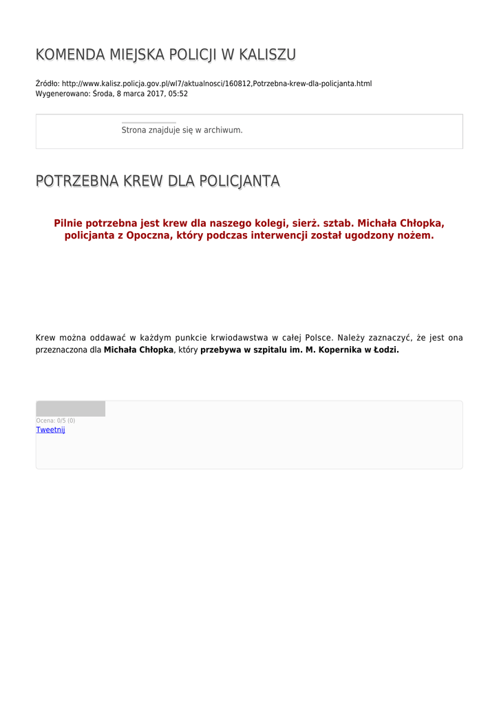 KOMENDA MIEJSKA POLICJI W KALISZU Źródło: http://www.kalisz.policja.gov.pl/wl7/aktualnosci/160812,Potrzebna-krew-dla-policjanta.html Wygenerowano: Środa, 8 marca 2017, 05:52 Strona znajduje się w archiwum. POTRZEBNA KREW DLA POLICJANTA Pilnie potrzebna jest krew dla naszego kolegi, sierż. sztab. Michała Chłopka, policjanta z Opoczna, który podczas interwencji został ugodzony nożem. Krew można oddawać w każdym punkcie krwiodawstwa w całej Polsce. Należy zaznaczyć, że jest ona przeznaczona dla Michała Chłopka, który przebywa w szpitalu im. M. Kopernika w Łodzi. Ocena: 0/5 (0) Tweetnij