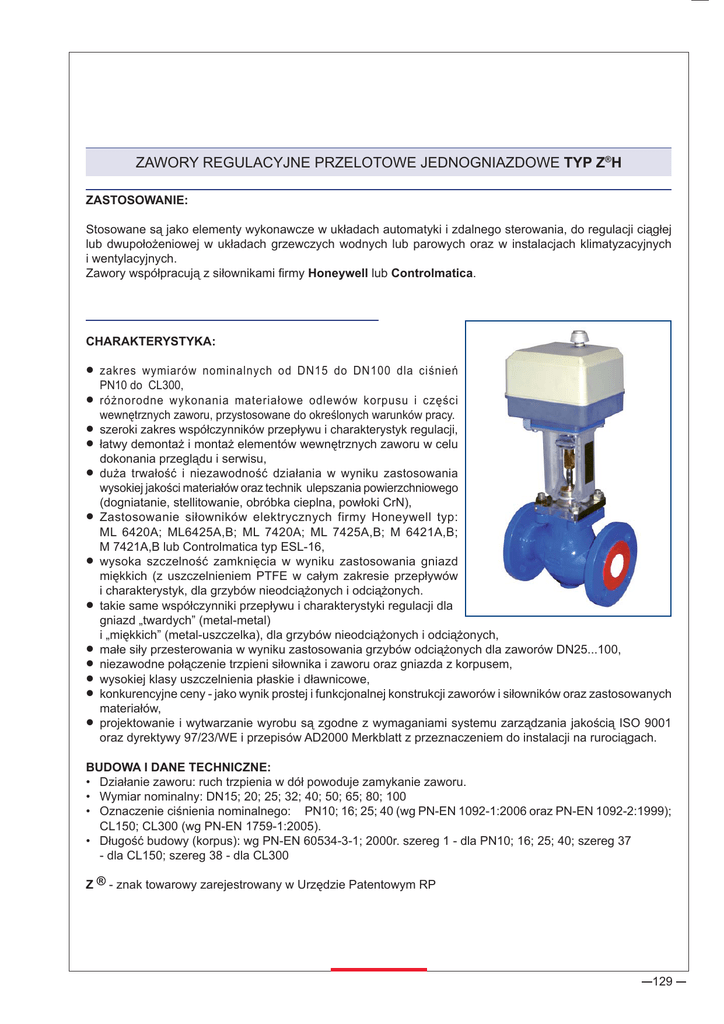ZAWORY REGULACYJNE PRZELOTOWE JEDNOGNIAZDOWE TYP Z®H ZASTOSOWANIE: Stosowane są jako elementy wykonawcze w układach automatyki i zdalnego sterowania, do regulacji ciągłej lub dwupołożeniowej w układach grzewczych wodnych lub parowych oraz w instalacjach klimatyzacyjnych i wentylacyjnych. Zawory współpracują z siłownikami firmy Honeywell lub Controlmatica. CHARAKTERYSTYKA: • • • • • • • • • • • • • zakres wymiarów nominalnych od DN15 do DN100 dla ciśnień PN10 do CL300, różnorodne wykonania materiałowe odlewów korpusu i części wewnętrznych zaworu, przystosowane do określonych warunków pracy. szeroki zakres współczynników przepływu i charakterystyk regulacji, łatwy demontaż i montaż elementów wewnętrznych zaworu w celu dokonania przeglądu i serwisu, duża trwałość i niezawodność działania w wyniku zastosowania wysokiej jakości materiałów oraz technik ulepszania powierzchniowego (dogniatanie, stellitowanie, obróbka cieplna, powłoki CrN), Zastosowanie siłowników elektrycznych firmy Honeywell typ: ML 6420A; ML6425A,B; ML 7420A; ML 7425A,B; M 6421A,B; M 7421A,B lub Controlmatica typ ESL-16, wysoka szczelność zamknięcia w wyniku zastosowania gniazd miękkich (z uszczelnieniem PTFE w całym zakresie przepływów i charakterystyk, dla grzybów nieodciążonych i odciążonych. takie same współczynniki przepływu i charakterystyki regulacji dla gniazd „twardych” (metal-metal) i „miękkich” (metal-uszczelka), dla grzybów nieodciążonych i odciążonych, małe siły przesterowania w wyniku zastosowania grzybów odciążonych dla zaworów DN25...100, niezawodne połączenie trzpieni siłownika i zaworu oraz gniazda z korpusem, wysokiej klasy uszczelnienia płaskie i dławnicowe, konkurencyjne ceny - jako wynik prostej i funkcjonalnej konstrukcji zaworów i siłowników oraz zastosowanych materiałów, projektowanie i wytwarzanie wyrobu są zgodne z wymaganiami systemu zarządzania jakością ISO 9001 oraz dyrektywy 97/23/WE i przepisów AD2000 Merkblatt z przeznaczeniem do instalacji na rurociągach. BUDOWA I DANE TECHNICZNE: • Działanie zaworu: ruch trzpienia w dół powoduje zamykanie zaworu. • Wymiar nominalny: DN15; 20; 25; 32; 40; 50; 65; 80; 100 • Oznaczenie ciśnienia nominalnego: PN10; 16; 25; 40 (wg PN-EN 1092-1:2006 oraz PN-EN 1092-2:1999); CL150; CL300 (wg PN-EN 1759-1:2005). • Długość budowy (korpus): wg PN-EN 60534-3-1; 2000r. szereg 1 - dla PN10; 16; 25; 40; szereg 37 - dla CL150; szereg 38 - dla CL300 Z ® - znak towarowy zarejestrowany w Urzędzie Patentowym RP 129 Korpus : kołnierzowy, odlewany z żeliw EN-GJL 250 (EN-JL 1040); EN-GJS 400-18 LT (EN-JS 1025) lub staliw GP 240 GH (1.0619); G20Mn5 (1.6220); GX5CrNiMo 19-11-2 (1.4408). Dopuszczalne nadciśnienie robocze dla materiałów przy odpowiednich temperaturach podano w karcie katalogowej zaworów regulacyjnych typ „Z®” Dławnica: nieodlewana , mocowana do korpusu za pośrednictwem płyty łączącej. Grzyb: profilowy, nieodciążony lub odciążony; materiał: stal kwasoodporna lub stal przeznaczona do ulepszania cieplnego; regulacyjność: 50:1. Charakterystyka regulacji: liniowa (L); stałoprocentowa (P); szybkootwierająca (S). Gniazdo: wkręcane, ze stożkiem centrującym, uszczelniającym i zabezpieczającym przed odkręceniem: twarde lub miękkie (z uszczelnieniem PTFE). Szczelność zamknięcia: - podstawowa: IV klasa wg PN-EN 60534-4 - gniazdo twarde - pęcherzykowa: VI klasa wg PN-EN 60534-4 - gniazdo miękkie Trzpień: dogniatany lub ulepszony cieplnie i polerowany na powierzchni kontaktu z uszczelnieniem. Korek: stalowy lub kwasoodporny: umożliwia oczyszczenie wnętrza korpusu (dostarczany na życzenie). Uszczelnienia: bezazbestowe: płaskie - aramidowo - grafitowe; z grafitu wzmocnionego ; w osłonie metalowej (1.4571); dławnicowe: - pakiet uszczelniający PTFE-V ze sprężyną dociskową. Temperatura czynnika: max 260°C (PTFE). DOPUSZCZALNE SPADKI CIŚNIENIA Δp. Spadki ciśnienia Δp [bar] dotyczą zaworu zamkniętego i wyliczone są ze względu na możliwości napędu zaworu, napływ czynnika pod grzyb zaworu. Rzeczywiste spadki ciśnienia nie powinny przekraczać 70% wartości dopuszczalnego ciśnienia roboczego dla danego ciśnienia nominalnego, wykonania materiałowego i temperatury roboczej. Tablica 1. Dopuszczalne spadki ciśnienia Δp [bar]. Si³a [N] Si³ownik do 4 6,3 10 16 Kvs [m 3 / h] 25 40 63 94 125; 160 - - - - Grzyby nieodci¹¿one ciœnieniowo (T / PTFE ) ML 6420A; ML 6425A,B ML 7420A; ML 7425A,B ESL-16-00; ESL-16-01 600 30 / 23 10 / 3 9/- 4/- 1,2 / - ESL-16-06; ESL-16-07 1000 40 / 35 24 / 17 20 / 15 12 / 8 6 / 2,5 2/- M 6421A,B; M 7421A,B 1800 40 / 35 40 / 35 40 / 35 28 / 22 16 / 12 8/5 5/2 2/1 - - - - - 40 / 35 40 / 35 40 / - Grzyby odci¹¿one ciœnieniowo (T / PTFE ) ML 6420A; ML 6425A,B ML 7420A; ML 7425A,B ESL-16-00; ESL-16-01 600 - - 40 / 35 40 / - 40 / - ESL-16-06; ESL-16-07 1000 - - 40 / 35 40 / 35 40 / 35 40 / - M 6421A,B; M 7421A,B 1800 - - 40 / 35 40 / 35 40 / 35 40 / 35 T - gniazdo twarde; PTFE - gniazdo miękkie Tablica 2. Współpracujące siłowniki. ML 6420A 24V AC lub 230V AC ML 6425A HONEYWELL ML 6425A Napiêcie zasilania 600 ML 7420A 24V AC ML 7425A,B M 6421A M 6421B M 7421A M 7421B 24V AC lub 230V AC 1800 24V AC Sprê¿yna zwrotna - - A - - B - - A B - - Skok [mm] Sygna³ steruj¹cy Si³a [N] Sterowanie 3 pkt. - - 38 - - 20 - - 38 B - otwiera zawór Szczegółowe informacje dotyczące siłowników można uzyskać na stronie domowej producenta: firma HONEYWELL www.honeywell.com.pl firma CONTROLMATICA www.controlmatica.com.pl. 3 pkt., z nadajnikiem 4-20 mA. 0(2)…10V DC; 0(4)…20mA DC ESL-16-00-00-01-1-1-02 3 pkt., bez nadajnika po³o¿. ESL-16-01-00-01-1-1-01 IP 54 0…10V DC lub 2…10V DC 24V AC ESL-16-00-00-01-3-1-01 ESL-16-00-00-01-3-1-02 Sterowanie 3 pkt. Sygna³ steruj¹cy 230V AC 3 pkt., z nadajnikiem 4-20 mA. 3 pkt., bez nadajnika po³o¿. 24V AC 3 pkt., z nadajnik