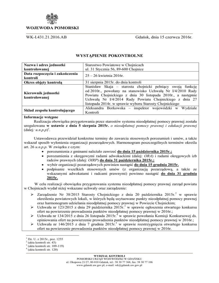 WOJEWODA POMORSKI Gdańsk, dnia 15 czerwca 2016r. WK-I.431.21.2016.AB WYSTĄPIENIE POKONTROLNE Nazwa i adres jednostki kontrolowanej Data rozpoczęcia i zakończenia kontroli Okres objęty kontrolą Kierownik jednostki kontrolowanej Skład zespołu kontrolującego Starostwo Powiatowe w Chojnicach ul. 31 Stycznia 56, 89-600 Chojnice 25 – 26 kwietnia 2016r. 31 sierpnia 2015r. do dnia kontroli Stanisław Skaja – starosta chojnicki pełniący swoją funkcję od 2010r., powołany na stanowisko Uchwałą Nr I/4/2010 Rady Powiatu Chojnickiego z dnia 30 listopada 2010r., a następnie Uchwałą Nr I/4/2014 Rady Powiatu Chojnickiego z dnia 27 listopada 2014r. w sprawie wyboru Starosty Chojnickiego Aleksandra Borkowska – inspektor wojewódzki w Wydziale Kontroli Informacje wstępne Realizacja obowiązku przygotowania przez starostów systemu nieodpłatnej pomocy prawnej została uregulowana w ustawie z dnia 5 sierpnia 2015r. o nieodpłatnej pomocy prawnej i edukacji prawnej (dalej: u.n.p.p)1. Ustawodawca przewidział konkretne terminy do zawarcia stosownych porozumień i umów, a także wskazał sposób wyłonienia organizacji pozarządowych. Harmonogram poszczególnych terminów określa art. 26 u.n.p.p. W związku z czym: porozumienia z gminami należało zawrzeć do dnia 15 października 2015r.; porozumienia z okręgowymi radami adwokackimi (dalej: ORA) i radami okręgowych izb radców prawnych (dalej: OIRP) do dnia 31 października 2015r.; wybór organizacji pozarządowych powinien nastąpić do dnia 15 grudnia 2015r. podpisanie wszelkich stosownych umów (z organizacją pozarządową, a także ze wskazanymi adwokatami i radcami prawnymi) powinno nastąpić do dnia 31 grudnia 2015r. W celu realizacji obowiązku przygotowania systemu nieodpłatnej pomocy prawnej zarząd powiatu w Chojnicach wydał niżej wskazane uchwały oraz zarządzenie: Zarządzenie Nr 38/2015 Starosty Chojnickiego z dnia 20 października 2015r.2 w sprawie określenia powiatowych lokali, w których będą usytuowane punkty nieodpłatnej pomocy prawnej oraz harmonogram udzielania nieodpłatnej pomocy prawnej w Powiecie Chojnickim; Uchwała nr 123/2015 z dnia 29 października 2015r.3 w sprawie ogłoszenia otwartego konkursu ofert na powierzenie prowadzenia punktów nieodpłatnej pomocy prawnej w 2016r.; Uchwała nr 134/2015 z dnia 26 listopada 2015r.4 w sprawie powołania Komisji Konkursowej ds. opiniowania ofert na powierzenie prowadzenia punktów nieodpłatnej pomocy prawnej w 2016r.; Uchwała nr 146/2015 z dnia 7 grudnia 2015r.5 w sprawie rozstrzygnięcia otwartego konkursu ofert na powierzenie prowadzenia punktów nieodpłatnej pomocy prawnej w 2016r. 1 Dz. U. z 2015r., poz. 1255 (akta kontroli str. 43) 3 (akta kontroli str. 109-119) 4 (akta kontroli str. 120) 2 WYDZIAŁ KONTROLI POMORSKI URZĄD WOJEWÓDZKI W GDAŃSKU ul. Okopowa 21/27, 80-810 Gdańsk, tel.: 58 30 77 368, fax: 58 30 77 106 www.gdansk.uw.gov.pl, e-mail: [email protected] Ocena kontrolowanej działalności Ustalenia pozytywna z nieprawidłowościami Ocenę uzasadniają poniżej opisane ustalenia oraz stwierdzone nieprawidłowości, które z punktu widzenia kryteriów kontroli są nielegalne, jednakże nie miały one zasadniczego wpływu na kontrolowaną działalność i polegały na: braku w umowie zawartej pomiędzy powiatem a organizacją pozarządową zasady zapewniania przez osoby udzielające pomocy prawnej zastępstwa, w przypadku gdy nie będą one w stanie osobiście udzielać nieodpłatnej pomocy prawnej, o której mowa w art. 6 ust. 2 pkt 6 w zw. z art. 11 ust. 7 u.n.p.p.; wskazaniu ogólnego harmonogramu, w wymiarze 5 dni w tygodniu po 4 godziny dziennie, w porozumieniach z gminami oraz Zarządzeniu Nr 38/2015 Starosty Chojnickiego z dnia 20 października 2015r. w sprawie określenia powiatowych lokali, w których będą usytuowane punkty nieodpłatnej pomocy prawnej oraz harmonogramu udzielania nieodpłatnej pomocy prawnej w Powiecie Chojnickim. Na podstawie dokumentacji przedłożonej podczas kontroli dokonano sprawdzenia prawidłowości podjętych przygotowań przez Starostwo Powiatowe w Chojnicach w celu realizacji świadczenia oraz funkcjonowania systemu nieodpłatnej pomocy prawnej na terenie powiatu chojnickiego. Ustawa z dnia 5 sierpnia 2015r. o nieodpłatnej pomocy prawnej oraz edukacji prawnej nałożyła na powiat chojnicki obowiązek utworzenia czterech punktów nieodpłatnej pomocy prawnej. Liczba punktów przypadająca na dany powiat określona została przez mnożnik zdefiniowany w art. 20 ust. 4 u.n.p.p.6. Zgodnie z powyższym powiat chojnicki zobowiązany był uruchomić cztery punkty, dwa punkty prowadzone samodzielnie, w których pomoc prawną świadczyć będą adwokaci i radcowie prawni. Natomiast kolejne dwa, stosownie do art. 11 u.n.p.p., powiat powierzyć powinien wyłonionym w otwartym konkursie ofert organizacjom pozarządowym prowadzącym działalność pożytku publicznego. Ustalenia dokonane podczas kontroli wykazały, że w otwartym konkursie ofert na powierzenie prowadzenia punktów nieodpłatnej pomocy prawnej w 2016r. wyłoniono 2 organizacje pozarządowe. Jednakże z przyczyn niezależnych od powiatu z jedną z nich nie została podpisana umowa. W związku z powyższym 3 punkty świadczące nieodpłatną pomoc prawną prowadzone są przez powiat samodzielnie, natomiast jeden przez organizację. Procedura podejmowania czynności w przypadku punktów prowadzonych przez adwokatów i radców prawnych: Ustalono, że zgodnie z art. 26 ust. 2 u.n.p.p. w sprawie punktów, w których nieodpłatnej pomocy prawnej będą udzielać adwokaci i radcowie prawni, w dniu 30 października 2015r. zawarto porozumienie pomiędzy powiatem chojnickim reprezentowanym przez zarząd powiatu chojnickiego a Okręgową Izbą Radców Prawnych w Bydgoszczy (dalej OIRP) i Okręgową Radą Adwokacką w Bydgoszczy (dalej: ORA)7. Porozumienie z OIRP oraz ORA zawiera wszystkie wymagane ustawowo elementy zgodnie z art. 10 u.n.p.p,. tj. określe