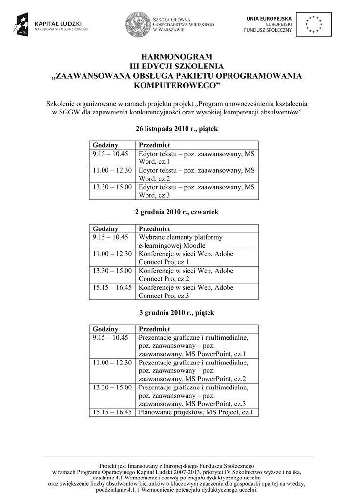HARMONOGRAM III EDYCJI SZKOLENIA „ZAAWANSOWANA OBSŁUGA PAKIETU OPROGRAMOWANIA KOMPUTEROWEGO” Szkolenie organizowane w ramach projektu projekt „Program unowocześnienia kształcenia w SGGW dla zapewnienia konkurencyjności oraz wysokiej kompetencji absolwentów” 26 listopada 2010 r., piątek Godziny 9.15 – 10.45 Przedmiot Edytor tekstu – poz. zaawansowany, MS Word, cz.1 11.00 – 12.30 Edytor tekstu – poz. zaawansowany, MS Word, cz.2 13.30 – 15.00 Edytor tekstu – poz. zaawansowany, MS Word, cz.3 2 grudnia 2010 r., czwartek Godziny 9.15 – 10.45 Przedmiot Wybrane elementy platformy e-learningowej Moodle 11.00 – 12.30 Konferencje w sieci Web, Adobe Connect Pro, cz.1 13.30 – 15.00 Konferencje w sieci Web, Adobe Connect Pro, cz.2 15.15 – 16.45 Konferencje w sieci Web, Adobe Connect Pro, cz.3 3 grudnia 2010 r., piątek Godziny 9.15 – 10.45 Przedmiot Prezentacje graficzne i multimedialne, poz. zaawansowany – poz. zaawansowany, MS PowerPoint, cz.1 11.00 – 12.30 Prezentacje graficzne i multimedialne, poz. zaawansowany – poz. zaawansowany, MS PowerPoint, cz.2 13.30 – 15.00 Prezentacje graficzne i multimedialne, poz. zaawansowany – poz. zaawansowany, MS PowerPoint, cz.3 15.15 – 16.45 Planowanie projektów, MS Project, cz.1 Projekt jest finansowany z Europejskiego Funduszu Społecznego w ramach Programu Operacyjnego Kapitał Ludzki 2007-2013, priorytet IV Szkolnictwo wyższe i nauka, działanie 4.1 Wzmocnienie i rozwój potencjału dydaktycznego uczelni oraz zwiększenie liczby absolwentów kierunków o kluczowym znaczeniu dla gospodarki opartej na wiedzy, poddziałanie 4.1.1 Wzmocnienie potencjału dydaktycznego uczelni. 9 grudnia 2010 r., czwartek Godziny 9.15 – 10.45 Przedmiot Arkusz kalkulacyjny – poz. zaawansowany, MS Excel, cz.1 11.00 – 12.30 Arkusz kalkulacyjny – poz. zaawansowany, MS Excel, cz.2 13.30 – 15.00 Arkusz kalkulacyjny – poz. zaawansowany, MS Excel, cz.3 15.15 – 16.45 Arkusz kalkulacyjny – poz. zaawansowany, MS Excel, cz.4 10 grudnia 2010 r., piątek Godziny 9.15 – 10.45 Przedmiot Arkusz kalkulacyjny – poz. zaawansowany, MS Excel, cz.5 11.00 – 12.30 Arkusz kalkulacyjny – poz. zaawansowany, MS Excel, cz.6 13.30 – 15.00 Arkusz kalkulacyjny – poz. zaawansowany, MS Excel, cz.7 15.15 – 16.45 Baza danych – poz. zaawansowany, MS Access, cz.1 16 grudnia 2009 r., czwartek Godziny 9.15 – 10.45 11.00 – 12.30 13.30 – 15.00 Przedmiot Planowanie projektów, MS Project, cz.2 Planowanie projektów, MS Project, cz.3 Baza danych – poz. zaawansowany, MS Access, cz.2 15.15 – 16.45 Baza danych – poz. zaawansowany, MS Access, cz.3 17 grudnia 2009 r., piątek Godziny 9.15 – 10.45 Przedmiot Baza danych – poz. zaawansowany, MS Access, cz.4 11.00 – 12.30 Baza danych – poz. zaawansowany, MS Access, cz.5 13.30 – 15.00 Baza danych – poz. zaawansowany, MS Access, cz.6 15.15 – 16.45 Baza danych – poz. zaawansowany, MS Access, cz.7 Projekt jest finansowany z Europejskiego Funduszu Społecznego w ramach Programu Operacyjnego Kapitał Ludzki 2007-2013, priorytet IV Szkolnictwo wyższe i nauka, działanie 4.1 Wzmocnienie i rozwój potencjału dydaktycznego uczelni oraz zwiększenie liczby absolwentów kierunków o kluczowym znaczeniu dla gospodarki opartej na wiedzy, poddziałanie 4.1.1 Wzmocnienie potencjału dydaktycznego uczelni.