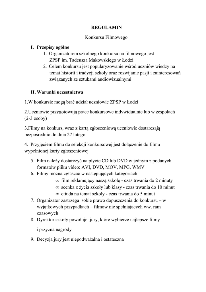 REGULAMIN Konkursu Filmowego I. Przepisy ogólne 1. Organizatorem szkolnego konkursu na filmowego jest ZPSP im. Tadeusza Makowskiego w Łodzi 2. Celem konkursu jest popularyzowanie wśród uczniów wiedzy na temat historii i tradycji szkoły oraz rozwijanie pasji i zainteresowań związanych ze sztukami audiowizualnymi II. Warunki uczestnictwa 1.W konkursie mogą brać udział uczniowie ZPSP w Łodzi 2.Uczniowie przygotowują prace konkursowe indywidualnie lub w zespołach (2-3 osoby) 3.Filmy na konkurs, wraz z kartą zgłoszeniową uczniowie dostarczają bezpośrednio do dnia 27 lutego 4. Przyjęciem filmu do selekcji konkursowej jest dołączenie do filmu wypełnionej karty zgłoszeniowej 5. Film należy dostarczyć na płycie CD lub DVD w jednym z podanych formatów pliku video: AVI, DVD, MOV, MPG, WMV 6. Filmy można zgłaszać w następujących kategoriach • film reklamujący naszą szkołę - czas trwania do 2 minuty • scenka z życia szkoły lub klasy - czas trwania do 10 minut • etiuda na temat szkoły - czas trwania do 5 minut 7. Organizator zastrzega sobie prawo dopuszczenia do konkursu – w wyjątkowych przypadkach – filmów nie spełniających ww. ram czasowych 8. Dyrektor szkoły powołuje jury, które wybierze najlepsze filmy i przyzna nagrody 9. Decyzja jury jest niepodważalna i ostateczna III. Nagrody 1. Laureaci konkursu otrzymają nagrody rzeczowe. O sposobie rozdzielenia nagród decyduje Jury konkursu IV. Terminy 1. Filmy na konkurs, wraz z kartą zgłoszeniową uczniowie dostarczają bezpośrednio do dnia 27 lutego u komisarza konkursu. 2. Rozstrzygnięcie nastąpi 13 marca V. Postanowienia końcowe 1. Organizator zastrzega sobie prawo do wykorzystania nadesłanych prac do celów reklamowych i promocyjnych związanych z działalnością ZPSP w Łodzi 2. Zgłoszenie do konkursu jest jednoznaczne z akceptacją niniejszego regulaminu 3. W sprawach nieujętych w regulaminie decyduje organizator konkursu