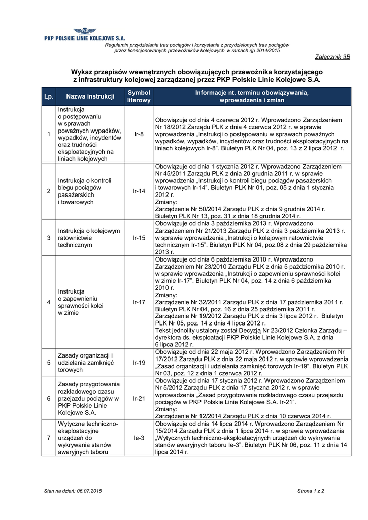 Regulamin przydzielania tras pociągów i korzystania z przydzielonych tras pociągów przez licencjonowanych przewoźników kolejowych w ramach rjp 2014/2015 Załącznik 3B Wykaz przepisów wewnętrznych obowiązujących przewoźnika korzystającego z infrastruktury kolejowej zarządzanej przez PKP Polskie Linie Kolejowe S.A. Lp. Nazwa instrukcji 1 Instrukcja o postępowaniu w sprawach poważnych wypadków, wypadków, incydentów oraz trudności eksploatacyjnych na liniach kolejowych Symbol literowy Informacje nt. terminu obowiązywania, wprowadzenia i zmian Ir-8 Obowiązuje od dnia 4 czerwca 2012 r. Wprowadzono Zarządzeniem Nr 18/2012 Zarządu PLK z dnia 4 czerwca 2012 r. w sprawie wprowadzenia „Instrukcji o postępowaniu w sprawach poważnych wypadków, wypadków, incydentów oraz trudności eksploatacyjnych na liniach kolejowych Ir-8”. Biuletyn PLK Nr 04, poz. 13 z 2 lipca 2012 r. 2 Instrukcja o kontroli biegu pociągów pasażerskich i towarowych Ir-14 3 Instrukcja o kolejowym ratownictwie technicznym Ir-15 4 Instrukcja o zapewnieniu sprawności kolei w zimie Ir-17 5 Zasady organizacji i udzielania zamknięć torowych Ir-19 6 Zasady przygotowania rozkładowego czasu przejazdu pociągów w PKP Polskie Linie Kolejowe S.A. Ir-21 7 Wytyczne technicznoeksploatacyjne urządzeń do wykrywania stanów awaryjnych taboru Ie-3 Stan na dzień: 06.07.2015 Obowiązuje od dnia 1 stycznia 2012 r. Wprowadzono Zarządzeniem Nr 45/2011 Zarządu PLK z dnia 20 grudnia 2011 r. w sprawie wprowadzenia „Instrukcji o kontroli biegu pociągów pasażerskich i towarowych Ir-14”. Biuletyn PLK Nr 01, poz. 05 z dnia 1 stycznia 2012 r. Zmiany: Zarządzenie Nr 50/2014 Zarządu PLK z dnia 9 grudnia 2014 r. Biuletyn PLK Nr 13, poz. 31 z dnia 18 grudnia 2014 r. Obowiązuje od dnia 3 października 2013 r. Wprowadzono Zarządzeniem Nr 21/2013 Zarządu PLK z dnia 3 października 2013 r. w sprawie wprowadzenia „Instrukcji o kolejowym ratownictwie technicznym Ir-15”. Biuletyn PLK Nr 04, poz.08 z dnia 29 października 2013 r. Obowiązuje od dnia 6 października 2010 r. Wprowadzono Zarządzeniem Nr 23/2010 Zarządu PLK z dnia 5 października 2010 r. w sprawie wprowadzenia „Instrukcji o zapewnieniu sprawności kolei w zimie Ir-17”. Biuletyn PLK Nr 04, poz. 14 z dnia 6 października 2010 r. Zmiany: Zarządzenie Nr 32/2011 Zarządu PLK z dnia 17 października 2011 r. Biuletyn PLK Nr 04, poz. 16 z dnia 25 października 2011 r. Zarządzenie Nr 19/2012 Zarządu PLK z dnia 3 lipca 2012 r. Biuletyn PLK Nr 05, poz. 14 z dnia 4 lipca 2012 r. Tekst jednolity ustalony został Decyzją Nr 23/2012 Członka Zarządu – dyrektora ds. eksploatacji PKP Polskie Linie Kolejowe S.A. z dnia 6 lipca 2012 r. Obowiązuje od dnia 22 maja 2012 r. Wprowadzono Zarządzeniem Nr 17/2012 Zarządu PLK z dnia 22 maja 2012 r. w sprawie wprowadzenia „Zasad organizacji i udzielania zamknięć torowych Ir-19”. Biuletyn PLK Nr 03, poz. 12 z dnia 1 czerwca 2012 r. Obowiązuje od dnia 17 stycznia 2012 r. Wprowadzono Zarządzeniem Nr 5/2012 Zarządu PLK z dnia 17 styczna 2012 r. w sprawie wprowadzenia „Zasad przygotowania rozkładowego czasu przejazdu pociągów w PKP Polskie Linie Kolejowe S.A. Ir-21”. Zmiany: Zarządzenie Nr 12/2014 Zarządu PLK z dnia 10 czerwca 2014 r. Obowiązuje od dnia 14 lipca 2014 r. Wprowadzono Zarządzeniem Nr 15/2014 Zarządu PLK z dnia 1 lipca 2014 r. w sprawie wprowadzenia „Wytycznych techniczno-eksploatacyjnych urządzeń do wykrywania stanów awaryjnych taboru Ie-3”. Biuletyn PLK Nr 06, poz. 11 z dnia 14 lipca 2014 r. Strona 1 z 2 Regulamin przydzielania tras pociągów i korzystania z przydzielonych tras pociągów przez licencjonowanych przewoźników kolejowych w ramach rjp 2014/2015 Załącznik 3B Lp. Nazwa instrukcji Symbol literowy 8 Instrukcja o organizacji i użytkowaniu sieci radiotelefonicznych Ie-14 (E-36) 9 Warunki techniczne utrzymania nawierzchni na liniach kolejowych Zasady wstępu na obszar kolejowy 10 zarządzany przez PKP Polskie Linie Kolejowe S.A. Zasady organizacji systemu zarządzania kryzysowego w czasie wystąpienia zagrożeń oraz sytuacji kryzysowych na liniach 11 kolejowych zarządzanych przez PKP Polskie Linie Kolejowe S.A. oraz w budynkach i budowlach przeznaczonych do obsługi osób i rzeczy. Zasady monitorowania bieżącej pracy eksploatacyjnoprzewozowej i postępowania w czasie zaistnienia zagrożeń, sytuacji kryzysowych, 12 innych wydarzeń na sieci zarządzanej przez PKP Polskie Linie Kolejowe S.A. oraz w budynkach i budowlach przeznaczonych do obsługi osób i rzeczy. Stan na dzień: 06.07.2015 Id-1 Id-21 Informacje nt. terminu obowiązywania, wprowadzenia i zmian Obowiązuje od dnia 26 maja 2005 r. Wprowadzono Zarządzeniem Nr 22 Zarządu PLK z dnia 27 grudnia 2004 r. w sprawie wprowadzenia „Instrukcji o organizacji i użytkowaniu sieci radiotelefonicznych Ie-14 (E-36)”. Biuletyn PKP S.A. B Nr 5, poz.16 z dnia 12 maja 2005 r. Obowiązuje od dnia 1 sierpnia 2005 r. Wprowadzono Zarządzeniem Nr 14 Zarządu PKP Polskich Linii Kolejowych S.A. z dnia 18 maja 2005 r. w sprawie wprowadzenia „Warunków technicznych utrzymania nawierzchni na liniach kolejowych” Id-1 (D-1). Biuletyn B PKP Polskie Linie Kolejowe S.A. Nr 02, poz.15, z dnia 10 czerwca 2005 r. Obowiązuje od dnia 10 grudnia 2010 r. Wprowadzono Zarządzeniem Nr 27/2010 Zarządu PKP Polskie Linie Kolejowe S.A. z dnia 6 grudnia 2010 r. w sprawie wprowadzenia „Zasad wstępu na obszar kolejowy zarządzany przez PKP Polskie Linie Kolejowe S.A.”. Biuletyn PLK Nr 5, poz. 17 z dnia 10 grudnia 2010 r. Zmiany: Zarządzenie Nr 15/2011 Zarządu PLK z dnia 26 kwietnia 2011 r. Biuletyn PLK Nr 02, poz. 08 z dnia 5 maja 2011 r. Zarządzenie Nr 26/2012 Zarządu PLK z dnia 19 listopada 2012 r. Biuletyn PLK Nr 07, poz. 17 z dnia 22 listopada 2012 r. Zarządzenie Nr 27/2013 Zarządu PLK z dnia 26 listopada 2013 r. Biuletyn PLK Nr 05, poz. 10 z dnia 27 listopada 2013 r. Obowiązuje od dnia 16 czerwca 2015 r. Wprowadzono Uchw