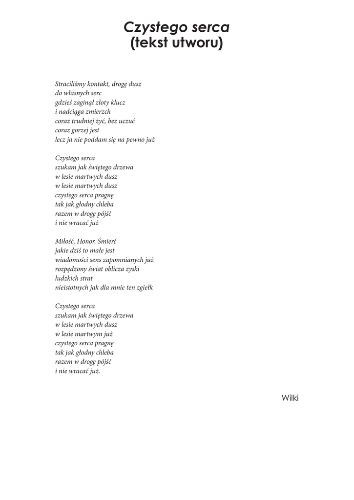 Czystego serca (tekst utworu) Straciliśmy kontakt, drogę dusz do własnych serc gdzieś zaginął złoty klucz i nadciąga zmierzch coraz trudniej żyć, bez uczuć coraz gorzej jest lecz ja nie poddam się na pewno już Czystego serca szukam jak świętego drzewa w lesie martwych dusz w lesie martwych dusz czystego serca pragnę tak jak głodny chleba razem w drogę pójść i nie wracać już Miłość, Honor, Śmierć jakie dziś to małe jest wiadomości sens zapomnianych już rozpędzony świat oblicza zyski ludzkich strat nieistotnych jak dla mnie ten zgiełk Czystego serca szukam jak świętego drzewa w lesie martwych dusz w lesie martwym już czystego serca pragnę tak jak głodny chleba razem w drogę pójść i nie wracać już. Wilki