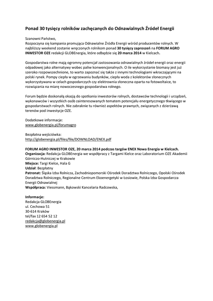 Ponad 30 tysi cy rolników zach canych do Odnawialnych róde Energii Szanowni Pa stwo, Rozpoczyna si kampania promuj ca Odnawialne ród a Energii w ród producentów rolnych. W najbli szy weekend zostanie wr czonych rolnikom ponad 30 tysi cy zaprosze na FORUM AGRO INWESTOR OZE redakcji GLOBEnergia, które odb dzie si 20 marca 2014 w Kielcach. Gospodarstwa rolne maj ogromny potencja zastosowania odnawialnych róde energii oraz energii odpadowej jako alternatywy wobec paliw konwencjonalnych. O ile wykorzystanie biomasy jest ju szeroko rozpowszechnione, to warto zapozna si tak e z innymi technologiami wkraczaj cymi na polski rynek. Pompy ciep a w ogrzewaniu budynków, ciep a woda z kolektorów s onecznych wykorzystywana w celach gospodarczych czy elektrownia s oneczna oparta na fotowoltaice, to rozwi zania na miar nowoczesnego gospodarstwa rolnego. Forum b dzie doskona okazj do spotkania inwestorów rolnych, dostawców technologii i urz dze , wykonawców i wszystkich osób zainteresowanych tematem potencja u energetycznego tkwi cego w gospodarstwach rolnych. Nie zabraknie tu równie aspektów prawnych, zwi zanych z dzier aw terenów pod inwestycje OZE. Dodatkowe informacje: www.globenergia.pl/forumagro Bezp atna wej ciówka: http://globenergia.pl/files/file/DOWNLOAD/ENEX.pdf FORUM AGRO INWESTOR OZE, 20 marca 2014 podczas targów ENEX Nowa Energia w Kielcach. Organizacja: Redakcja GLOBEnergia we wspó pracy z Targami Kielce oraz Laboratorium OZE Akademii Górniczo-Hutniczej w Krakowie Miejsce: Targi Kielce, Hala G Udzia : Bezp atny Patronat: ska Izba Rolnicza, Zachodniopomorski O rodek Doradztwa Rolniczego, Opolski O rodek Doradztwa Rolniczego, Regionalne Centrum Ekoenergetyki w osiowie, Polska Izba Gospodarcza Energii Odnawialnej Wspó praca: Viessmann, B kowski Kancelaria Radcowska, Informacje: Redakcja GLOBEnergia ul. Cechowa 51 30-614 Kraków tel/fax 12 654 52 12 [email protected] www.globenergia.pl