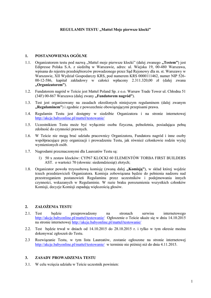 REGULAMIN TESTU „Mattel Moje pierwsze klocki” 1. POSTANOWIENIA OGÓLNE 1.1. Organizatorem testu pod nazwą „Mattel moje pierwsze klocki” (dalej zwanego „Testem”) jest Edipresse Polska S.A. z siedzibą w Warszawie, adres: ul. Wiejska 19, 00-480 Warszawa, wpisana do rejestru przedsiębiorców prowadzonego przez Sąd Rejonowy dla m. st. Warszawy w Warszawie, XII Wydział Gospodarczy KRS, pod numerem KRS 0000111462, numer NIP 52600-12-586, kapitał zakładowy w całości wpłacony 2.311.320,00 zł (dalej zwana „Organizatorem”). 1.2. Fundatorem nagród w Teście jest Mattel Poland Sp. z o.o. Warsaw Trade Tower ul. Chłodna 51 (34F) 00-867 Warszawa (dalej zwany „Fundatorem nagród”). 1.3. Test jest organizowany na zasadach określonych niniejszym regulaminem (dalej zwanym „Regulaminem”) i zgodnie z powszechnie obowiązującymi przepisami prawa. 1.4. Regulamin Testu jest dostępny w siedzibie Organizatora i na stronie internetowej http://akcje.babyonline.pl/mattel/testowanie/ 1.5. Uczestnikiem Testu może być wyłącznie osoba fizyczna, pełnoletnia, posiadająca pełną zdolność do czynności prawnych. 1.6. W Teście nie mogą brać udziału pracownicy Organizatora, Fundatora nagród i inne osoby współpracujące przy organizacji i prowadzeniu Testu, jak również członkowie rodzin wyżej wymienionych osób. 1.7. Nagrodami przeznaczonymi dla Laureatów Testu są: 1) 50 x zestaw klocków: CYP67 KLOCKI 60 ELEMENTÓW TORBA FIRST BUILDERS AST. o wartości 70 (słownie: siedemdziesiąt) złotych; 1.8. Organizator powoła trzyosobową komisję (zwaną dalej „Komisją”), w skład której wejdzie trzech przedstawicieli Organizatora. Komisja zobowiązana będzie do pełnienia nadzoru nad przestrzeganiem postanowień Regulaminu przez uczestników i podejmowania innych czynności, wskazanych w Regulaminie. W razie braku porozumienia wszystkich członków Komisji, decyzje Komisji zapadają większością głosów. 2. ZAŁOŻENIA TESTU 2.1. Test będzie przeprowadzony na stronach serwisu internetowego http://akcje.babyonline.pl/mattel/testowanie/ Ogłoszenie o Teście ukaże się w dniu 14.10.2015 na stronie internetowej http://akcje.babyonline.pl/mattel/testowanie/ 2.2. Test będzie trwał w dniach od 14.10.2015 do 28.10.2015 r. i tylko w tym okresie można dokonywać zgłoszeń do Testu. 2.3 Rozwiązanie Testu, w tym lista Laureatów, zostanie ogłoszone na stronie internetowej http://akcje.babyonline.pl/mattel/testowanie/ w terminie nie później niż do dnia 4.11.2015. 3. ZASADY PROWADZENIA TESTU 3.1. W celu wzięcia udziału w Teście uczestnik powinien: 1 1) zarejestrować się na stronie internetowej http://akcje.babyonline.pl/mattel/testowanie/ 2) wypełnić formularz zgłoszeniowy znajdujący się na stronie internetowej http://akcje.babyonline.pl/mattel/testowanie/ w tym złożyć stosowne oświadczenia i udzielić stosownych zgód stanowiących integralną część formularza zgłoszeniowego; 3) udzielić odpowiedzi na znajdujące się w formularzu zgłoszeniowym pytanie otwarte: dlaczego chciała byś przetestować klocki Mega Bloks First Builders? (dalej zwanej „Odpowiedzią”); 4) przesłać formularz zgłoszeniowy do Organizatora za pomocą znajdującego się na dole formularza przycisku „Wyślij”; 3.2. Jeden uczestnik może wziąć udział w Teście tylko jeden raz. 3.3. Spośród wszystkich poprawnie przesłanych Odpowiedzi na pytanie otwarte, Komisja wybierze 50 najlepszych Odpowiedzi. Przy wyborze najlepszych Odpowiedzi Komisja będzie się kierować własnym uznaniem, biorąc pod uwagę walory artystyczne Odpowiedzi, w szczególności oryginalność i pomysłowość uczestnika – autora Odpowiedzi oraz wypełnienie ankiety zgłoszeniowej. Nie ma znaczenia kolejność zgłoszeń. 3.4. Laureatami Testu w liczbie 50 zostaną uczestnicy, których Odpowiedzi na pytanie otwarte zostaną uznane przez Komisję za najlepsze zgodnie z pkt 3.4 powyżej, zwani dalej „Laureatami”. Nagrody zostaną przyznana po spełnieniu warunków określonych w Regulaminie. 3.5. Uczestnik oświdcza, że Odpowiedź na pytanie otwarte jest unikalną treścią, stworzoną przez niego specjalnie w celu wzięcia udziału w Teście, jak również, że nie jest publikowana w innych serwisach internetowych. 3.6. Do dnia 15.11.2015 r. Laureaci Testu otrzymają prywatną wiadomość email z linkiem do ankiety wynikowej, którą zobowiązani są wypełnić do dnia 21.11.2015 r. (zwanej dalej „Ankietą Wynikową”). 3.7. Uczestnik niniejszym oświadcza, że: (i) jest jedynym autorem Odpowiedzi zgłoszonej przez niego do Testu; (ii) Odpowiedź nie narusza praw osób trzecich; (iii) w przypadku, jeżeli Odpowiedź stanowi utwór, w rozumieniu ustawy z dnia 4 lutego 1994 r. o prawie autorskim i prawach pokrewnych, przysługują mu autorskie prawa majątkowe do Odpowiedzi, w zakresie niezbędnym do udzielenia licencji, zgodnie z pkt 3.8 poniżej; (iv) Odpowiedź nie stanowi opracowania w rozumieniu ustawy z dnia 4 lutego 1994 r. o prawie autorskim i prawach pokrewnych. 3.8. W przypadku, jeżeli Odpowiedź stanowi utwór, w rozumieniu ustawy z dnia 4 lutego 1994 r. o prawie autorskim i prawach pokrewnych, Laureat, na zasadzie art. 921 § 3 Kodeksu cywilnego, z chwilą wydania / wypłacenia Laureatowi nagrody, przenosi na Organizatora całość wyłącznych i nieorganicznych autorskich praw majątkowych do Odpowiedzi i ankiety wynikowej, na wszystkich znanych w chwili przeniesienia praw polach eksploatacji, w szczególności na polach eksploatacji wymienionych w pkt 3.8 ppkt 1) do 5) powyżej. Jednocześnie Laureat oświadcza, że nie zachowuje prawa zezwalania na wykonywanie zależnego prawa autorskiego do Odpowiedzi. 3.9. Odpowiedzi na pytanie otwarte nie spełniające wymogów Regulaminu będą wykluczane z Testu przez Organizatora. 3.10. Organizator oświadcza, że dane osobowe uczestnika w zakresie: imię i nazwisko, adres email, numer telefonu komórkowego i adres zamieszkania, 