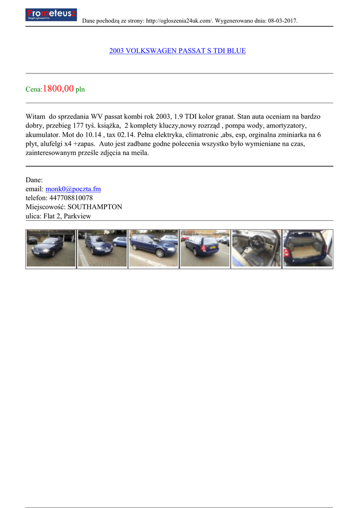 Dane pochodzą ze strony: http://ogloszenia24uk.com/. Wygenerowano dnia: 08-03-2017. 2003 VOLKSWAGEN PASSAT S TDI BLUE Cena:1800,00 pln Witam do sprzedania WV passat kombi rok 2003, 1.9 TDI kolor granat. Stan auta oceniam na bardzo dobry, przebieg 177 tyś. książka, 2 komplety kluczy,nowy rozrząd , pompa wody, amortyzatory, akumulator. Mot do 10.14 , tax 02.14. Pełna elektryka, climatronic ,abs, esp, orginalna zminiarka na 6 płyt, alufelgi x4 +zapas. Auto jest zadbane godne polecenia wszystko było wymieniane na czas, zainteresowanym prześle zdjęcia na meila. Dane: email: [email protected] telefon: 447708810078 Miejscowość: SOUTHAMPTON ulica: Flat 2, Parkview