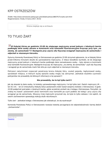 KPP OSTRZESZÓW Źródło: http://www.ostrzeszow.policja.gov.pl/w18/aktualnosci/88379,To-tylko-zart.html Wygenerowano: Środa, 8 marca 2017, 05:52 Strona znajduje się w archiwum. TO TYLKO ŻART W Kobylej Górze po godzinie 22:00 do stojącego mężczyzny przed jednym z lokalnych barów podbiegły dwie osoby ubrane w kominiarki oraz kamizelki fluoroscencyjne krzycząc przy tym „na ziemię, do samochodu”!!! Następnie przy użyciu siły fizycznej wciągnęli mężczyznę do samochodu i odjechali w nieznanym kierunku. Dyżurny Komendy Powiatowej Policji w Ostrzeszowie po godzinie 22:00 otrzymał zgłoszenie, że w Kobylej Górze przed kilkoma minutami doszło do uprowadzenia mężczyzny. Z relacji świadków wynikało, że do stojącego mężczyzny przed jednym z lokalnych barów podbiegły dwie zamaskowane osoby – były ubrane w kominiarki oraz kamizelki fluoroscencyjne. Następnie krzycząc do mężczyzny „na ziemię, do samochodu” użyli siły fizycznej i wciągnęli go do samochodu marki fiat stilo po czym odjechali w nieznanym kierunku. Policjanci natychmiast rozpoczęli penetrację terenu Kobylej Góry, szukali pojazdu, legitymowali osoby, sprawdzali miejsca, w których wyżej opisane osoby mogły się zatrzymać. Jednakże wszelkie czynności policjantów nie prowadziły do bliższych informacji w tej sprawie!!! Nie prowadziły, bo to był tylko żart!!! Jak się okazało te dwie osoby, to koledzy uprowadzonego mężczyzny i to był tylko żart. Dwóch mężczyzn J.M. – lat 19, A.K. – lat 22 (mieszkańcy Kobylej Góry) postanowili zrobić kawał swojemu koledze z Ostrzeszowa. O godz. 22:00 podjechali pod jeden z lokalnych barów, gdzie wcześniej umówili się z kolegą z Ostrzeszowa. Pomyśleli, że zrobią mu kawał i postanowili ubrać kominiarki oraz kamizelki po czym podbiec do kolegi i przy użyciu siły wciągnąć go do samochodu. Wszyscy trzej mężczyźni przyznali się, że była to tylko zabawa i nie sądzili, że swoim zachowaniem spowodują reakcję służb ratunkowych. Tylko żart – jednakże kolega z Ostrzeszowa jak oświadczył, że się wystraszył! Komenda Powiatowa Policji w Ostrzeszowie rozważa kwestię pociągnięcia do odpowiedzialności karnej dwóch „żartownisiów”. Ocena: 0/5 (0) Tweetnij