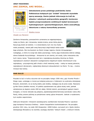 JERZY MAKOWSKI ANI ZIEMIA, ANI WODA... Odnalezienie przez polskiego podróżnika Jacka Pałkiewicza kolejnych już "źródeł" Amazonki wywołało sporą sensację. Zanim jednak informacja ta trafi do atlasów i szkolnych podręczników geografii, konieczne będzie przeprowadzenie wnikliwych badań terenowych Artykuł pochodzi z "Wiedzy i Życia" nr 12/1996 hydrologicznych i geomorfologicznych, które zweryfikują lakoniczne z natury komunikaty prasowe. Słodkie morza Ukajali czy Maranon Zarówno Amazonka, powszechnie uznawana za najpotężniejszą rzekę na Ziemi, jak i Amazonia, lesista kraina, przez którą płynie, fascynują świat od wieków. I w stwierdzeniu tym nie ma chyba wiele przesady, nawet jeśli owej fascynacji uległ kiedyś także autor tego artykułu. Nie ma bowiem na Ziemi innego regionu równie intrygującego i rozległego, a mimo to wciąż tak słabo poznanego. Cechy jego środowiska dobrze oddają słowa Godarda Kuczyńskiego - Amazonia to ani ziemia, ani woda, tylko mieszanka obu tych rzeczy naraz. 1Kojarzona jest też z największą aluwialną równiną na Ziemi, największym zwartym obszarem występowania wilgotnych lasów równikowych oraz największą - przynajmniej jeśli chodzi o ilość niesionej wody - rzeką na naszej planecie, największym dorzeczem, najbardziej złożonym ekosystemem na Ziemi. Te naj... można mnożyć bez końca. MAR DULCE Musiało to być w końcu stycznia lub na początku lutego 1500 roku, gdy Vicente Pinzón i Diego Lope, uciekając w morze po kolejnej potyczce z Indianami na wybrzeżu dzisiejszej Brazylii, stwierdzili, że za burtą statku jest słodka, nadająca się do picia woda. Nazwano ją Mar Dulce (słodkie morze). W pobliżu spodziewano się ujścia dużej rzeki, jednak odnaleziono je dopiero około 200 km dalej. Wśród niskich, porośniętych gęstym lasem brzegów, w morze wlewała się potężna, pięćdziesięciokilometrowej szerokości rzeka (Rio Pará), którą uznano później za południowe ramię ujścia Amazonki. Jednak o wydarzeniu tym szybko zapomniano. Odkrycie Amazonki i Amazonii zawdzięczamy zachłanności Gonzala Pizarra i sprytowi jego kompana Francisca Orellany - dwóm hiszpańskim konkwistadorom. Na początku grudnia 1541 roku, na czele 340 Hiszpanów i 4000 Indian, wyruszyli oni z Quito (stolicy dzisiejszego Ekwadoru) na wschód, szukając skarbów "złotych miast", o których mówiły zasłyszane w Andach legendy indiańskie. Droga wiodła śródgórską doliną rzeki Coca, dalej Napo, która spływa z zalesionych stoków Andów ku wschodowi, by zanurzyć się w bezmiarze równikowej puszczy, porastającej całą Nizinę Amazonki. Już po kilku tygodniach uciążliwego przedzierania się przez las i mozolnego spływu zbudowaną nad Napo brygantyną, Pizarro postanowił wysłać część swoich ludzi na zwiad. W dół Napo wyruszył kilkudziesięcioosobowy oddział Hiszpanów i Indian pod dowództwem Orellany i... nigdy już nie wrócił do czekającego nad rzeką Pizarra. Po 172 dniach pełnej przygód podróży dotarł do Oceanu Atlantyckiego. Orellana był więc pierwszym Europejczykiem, który wkroczył na Nizinę Amazonki i odkrył ogromną rzekę, nazwaną przez niego Rio de las Amazonas (rzeką Amazonek). Nazwą tą upamiętnił (urojone raczej niż rzeczywiste) spotkanie z wojowniczymi Indiankami znad tej wielkiej wody. Rzeka Amazonek przecinała w poprzek niedawno poznany (jeszcze nie nazwany) ląd, mając swoje źródła gdzieś blisko Pacyfiku (zwanego wówczas Morzem Południowym) i ujście, jak się okazało, w słodkim morzu odnalezionym przez Vincente'a Pinzona czterdzieści lat wcześniej. Oferowała też znakomite warunki dla żeglugi, gdyż jej koryto nigdzie nie było przegrodzone wodospadami ani nawet bystrzami. Z obu stron otrzymywała liczne, zasobne w wodę dopływy, które łudziły szansą nowych odkryć i podbojów. Jedna z tych rzek, nazwana przez Orellanę Rio Negro od czarnych jak atrament wód, przez wiele kilometrów nie mieszających się z żółtymi od niesionej zawiesiny wodami Amazonki, wywarła na Hiszpanach duże wrażenie. Kolejni odkrywcy, zarówno jeszcze w okresie podboju kontynentu, jak i później, stopniowo rozszerzali wiedzę o Amazonce i Amazonii, weryfikując wcześniejsze doniesienia Orellany i wnosząc nowe informacje o regionie. Wojownicze Amazonki, chociaż okazały się wytworem fantazji, co najmniej przez jedno stulecie były skuteczną zachętą do zapuszczania się w głąb bezkresnej selwy (tak nazywamy wilgotny las równikowy w dorzeczu Amazonki), która bez tego intrygującego bodźca mogła wydawać się przeszkodą nie do pokonania. Wśród następców Orellany godzi się wymienić przede wszystkim Pedra Teixeirę, Portugalczyka, który w latach 1637-1640 odbył rejs z niewielkiej osady Belém (dziś dużego miasta) u ujścia Amazonki, w górę rzeki, a dalej śladami Orellany aż do Quito i z powrotem, inicjując w ten sposób żeglugę po Amazonce. Dorzecze Amazonki należy do największych na świecie; dla porównania - dorzecze Wisły Pierwszych poważnych obserwacji naukowych Amazonka i Amazonia doczekały się dopiero w XVIII wieku. Ich inicjatorem był francuski matematyk, geodeta i podróżnik Charles--Marie de la Condamine, który w 1743 roku ustalił współrzędne geograficzne kilku istotnych punktów położonych nad Amazonką, pozwalających na opracowanie dokładnej - jak na owe czasy - mapy jej środkowego i dolnego biegu. W końcu XVIII wieku (1799) Aleksander von Humboldt, niemiecki przyrodnik i geograf dotarł do znanego od co najmniej 150 lat naturalnego połączenia (poprzez rzekę Casiquiare) dwóch dorzeczy Orinoko i Amazonki i po badaniach terenowych sporządził pierwszy naukowy opis ich bifurkacji. Chociaż Humboldt właściwie tylko "otarł się" o Amazonię, jednak dzięki szczegółowym opracowaniom i syntetycznym uogólnieniom poczynionych obserwacji z zakresu geografii fizycznej, klimatologii, hydrografii i bioge