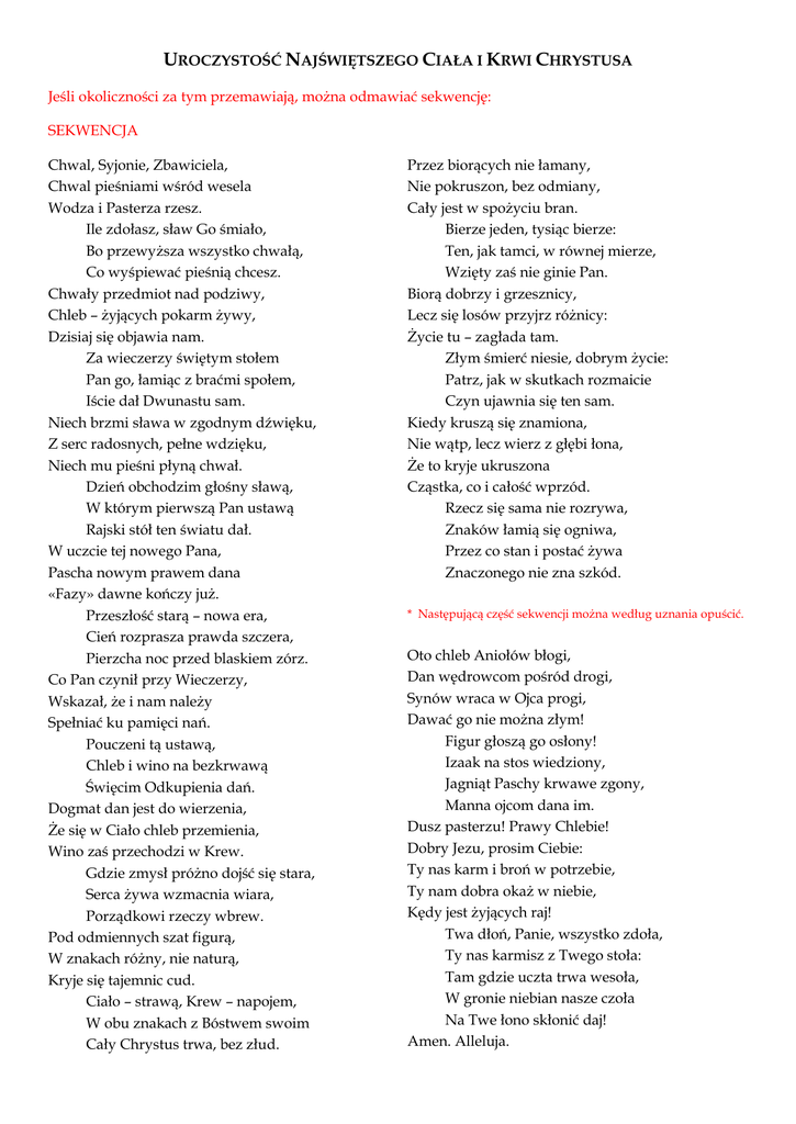UROCZYSTOŚĆ NAJŚWIĘTSZEGO CIAŁA I KRWI CHRYSTUSA Jeśli okoliczności za tym przemawiają, można odmawiać sekwencję: SEKWENCJA Chwal, Syjonie, Zbawiciela, Chwal pieśniami wśród wesela Wodza i Pasterza rzesz. Ile zdołasz, sław Go śmiało, Bo przewyższa wszystko chwałą, Co wyśpiewać pieśnią chcesz. Chwały przedmiot nad podziwy, Chleb – żyjących pokarm żywy, Dzisiaj się objawia nam. Za wieczerzy świętym stołem Pan go, łamiąc z braćmi społem, Iście dał Dwunastu sam. Niech brzmi sława w zgodnym dźwięku, Z serc radosnych, pełne wdzięku, Niech mu pieśni płyną chwał. Dzień obchodzim głośny sławą, W którym pierwszą Pan ustawą Rajski stół ten światu dał. W uczcie tej nowego Pana, Pascha nowym prawem dana «Fazy» dawne kończy już. Przeszłość starą – nowa era, Cień rozprasza prawda szczera, Pierzcha noc przed blaskiem zórz. Co Pan czynił przy Wieczerzy, Wskazał, że i nam należy Spełniać ku pamięci nań. Pouczeni tą ustawą, Chleb i wino na bezkrwawą Święcim Odkupienia dań. Dogmat dan jest do wierzenia, Że się w Ciało chleb przemienia, Wino zaś przechodzi w Krew. Gdzie zmysł próżno dojść się stara, Serca żywa wzmacnia wiara, Porządkowi rzeczy wbrew. Pod odmiennych szat figurą, W znakach różny, nie naturą, Kryje się tajemnic cud. Ciało – strawą, Krew – napojem, W obu znakach z Bóstwem swoim Cały Chrystus trwa, bez złud. Przez biorących nie łamany, Nie pokruszon, bez odmiany, Cały jest w spożyciu bran. Bierze jeden, tysiąc bierze: Ten, jak tamci, w równej mierze, Wzięty zaś nie ginie Pan. Biorą dobrzy i grzesznicy, Lecz się losów przyjrz różnicy: Życie tu – zagłada tam. Złym śmierć niesie, dobrym życie: Patrz, jak w skutkach rozmaicie Czyn ujawnia się ten sam. Kiedy kruszą się znamiona, Nie wątp, lecz wierz z głębi łona, Że to kryje ukruszona Cząstka, co i całość wprzód. Rzecz się sama nie rozrywa, Znaków łamią się ogniwa, Przez co stan i postać żywa Znaczonego nie zna szkód. * Następującą część sekwencji można według uznania opuścić. Oto chleb Aniołów błogi, Dan wędrowcom pośród drogi, Synów wraca w Ojca progi, Dawać go nie można złym! Figur głoszą go osłony! Izaak na stos wiedziony, Jagniąt Paschy krwawe zgony, Manna ojcom dana im. Dusz pasterzu! Prawy Chlebie! Dobry Jezu, prosim Ciebie: Ty nas karm i broń w potrzebie, Ty nam dobra okaż w niebie, Kędy jest żyjących raj! Twa dłoń, Panie, wszystko zdoła, Ty nas karmisz z Twego stoła: Tam gdzie uczta trwa wesoła, W gronie niebian nasze czoła Na Twe łono skłonić daj! Amen. Alleluja.