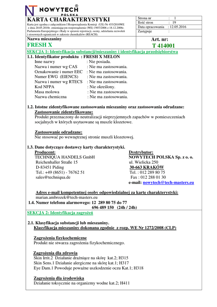 KARTA CHARAKTERYSTYKI Karta jest zgodna z załącznikiem I Rozporządzenia Komisji (UE) Nr 453/2010WE z dnia 20.05.2010r. zmieniającym rozporządzenie (WE) 1907/2006 z 18.12.2006r. Parlamentu Europejskiego i Rady w sprawie rejestracji, oceny, udzielania zezwoleń i stosownych ograniczeń w zakresie chemikaliów (REACH). Strona nr Ilość stron Data opracowania Zastępuje Nazwa mieszaniny FRESH X : 1 : 19 : 12.05.2016 : Art. nr: T 414001 SEKCJA 1: Identyfikacja substancji/mieszaniny i identyfikacja przedsiębiorstwa 1.1. Identyfikator produktu : FRESH X MELON Inne nazwy : Nie posiada. Nazwa i numer wg CAS : Nie ma zastosowania. Oznakowanie i numer EEC : Nie ma zastosowania. Numer EWG (EIENCS) : Nie ma zastosowania. Nazwa i numer wg RTECS : Nie ma zastosowania. Kod NFPA : Nie określony. Masa molowa : Nie ma zastosowania. Nazwa chemiczna : Nie ma zastosowania. 1.2. Istotne zidentyfikowane zastosowania mieszaniny oraz zastosowania odradzane: Zastosowanie zidentyfikowane: Produkt przeznaczony do neutralizacji nieprzyjemnych zapachów w pomieszczeniach socjalnych w których usytuowane są muszle klozetowe. Zastosowanie odradzane: Nie stosować po wewnętrznej stronie muszli klozetowej. 1.3. Dane dotyczące dostawcy karty charakterystyki. Producent: Dystrybutor: TECHNIQUA HANDELS GmbH NOWYTECH POLSKA Sp. z o. o. Reichenhaller Straße 15 ul. Wielicka 250 D-83451 Piding 30-663 KRAKÓW Tel.: +49 (8651) - 76762 51 Tel. : 012 289 80 75 [email protected] Fax : 012 288 01 30 e-mail: [email protected] Adres e-mail kompetentnej osoby odpowiedzialnej za kartę charakterystyki: [email protected] 1.4. Numer telefonu alarmowego: 12 289 80 75 do 77 696 489 150 (24h / 24h) SEKCJA 2: Identyfikacja zagrożeń 2.1. Klasyfikacja substancji lub mieszaniny. Klasyfikacja mieszaniny dokonana zgodnie z rozp. WE Nr 1272/2008 (CLP) Zagrożenia fizykochemiczne Produkt nie stwarza zagrożenia fizykochemicznego. Zagrożenia dla zdrowia Skin Irrit.2 Działanie drażniące na skórę kat.2; H315 Skin Sens.1 Działanie alergiczne na skórę kat.1; H317 Eye Dam.1 Powoduje poważne uszkodzenie oczu Kat.1; H318 Zagrożenia dla środowiska Działanie toksycznie na organizmy wodne kat.2; H411 KARTA CHARAKTERYSTYKI Karta jest zgodna z załącznikiem I Rozporządzenia Komisji (UE) Nr 453/2010WE z dnia 20.05.2010r. zmieniającym rozporządzenie (WE) 1907/2006 z 18.12.2006r. Parlamentu Europejskiego i Rady w sprawie rejestracji, oceny, udzielania zezwoleń i stosownych ograniczeń w zakresie chemikaliów (REACH). Nazwa mieszaniny Strona nr Ilość stron Data opracowania Zastępuje : 2 : 19 : 12.05.2016 : Art. nr: FRESH X T 414001 Zagrożenia dla środowiska Działanie toksycznie na organizmy wodne kat.2; H411 2.2. ELEMENTY OZNAKOWANIA Piktogram(y) określający(e) rodzaj zagrożenia: GHS07 GHS005 GHS09 Hasło ostrzegawcze Niebezpieczeństwo (Dng) Zawiera: ALDEHYD CYNAMONOWY (CAS104-55-2) < 3,5% 2-(4-TERT-BUTYLBENZYL)PROPANAL (CAS80-54-6) < 3,5% CYKLAMEN ALDEHYDU (103-95-7) < 3,5% OCTAN 2-t-BUTYLCYKLOHEKSYL (CAS 88-41-5) < 3,5 % Zwrot(-y) wskazujący(-e) rodzaj zagrożenia H315 Działa drażniąco na skórę. H317 Może powodować reakcję alergiczną skóry. H318 Powoduje poważne uszkodzenie oczu. H411 Działa toksycznie na organizmy wodne. Zwrot(-y) określający(-e) środki ostrożności - ogólne: P103 Przed użyciem przeczytać etykietę. Zwrot(-y) określający(-e) środki ostrożności – zapobieganie: P273 Unikać uwolnienia do środowiska. P280 Stosować rękawice ochronne/odzież ochronną/ochronę oczu/ochronę twarzy. Zwrot(-y) określający(-e) środki ostrożności – reagowanie: P302+P352 W PRZYPADKU KONTAKTU ZE SKÓRĄ: umyć dużą ilością wody z mydłem. P333+P313 W przypadku wystąpienia podrażnienia skóry lub wysypki: Zasięgnąć porady/zgłosić się pod opiekę lekarza. Usuwanie P501 usuwać zgodnie z przepisami miejscowymi i regionalnymi. 2.3. INNE ZAGROŻENIA Nie stwarza innych zagrożeń SEKCJA 3: Skład/informacja o składnikach. 3.1. Substancje: Nie dotyczy. 3.2. Mieszaniny: ESTER ETYLENU KWASU OCTOWEGO Zawartość: 60% < C < 80% Numer indeksowy: Nie posiada Numer CAS: 24937-78-8 Numer WE: Nie posiada Numer rejestracji: Nie posiada KARTA CHARAKTERYSTYKI Karta jest zgodna z załącznikiem I Rozporządzenia Komisji (UE) Nr 453/2010WE z dnia 20.05.2010r. zmieniającym rozporządzenie (WE) 1907/2006 z 18.12.2006r. Parlamentu Europejskiego i Rady w sprawie rejestracji, oceny, udzielania zezwoleń i stosownych ograniczeń w zakresie chemikaliów (REACH). Strona nr : 3 Ilość stron : 19 Data opracowania : 12.05.2016 Zastępuje : Nazwa mieszaniny Art. nr: FRESH X T 414001 Klasyfikacja zgodna z kryteriami rozporządzenia (WE) nr 1272/2008: Substancja nie jest zaklasyfikowana jako niebezpieczna. LINALOL Zawartość: 0,35 < C < 3,5 % Numer indeksowy: Nie posiada Numer CAS: 78-70-6 Numer WE: 201-134-4 Numer rejestracji: Nie posiada Klasyfikacja zgodna z kryteriami rozporządzenia (WE) nr 1272/2008: piktogram klasa zagrożenia/kod kategorii zwroty H Skin Irrit.2 H315 Eye Irrit.2 H319 Skin Irrit.2; H315 - stężenie graniczne C=>10% Eye Irrit.2; H319 - stężenie graniczne C=>10% GAMMA-UNDECALACTONE Zawartość: 0,35 < C <3,5% Numer indeksowy: Nie posiada Numer CAS: 104-67-6 Numer WE: 203-225-4 Numer rejestracji: Nie posiada Klasyfikacja zgodna z kryteriami rozporządzenia (WE) nr 1272/2008: piktogram klasa zagrożenia/kod kategorii Aquatic Chronic 2 zwroty H H411 OCTAN GERANYLU Zawartość: 0,35 < C <3,5% Numer indeksowy: Nie posiada Numer CAS: 105-87-3 Numer WE: 203-341-5 Numer rejestracji: Nie posiada Klasyfikacja zgodna z kryteriami rozporządzenia (WE) nr 1272/2008: piktogram klasa zagrożenia/kod kategorii Aquatic Chronic 2 zwroty H H411 KARTA CHARAKTERYSTYKI Karta jest zgodna z załącznikiem I Rozporządzenia Komisji (UE) Nr 453/2010WE z dnia 20.05.2010r. zmieniającym rozporządzenie (WE) 1907/2006 z 18.12.2006r. Parlamentu Europejskiego i Rady w sprawie rejestracji, oceny, udzielania zezwoleń i stosow