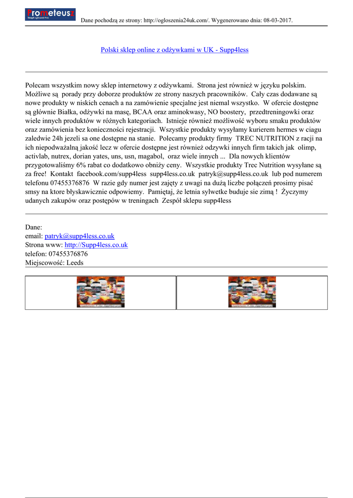 Dane pochodzą ze strony: http://ogloszenia24uk.com/. Wygenerowano dnia: 08-03-2017. Polski sklep online z odżywkami w UK - Supp4less Polecam wszystkim nowy sklep internetowy z odżywkami. Strona jest również w języku polskim. Możliwe są porady przy doborze produktów ze strony naszych pracowników. Cały czas dodawane są nowe produkty w niskich cenach a na zamówienie specjalne jest niemal wszystko. W ofercie dostępne są głównie Białka, odżywki na masę, BCAA oraz aminokwasy, NO boostery, przedtreningowki oraz wiele innych produktów w różnych kategoriach. Istnieje również możliwość wyboru smaku produktów oraz zamówienia bez konieczności rejestracji. Wszystkie produkty wysyłamy kurierem hermes w ciagu zaledwie 24h jezeli sa one dostępne na stanie. Polecamy produkty firmy TREC NUTRITION z racji na ich niepodważalną jakość lecz w ofercie dostępne jest również odzywki innych firm takich jak olimp, activlab, nutrex, dorian yates, uns, usn, magabol, oraz wiele innych ... Dla nowych klientów przygotowaliśmy 6% rabat co dodatkowo obniży ceny. Wszystkie produkty Trec Nutrition wysyłane są za free! Kontakt facebook.com/supp4less supp4less.co.uk [email protected] lub pod numerem telefonu 07455376876 W razie gdy numer jest zajęty z uwagi na dużą liczbe połączeń prosimy pisać smsy na ktore błyskawicznie odpowiemy. Pamiętaj, że letnia sylwetke buduje sie zimą ! Życzymy udanych zakupów oraz postępów w treningach Zespół sklepu supp4less Dane: email: [email protected] Strona www: http://Supp4less.co.uk telefon: 07455376876 Miejscowość: Leeds
