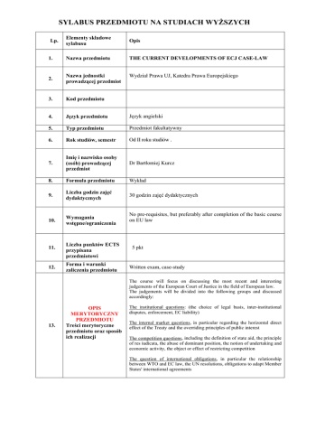 SYLABUS PRZEDMIOTU NA STUDIACH WYŻSZYCH Elementy składowe sylabusu Opis 1. Nazwa przedmiotu THE CURRENT DEVELOPMENTS OF ECJ CASE-LAW 2. Nazwa jednostki prowadzącej przedmiot Wydział Prawa UJ, Katedra Prawa Europejskiego 3. Kod przedmiotu 4. Język przedmiotu Język angielski 5. Typ przedmiotu Przedmiot fakultatywny 6. Rok studiów, semestr Od II roku studiów . 7. Imię i nazwisko osoby (osób) prowadzącej przedmiot Dr Bartłomiej Kurcz 8. Formuła przedmiotu Wykład 9. Liczba godzin zajęć dydaktycznych 30 godzin zajęć dydaktycznych 10. Wymagania wstępne/ograniczenia Lp. 11. 12. Liczba punktów ECTS przypisana przedmiotowi Forma i warunki zaliczenia przedmiotu No pre-requisites, but preferably after completion of the basic course on EU law 5 pkt Written exam, case-study The course will focus on discussing the most recent and interesting judgements of the European Court of Justice in the field of European law. The judgements will be divided into the following groups and discussed accordingly: 13. OPIS MERYTORYCZNY PRZEDMIOTU Treści merytoryczne przedmiotu oraz sposób ich realizacji The institutional questions: (the choice of legal basis, inter-institutional disputes, enforcement, EC liability) The internal market questions, in particular regarding the horizontal direct effect of the Treaty and the overriding principles of public interest The competition questions, including the definition of state aid, the principle of res iudicata, the abuse of dominant position, the notion of undertaking and economic activity, the object or effect of restricting competition The question of international obligations, in particular the relationship between WTO and EC law, the UN resolutions, obligations to adapt Member States' international agreements Literatura podstawowa – orzecznictwo: Judgement C-301/06 Ireland v Parliament and Council, Judgement C-411/06 Commission v Parliament and Council Judgement C-121/07 Commission v France Judgement C- Judgment C-499/06 Nerkowska Judgment C-524/06 Heinz Huber Judgement C-11/06 Morgan Judgement C-465/07 Meki Elgafaji i Noor Elgafaji / Staatssecretaris van Justitie 440/07 P Commission v Schneider Judgment C-499/06 Nerkowska Judgment C-524/06 Heinz Huber Judgement C-11/06 Morgan 14. Wykaz literatury podstawowej Judgement C-465/07 Meki Elgafaji i Noor Elgafaji / Staatssecretaris van Justitie Judgement C-169/07 Hartlauer Handelsgesellschaft mbH / Wiener Landesregierung i in. Judgement C-222/07 UTECA / Administración General del Estado Judgement C-341/05 Laval Judgement C-549/07 Friederike Wallentin-Hermann / Alitalia Judgement C-119/05 Lucchini SpA Judgement T-196/04 Ryanair Ltd / Commission Judgment C-350/07 Kattner Stahlbau Judgment C-209/07 Beef Industry Development Society and Barry Brothers Judgment C-49/07 MOTOE Jugement C-117/06 Gerda Môllendorf Judgment C-205/06 Commission v Austria Judgment Joined Cases C-120/06 P, C-121/06 P FIAMM and FIAMM Technologies v Council and Commission Literatura uzupełniająca: K. Schiemann, The functioning of the Court of Justice in an Enlarged Union and the Future of the Court [in:] Arnull, Eeckhout, Tridimas (eds.) (Essays in Honour of Sir Francis Jacobs), Oxford 2008 E. Sharpstone, The changing role of the Advocate General [in:] Arnull, Eeckhout, Tridimas (eds.) (Essays in Honour of Sir Francis Jacobs), Oxford 2008 N. Forewood, the Court of First Instance, its Development, and Future Role in the Legal Archictecture of the European Union [in:] Arnull, Eeckhout, Tridimas (eds.) (Essays in Honour of Sir Francis Jacobs), Oxford 2008 M. Hedemann-Robinson, Enforcement of European Union Environmental Law – Legal issues and challenges, 2007, pages 112159, K. Lenaerts, D. Arts, Procedural Law of the European Union, London 2006, 369-407 M. Dougan, Expanding the Frontiers of European Union Citizenship by Dismantling the Territorial Boundaries of the National Welfare States? [in:] The outer limits of EU Law. Barnard, C. & Odudu (ed.), O. Hart Publishing 2008 15. Wykaz literatury uzupełniającej. E Spaventa, Seeing the Wood Despite the Trees? On the Scope of Union Citizenship and its Constitutional Effects. Common Market Law Review 45: 13-45. C. Barnard: Are there Limits to Justifications in the Four Freedoms? [in:] The outer limits of EU Law. Barnard, C. & Odudu (ed.), O. Hart Publishing 2008 E. Spaventa:. The outer limit of the Treaty free movement provisions: some reflections on the significance of Keck, remoteness and Deliège. [in:] The outer limits of EU Law. Barnard, C. & Odudu (ed.), O. Hart Publishing 2008 C. Joerges and F. Rödl, Informal politics, formalised law and the "social deficit" of European integration : reflections after the judgments of the ECJ in "Viking" and "Laval" / European Law Journal 2009, v. 15, n. 1, January, p. [1]-19 A. Biondi, Annotation, Case C-119/05, Ministero dell’Industria, del Commercio e dell’Artigianato v. Lucchini SpA, formerly Lucchini Siderurgica Spa, Judgement of the Court of Justice (Grand Chamber) of July 2007, 2007 [ECR] I-6199. / Common Market Law Review 2008, v. 45, n. 5, October, p. [1459]-1467 B. Kurcz, D. Vallindas, Can general measures be--selective? : Some thoughts on the interpretation of a state aid definition / Common Market Law Review 2008, v. 45, n. 1, February, p. [159]-182 .H Jackson, Direct Effect of Treaties and in the US and the EU, the Case of WTO: Some perceptions and Proposals [in:] Arnull, Eeckhout, Tridimas (eds.) (Essays in Honour of Sir Francis Jacobs), Oxford 2008 * sporządzono w oparciu o broszurę „Europejski system transferu i akumulacji punktów (ECTS). Krótki przewodnik”, opracowany na podstawie przewodnika „Europejski System Transferu i Akumulacji Punktów i Suplement do Dyplomu”, sfinansowany w ramach funduszy Programu SOCRATES-Erasmus, Warszawa 2006.