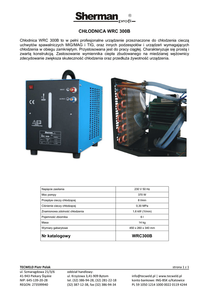 CHŁODNICA WRC 300B Chłodnica WRC 300B to w pełni profesjonalne urządzenie przeznaczone do chłodzenia cieczą uchwytów spawalniczych MIG/MAG i TIG, oraz innych podzespołów i urządzeń wymagających chłodzenia w obiegu zamkniętym. Przystosowana jest do pracy ciągłej. Charakteryzuje się prostą i zwartą konstrukcją. Zastosowanie wymiennika ciepła zbudowanego na miedzianej wężownicy zdecydowanie zwiększa skuteczność chłodzenia oraz przedłuża żywotność urządzenia. Napięcie zasilania 230 V 50 Hz Moc pompy 370 W Przepływ cieczy chłodzącej 8 l/min Ciśnienie cieczy chłodzącej 0,30 MPa Znamionowa zdolność chłodzenia Pojemność zbiornika Masa 6l 14 kg Wymiary gabarytowe Nr katalogowy TECWELD Piotr Polak ul. Szmaragdowa 21/3/6 41-943 Piekary Śląskie NIP: 645-139-20-28 REGON: 273599940 1,6 kW (1l/min) 450 x 260 x 340 mm WRC300B strona 1 z 1 oddział handlowy: ul. Krzyżowa 3,41-909 Bytom tel. (32) 386-94-28, (32) 281-22-18 (32) 387-12-38, fax (32) 386-94-34 [email protected] | www.tecweld.pl konto bankowe: ING-BSK o/Katowice PL 59 1050 1214 1000 0022 0119 4244