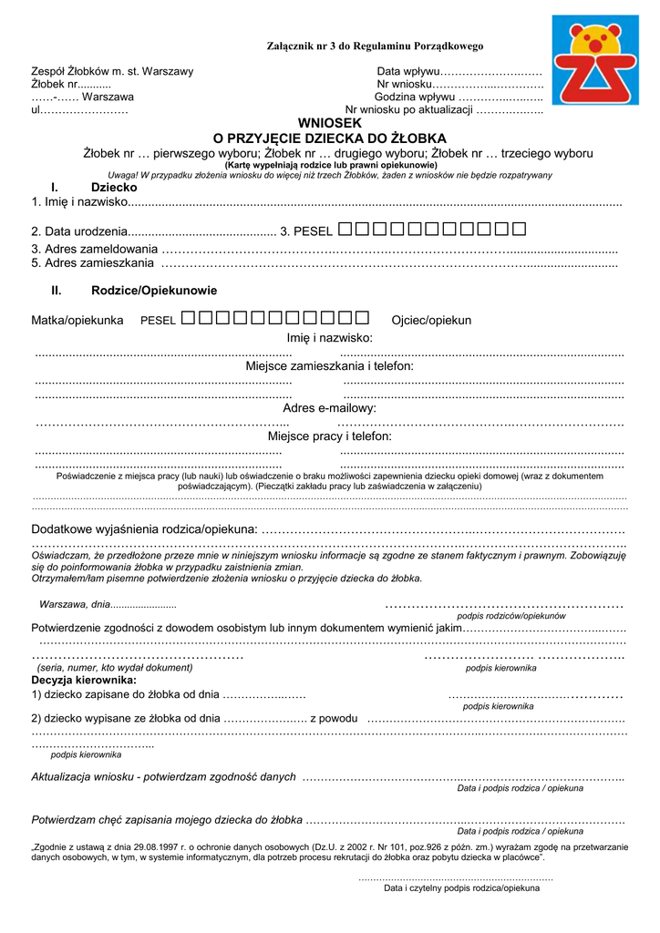 Załącznik nr 3 do Regulaminu Porządkowego Zespół Żłobków m. st. Warszawy Żłobek nr........... ……-…… Warszawa ul…………………… Data wpływu………………….…… Nr wniosku……………...…………. Godzina wpływu …………..…..….. Nr wniosku po aktualizacji ……….….….. WNIOSEK O PRZYJĘCIE DZIECKA DO ŻŁOBKA Żłobek nr … pierwszego wyboru; Żłobek nr … drugiego wyboru; Żłobek nr … trzeciego wyboru (Kartę wypełniają rodzice lub prawni opiekunowie) Uwaga! W przypadku złożenia wniosku do więcej niż trzech Żłobków, żaden z wniosków nie będzie rozpatrywany I. Dziecko 1. Imię i nazwisko.................................................................................................................................................. □□□□□□□□□□□ 2. Data urodzenia............................................ 3. PESEL 3. Adres zameldowania …………………………………….………….…………………………................................ 5. Adres zamieszkania ………………………………………………………………………………........................... II. Rodzice/Opiekunowie Matka/opiekunka PESEL □□□□□□□□□□□ Ojciec/opiekun Imię i nazwisko: ............................................................................ .................................................................................... Miejsce zamieszkania i telefon: ............................................................................ ................................................................................... ............................................................................ ................................................................................... Adres e-mailowy: ……………………………………………………... …………………………………….………………………. Miejsce pracy i telefon: ......................................................................... .................................................................................... ......................................................................... .................................................................................... Poświadczenie z miejsca pracy (lub nauki) lub oświadczenie o braku możliwości zapewnienia dziecku opieki domowej (wraz z dokumentem poświadczającym). (Pieczątki zakładu pracy lub zaświadczenia w załączeniu) ………………………………………………………………………………………………………………………………………………………………………………… …………………………………………………………………………………………………………………….…………………………………………………………… Dodatkowe wyjaśnienia rodzica/opiekuna: ……………………………………………..………………………………. …………………………………………………………………………………………….………………………………….. Oświadczam, że przedłożone przeze mnie w niniejszym wniosku informacje są zgodne ze stanem faktycznym i prawnym. Zobowiązuję się do poinformowania żłobka w przypadku zaistnienia zmian. Otrzymałem/łam pisemne potwierdzenie złożenia wniosku o przyjęcie dziecka do żłobka. Warszawa, dnia........................ ……………………………………………… podpis rodziców/opiekunów Potwierdzenie zgodności z dowodem osobistym lub innym dokumentem wymienić jakim………………………………..……. …………………………………………………………………………………………………………………………………………… ………………………………………… (seria, numer, kto wydał dokument) Decyzja kierownika: 1) dziecko zapisane do żłobka od dnia ……………..…… ……………………. ……………….. podpis kierownika ……………………………………… podpis kierownika 2) dziecko wypisane ze żłobka od dnia ……………….…. z powodu ……………………………………………………………. …………………………………………………………………………………………………………..…………….…………………… ….………………………... podpis kierownika Aktualizacja wniosku - potwierdzam zgodność danych ……………………………………..…………………………………….. Data i podpis rodzica / opiekuna Potwierdzam chęć zapisania mojego dziecka do żłobka ……………………………………..……………………………………. Data i podpis rodzica / opiekuna „Zgodnie z ustawą z dnia 29.08.1997 r. o ochronie danych osobowych (Dz.U. z 2002 r. Nr 101, poz.926 z późn. zm.) wyrażam zgodę na przetwarzanie danych osobowych, w tym, w systemie informatycznym, dla potrzeb procesu rekrutacji do żłobka oraz pobytu dziecka w placówce”. ………………………………………………………… Data i czytelny podpis rodzica/opiekuna