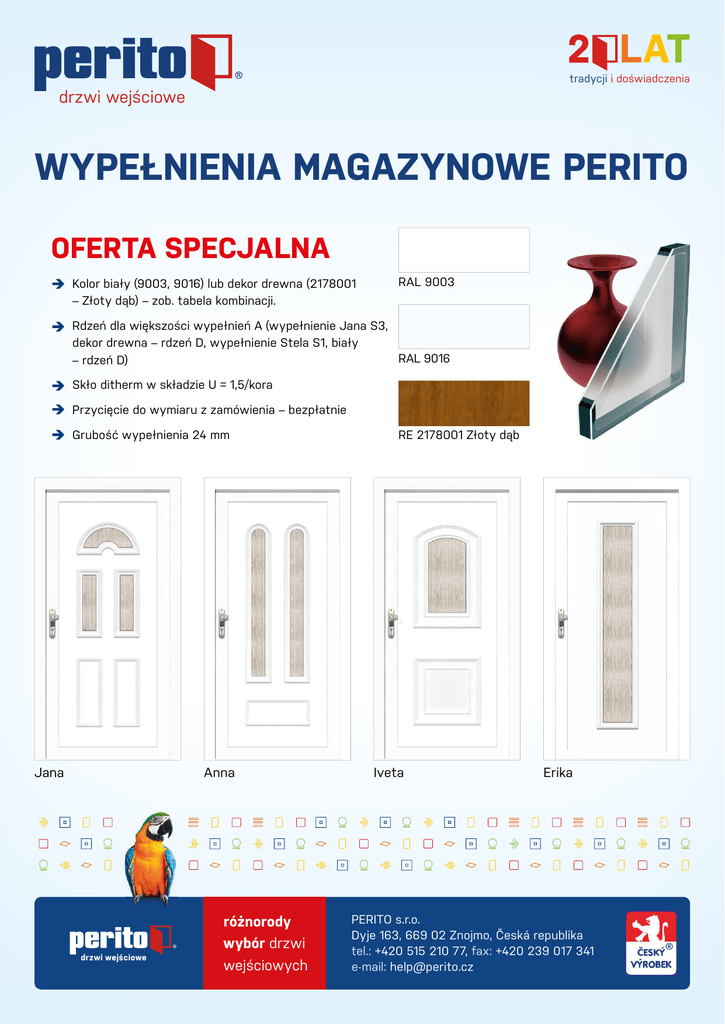 LAT tradycji i doświadczenia drzwi wejściowe WYPEŁNIENIA MAGAZYNOWE PERITO OFERTA SPECJALNA Kolor biały (9003, 9016) lub dekor drewna (2178001 – Złoty dąb) – zob. tabela kombinacji. RAL 9003 Rdzeń dla większości wypełnień A (wypełnienie Jana S3, dekor drewna – rdzeń D, wypełnienie Stela S1, biały RAL 9016 – rdzeń D) Skło ditherm w składzie U = 1,5/kora Przycięcie do wymiaru z zamówienia – bezpłatnie Grubość wypełnienia 24 mm Jana Anna drzwi wejściowe różnorody wybór drzwi wejściowych RE 2178001 Złoty dąb Iveta Erika PERITO s.r.o. Dyje 163, 669 02 Znojmo, Česká republika tel.: +420 515 210 77, fax: +420 239 017 341 e-mail: [email protected] Gabriela Olivie Stela Sandra Aneta Denisa Regina Annabel 9016 9003 2178001 2178001 2178001 9016 9003 9016 9003 2178001 S3 S3 S3 Sandra S3 S3 S3 Aneta S1 S1 S1 Denisa S4 S4 S4 Regina S1 S1 S1 Annabel S2 S2 S2 Kamila S1 S1 S1 Jana Kamila Możliwe kombinacje kolorów S0, S1, S3 S0, S1, S3 Anna S2 S2 Iveta S1 S1 Erika S1 S1 Gabriela S2 S2 Olivie S1 S1 Stela S1 S1 i Pełna oferta na www.perito.cz Magazynowe wypełnienia