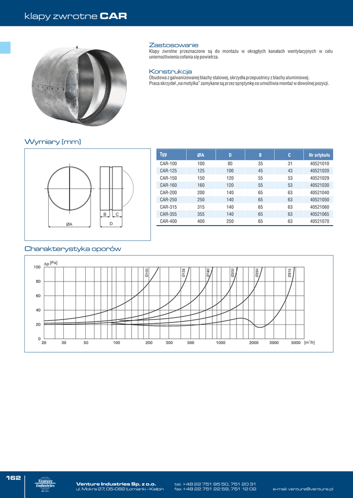 klapy zwrotne CAR Zastosowanie Klapy zwrotne przeznaczone są do montażu w okrągłych kanałach wentylacyjnych w celu uniemożliwienia cofania się powietrza. Konstrukcja Obudowa z galwanizowanej blachy stalowej, skrzydła przepustnicy z blachy aluminiowej. Praca skrzydeł „na motylka” zamykane są przez sprężynkę co umożliwia montaż w dowolnej pozycji. Wymiary [mm] B OA C D Typ OA D B C CAR-100 100 80 35 31 40521010 CAR-125 125 100 45 43 40521020 Nr artykułu CAR-150 150 120 55 53 40521029 CAR-160 160 120 55 53 40521030 CAR-200 200 140 65 63 40521040 CAR-250 250 140 65 63 40521050 CAR-315 315 140 65 63 40521060 CAR-355 355 140 65 63 40521065 CAR-400 400 250 65 63 40521070 Charakterystyka oporów [Pa] [m3/h] 162 Venture Industries Sp. z o.o. ul. Mokra 27, 05-092 Łomianki - Kiełpin tel. +48 22 751 95 50, 751 20 31 fax +48 22 751 22 59, 751 12 02 e-mail: [email protected]