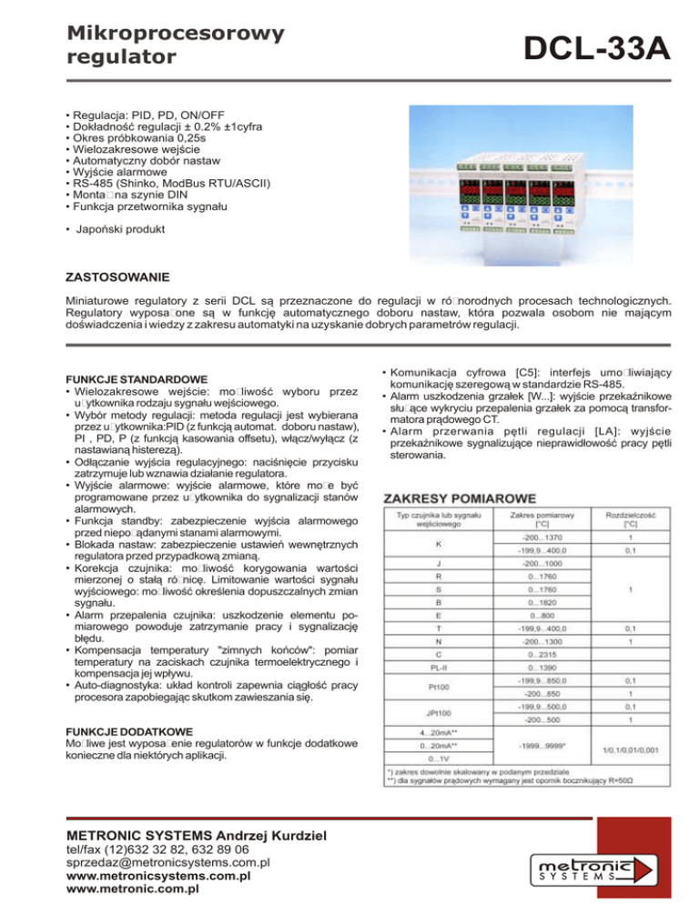 Mikroprocesorowy regulator DCL-33A • Regulacja: PID, PD, ON/OFF • Dokładność regulacji ± 0.2% ±1cyfra • Okres próbkowania 0,25s • Wielozakresowe wejście • Automatyczny dobór nastaw • Wyjście alarmowe • RS-485 (Shinko, ModBus RTU/ASCII) • Montaż na szynie DIN • Funkcja przetwornika sygnału • Japoński produkt ZASTOSOWANIE Miniaturowe regulatory z serii DCL są przeznaczone do regulacji w różnorodnych procesach technologicznych. Regulatory wyposażone są w funkcję automatycznego doboru nastaw, która pozwala osobom nie mającym doświadczenia i wiedzy z zakresu automatyki na uzyskanie dobrych parametrów regulacji. FUNKCJE STANDARDOWE • Wielozakresowe wejście: możliwość wyboru przez użytkownika rodzaju sygnału wejściowego. • Wybór metody regulacji: metoda regulacji jest wybierana przez użytkownika:PID (z funkcją automat. doboru nastaw), PI , PD, P (z funkcją kasowania offsetu), włącz/wyłącz (z nastawianą histerezą). • Odłączanie wyjścia regulacyjnego: naciśnięcie przycisku zatrzymuje lub wznawia działanie regulatora. • Wyjście alarmowe: wyjście alarmowe, które może być programowane przez użytkownika do sygnalizacji stanów alarmowych. • Funkcja standby: zabezpieczenie wyjścia alarmowego przed niepożądanymi stanami alarmowymi. • Blokada nastaw: zabezpieczenie ustawień wewnętrznych regulatora przed przypadkową zmianą. • Korekcja czujnika: możliwość korygowania wartości mierzonej o stałą różnicę. Limitowanie wartości sygnału wyjściowego: możliwość określenia dopuszczalnych zmian sygnału. • Alarm przepalenia czujnika: uszkodzenie elementu pomiarowego powoduje zatrzymanie pracy i sygnalizację błędu. • Kompensacja temperatury "zimnych końców": pomiar temperatury na zaciskach czujnika termoelektrycznego i kompensacja jej wpływu. • Auto-diagnostyka: układ kontroli zapewnia ciągłość pracy procesora zapobiegając skutkom zawieszania się. FUNKCJE DODATKOWE Możliwe jest wyposażenie regulatorów w funkcje dodatkowe konieczne dla niektórych aplikacji. METRONIC SYSTEMS Andrzej Kurdziel tel/fax (12)632 32 82, 632 89 06 [email protected] www.metronicsystems.com.pl www.metronic.com.pl • Komunikacja cyfrowa [C5]: interfejs umożliwiający komunikację szeregową w standardzie RS-485. • Alarm uszkodzenia grzałek [W...]: wyjście przekaźnikowe służące wykryciu przepalenia grzałek za pomocą transformatora prądowego CT. • Alarm przerwania pętli regulacji [LA]: wyjście przekaźnikowe sygnalizujące nieprawidłowość pracy pętli sterowania. Mikroprocesorowy regulator METRONIC SYSTEMS Andrzej Kurdziel tel/fax (12)632 32 82, 632 89 06 [email protected] www.metronicsystems.com.pl www.metronic.com.pl DCL-33A