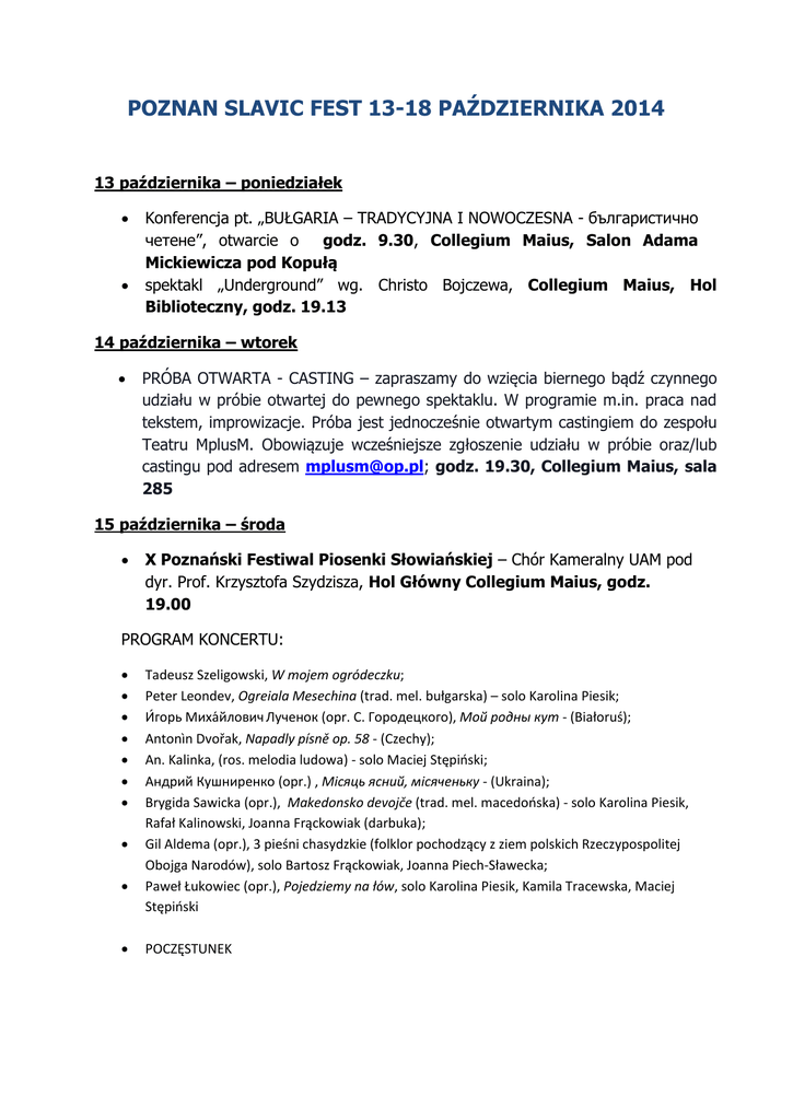 POZNAN SLAVIC FEST 13-18 PAŹDZIERNIKA 2014 13 października – poniedziałek Konferencja pt. „BUŁGARIA – TRADYCYJNA I NOWOCZESNA - българистично четене”, otwarcie o godz. 9.30, Collegium Maius, Salon Adama Mickiewicza pod Kopułą spektakl „Underground” wg. Christo Bojczewa, Collegium Maius, Hol Biblioteczny, godz. 19.13 14 października – wtorek PRÓBA OTWARTA - CASTING – zapraszamy do wzięcia biernego bądź czynnego udziału w próbie otwartej do pewnego spektaklu. W programie m.in. praca nad tekstem, improwizacje. Próba jest jednocześnie otwartym castingiem do zespołu Teatru MplusM. Obowiązuje wcześniejsze zgłoszenie udziału w próbie oraz/lub castingu pod adresem [email protected]; godz. 19.30, Collegium Maius, sala 285 15 października – środa X Poznański Festiwal Piosenki Słowiańskiej – Chór Kameralny UAM pod dyr. Prof. Krzysztofa Szydzisza, Hol Główny Collegium Maius, godz. 19.00 PROGRAM KONCERTU: Tadeusz Szeligowski, W mojem ogródeczku; Peter Leondev, Ogreiala Mesechina (trad. mel. bułgarska) – solo Karolina Piesik; Лу ен к (opr. C. Г децк ), Мой родны кут - (Białoruś); Antonìn Dvořak, Napadly písně op. 58 - (Czechy); An. Kalinka, (ros. melodia ludowa) - solo Maciej Stępiński; Анд Кушн енкo (opr.) , Мiсяць ясний, мiсяченьку - (Ukraina); Brygida Sawicka (opr.), Makedonsko devojče (trad. mel. macedońska) - solo Karolina Piesik, Rafał Kalinowski, Joanna Frąckowiak (darbuka); Gil Aldema (opr.), 3 pieśni chasydzkie (folklor pochodzący z ziem polskich Rzeczypospolitej Obojga Narodów), solo Bartosz Frąckowiak, Joanna Piech-Sławecka; Paweł Łukowiec (opr.), Pojedziemy na łów, solo Karolina Piesik, Kamila Tracewska, Maciej Stępiński POCZĘSTUNEK 16 października - czwartek Muzyczna podróż po Bałkanach, czyli projekcja „WHOSE IS THIS SONG?”, dokumentu muzycznego w reżyserii Adeli Peewej. Po projekcji odbędzie się panel dyskusyjny z uczestnictwem wolontariuszy EVS: Sary Bożinowej z Bułgarii i Ertugrula Oztekina z Turcji, godz. 18.00, Collegium Maius, sala 285 17 października - piątek Poznań Slavic Dzieciom – warsztaty z Golemem + wycieczka, początek, godz. 10.00, zakończenie ok. 12.00, Collegium Maius Bałkańskie hulanki i nóg wyrywanki – warsztaty tańców bałkańskich w kręgu, godz. 19.00-21.00, Collegium Maius, Sala teatralna 18 października – sobota Zabawa przy bałkańskich rytmach, bałkańskie potrawy do syta (dodatkowo płatne), od 19.00, Restauracja Wielkie Żarcie, ul. Zamkowa 7 FESTIWALOWI TOWARZYSZY WYSTAWA ZDJĘĆ STUDENTÓW SLAWISTYKI PT. ROMANI BALCANICE, HOL BIBLIOTECZNY COLLEGIUM MAIUS UAM, WEJŚCIE OD UL. H. KOWALCZYKA NA WSZYSTKIE WYDARZENIA FESTIWALU WSTĘP WOLNY PROGRAM KONFERENCJI: BUŁGARIA – TRADYCYJNA I NOWOCZESNA българистично четене 9:30 – 10:00 Przywitanie gości: Dyrektor Instytutu Filologii Słowiańskiej UAM prof. dr hab. Bogusław Zieliński Otwarcie konferencji: prof. dr hab. Mariola Walczak-Mikołajczakowa Kierownik Zakładu Języków Południowosłowiańskich UAM 10:00 – 11:30 PREZENTACJE – PROJEKTY – INSPIRACJE prof. dr hab. Petar Sotirov, dr Kamen Rikev (UMCS Lublin) Bułgarystyka na UMCS wobec wyzwań nowych czasów dr Iliana Genew-Puhalewa, dr Dorota Gołek-Sepetliewa (UŚ Katowice) Bułgarystyka w Instytucie Filologii Słowiańskiej UŚ prof. dr hab. Viara Maldjieva (UMK Toruń) Warsztaty translatorskie jako forma uczenia sztuki przekładu prof. dr hab. Mariola Walczak-Mikołajczakowa, dr Patryk Borowiak (UAM Poznań) Naukowe i popularyzatorskie projekty bułgarystyczne w Instytucie Filologii Słowiańskiej UAM PRZERWA 12:00 – 13:30 ZBLIŻENIA – W KRĘGU JĘZYKA dr Julia Mazurkiewicz-Sułkowska (UŁ Łódź) Bułgarsko-polskie tłumaczenia sądowe dr Natalia Długosz (UAM Poznań) E-ekshibicjonizm’ i ‘fejs-frustracja’ – o zmianach w komunikowaniu się na przykładzie najnowszych polskich i bułgarskich compositów z pierwszym członem obcym mgr Stojno Spasow (ПУ „Паисий Хилендарски” Пловдив) За българските фамилни имена, образувани от умалително-гальовни форми на личните имена (в съпоставка с полските) mgr Aleksandra Michalska (UAM Poznań) Od Uniwersytetu, poprzez Ambasadę, do Agencji Reklamowej PRZERWA OBIADOWA 14:30 – 16:00 ZBLIŻENIA – W KRĘGU KULTURY I LITERATURY prof. dr hab. Nikola Topuzov, prof. dr hab. Viara Maldjieva, Janka Michajłowa (UMK Toruń) България е малка, но хубава. Презентация на учебник по български език за чуждоезиково обучение mgr Dorota Trela (UJ Kraków) Współczesna poezja śpiewana - jej miejsce i rola na bułgarskiej scenie muzycznej mgr Dimitar Dimitrov (Югозападен Университет Благоевград) Роля и функция на кръчмата у Елин Пелин mgr Adriana Kovacheva (UAM Poznań) Konstanty Ildefons Gałczyński w zwierciadle przekładów Pyrwana Stefanowa PRZERWA 16:15 – 17:45 ZBLIŻENIA – W KRĘGU KULTURY I LITERATURY mgr Beata Świrzyńska (UMCS Lublin) Główne wątki w poezji Juliusza Rozenthala mgr Natalia Łozińska (UAM Poznań) Transformacja polityki kulturalnej Bułgarii po 1989 roku mgr Bartosz Klimczuk (UAM Poznań) W kleszczach ideologii. Literatura PRL i BRL wobec komunizmu mgr Dorota Sieczka (UAM Poznań, Teach me Polish) Czy jest życie po slawistyce? Przemyślenia absolwentki Konferencja została zorganizowana pod patronatem Bułgarskiego Instytutu Kultury.