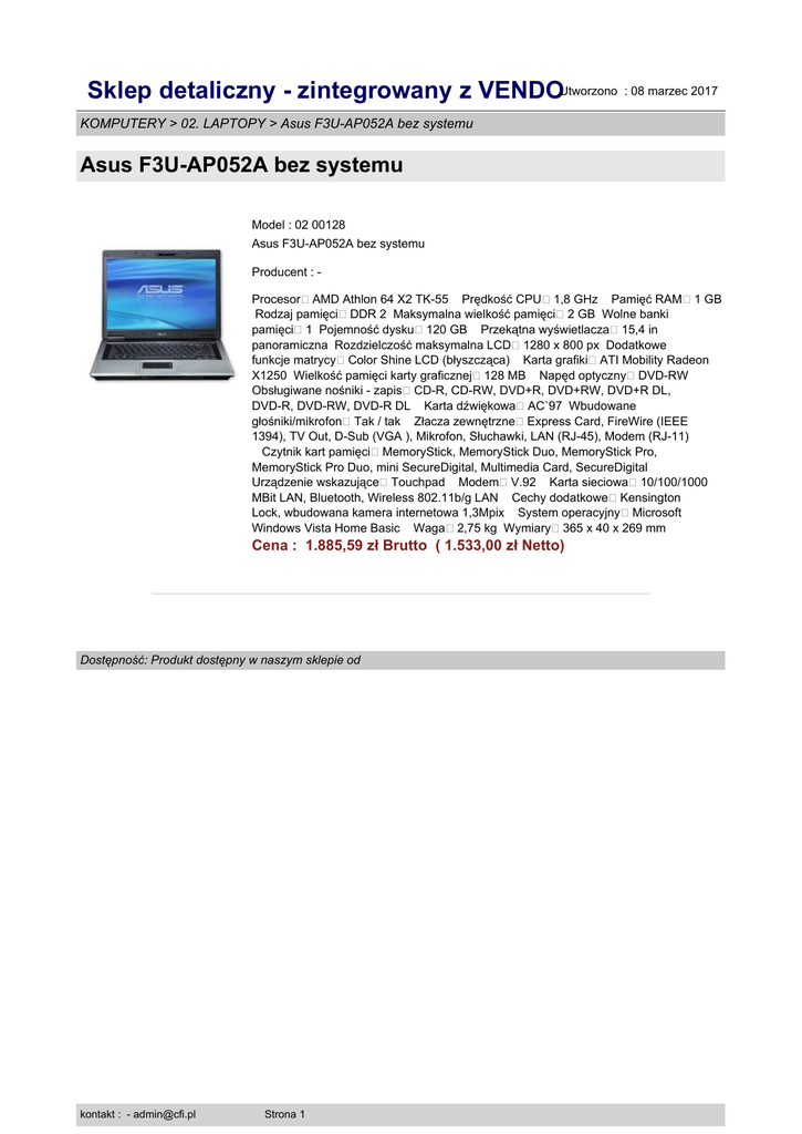 Sklep detaliczny - zintegrowany z VENDOUtworzono : 08 marzec 2017 KOMPUTERY > 02. LAPTOPY > Asus F3U-AP052A bez systemu Asus F3U-AP052A bez systemu Model : 02 00128 Asus F3U-AP052A bez systemu Producent : ProcesorAMD Athlon 64 X2 TK-55 Prędkość CPU1,8 GHz Pamięć RAM1 GB Rodzaj pamięciDDR 2 Maksymalna wielkość pamięci2 GB Wolne banki pamięci1 Pojemność dysku120 GB Przekątna wyświetlacza15,4 in panoramiczna Rozdzielczość maksymalna LCD1280 x 800 px Dodatkowe funkcje matrycyColor Shine LCD (błyszcząca) Karta grafikiATI Mobility Radeon X1250 Wielkość pamięci karty graficznej128 MB Napęd optycznyDVD-RW Obsługiwane nośniki - zapisCD-R, CD-RW, DVD+R, DVD+RW, DVD+R DL, DVD-R, DVD-RW, DVD-R DL Karta dźwiękowaAC`97 Wbudowane głośniki/mikrofonTak / tak Złacza zewnętrzneExpress Card, FireWire (IEEE 1394), TV Out, D-Sub (VGA ), Mikrofon, Słuchawki, LAN (RJ-45), Modem (RJ-11) Czytnik kart pamięciMemoryStick, MemoryStick Duo, MemoryStick Pro, MemoryStick Pro Duo, mini SecureDigital, Multimedia Card, SecureDigital Urządzenie wskazująceTouchpad ModemV.92 Karta sieciowa10/100/1000 MBit LAN, Bluetooth, Wireless 802.11b/g LAN Cechy dodatkoweKensington Lock, wbudowana kamera internetowa 1,3Mpix System operacyjnyMicrosoft Windows Vista Home Basic Waga2,75 kg Wymiary365 x 40 x 269 mm Cena : 1.885,59 zł Brutto ( 1.533,00 zł Netto) Dostępność: Produkt dostępny w naszym sklepie od kontakt : - [email protected] Strona 1