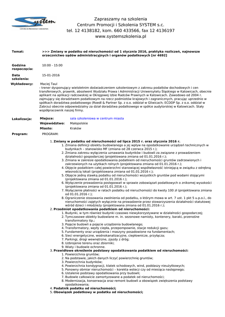 Zapraszamy na szkolenia Centrum Promocji i Szkolenia SYSTEM s.c. tel. 12 4138182, kom. 660 433566, fax 12 4136197 www.systemszkolenia.pl Temat: >>> Zmiany w podatku od nieruchomości od 1 stycznia 2016, praktyka rozliczeń, najnowsze orzecznictwo sądów administracyjnych i organów podatkowych [nr 4692] Godzina rozpoczęcia: 10:00 - 15:00 Data szkolenia: 15-01-2016 Wykładowcy: Lokalizacja: Program: Maciej MaciejTaul Taul - -trener trenerdysponujący dysponującywieloletnim wieloletnimdoświadczeniem doświadczeniemszkoleniowym szkoleniowymzzzakresu zakresupodatków podatkówdochodowych dochodowychi icen cen transferowych, transferowych,prawnik, prawnik,absolwent absolwentWydziału WydziałuPrawa Prawai iAdministracji AdministracjiUniwersytetu UniwersytetuŚląskiego ŚląskiegowwKatowicach, Katowicach,obecnie obecnie aplikant aplikantna naaplikacji aplikacjiradcowskiej radcowskiejwwOkręgowej OkręgowejIzbie IzbieRadców RadcówPrawnych PrawnychwwKatowicach. Katowicach.Zawodowo Zawodowood od2004 2004r.r. zajmujący zajmującysię siędoradztwem doradztwempodatkowym podatkowymna narzecz rzeczpodmiotów podmiotówkrajowych krajowychi izagranicznych, zagranicznych,pracując pracującuprzednio uprzednioww spółkach spółkachdoradztwa doradztwapodatkowego podatkowego(Roedl (Roedl&&Partner PartnerSp. Sp.zzo.o. o.o.oddział oddziałwwGliwicach; Gliwicach;ECDDP ECDDPSp. Sp.zzo.o. o.o.oddział oddziałww Zabrzu) Zabrzu)obecnie obecnieodpowiedzialny odpowiedzialnyza zadział działdoradztwa doradztwapodatkowego podatkowegowwspółce spółceaudytorskiej audytorskiejwwKatowicach. Katowicach.Stały Stały współpracownik współpracowniknaszej naszejfirmy. firmy. Miejsce: sala szkoleniowa ww centrum miasta Miejsce: sala szkoleniowa centrum miasta Województwo: Małopolskie Województwo: Małopolskie Miasto: Kraków Miasto: Kraków PROGRAM: 1. Zmiany w podatku od nieruchomości od lipca 2015 r. oraz stycznia 2016 r. 1. Zmiana definicji obiektu budowlanego a jej wpływ na opodatkowanie urządzeń technicznych w budynkach – stanowisko MF (zmiana od 28 czerwca 2015 r.); 2. Zmiana zakresu wyłączenia uznawania budynków i budowli za związane z prowadzeniem działalności gospodarczej (projektowana zmiana od 01.01.2016 r.); 3. Zmiana w zakresie opodatkowania podatkiem od nieruchomości gruntów zadrzewionych i zakrzewionych na użytkach rolnych (projektowana zmiana od 01.01.2016 r.); 4. Objęcie podatkiem całej powierzchni stanowiącej współwłasność istniejącą w związku z odrębną własnością lokali (projektowana zmiana od 01.01.2016 r.); 5. Objęcie jedną stawką podatku od nieruchomości wszystkich gruntów pod wodami stojącymi (projektowana zmiana od 01.01.2016 r.); 6. Wyłączenie prowadzenia postępowań w sprawie zobowiązań podatkowych o znikomej wysokości (projektowana zmiana od 01.01.2016 r.); 7. Wyłączenie płatności w ratach podatku od nieruchomości do kwoty 100 zł (projektowana zmiana od 01.01.2016 r.); 8. Ograniczenie stosowania zwolnienia od podatku, o którym mowa w art. 7 ust. 1 pkt 5 u.p.o.l., do nieruchomości zajętych wyłącznie na prowadzenie przez stowarzyszenia działalności statutowej wśród dzieci i młodzieży (projektowana zmiana od 01.01.2016 r.); 2. Przedmiot opodatkowania podatkiem od nieruchomości: 1. Budynki, w tym również budynki czasowo niewykorzystywane w działalności gospodarczej; 2. Tymczasowe obiekty budowlane m. in. sezonowe namioty, kontenery, baraki, przenośne transformatory itp.; 3. Pojęcie budowli a pojęcie urządzenia budowlanego; 4. Transformatory, węzły ciepła, przepompownie, stacje redukcji gazu; 5. Fundamenty oraz urządzenia i maszyny posadowione na fundamentach; 6. Sieci energetyczne, wodnokanalizacyjne, ciepłownicze, przyłącza; 7. Parkingi, drogi wewnętrzne, zjazdy z dróg; 8. Uzbrojenie terenu oraz zbiorniki; 9. Wiaty i budowle ochronne. 3. Prawidłowe określenie podstawy opodatkowania podatkiem od nieruchomości: 1. Powierzchnia gruntów; 2. Na podstawie, jakich danych liczyć powierzchnię gruntów; 3. Powierzchnia budynków; 4. Powierzchnia kondygnacji, klatek schodowych, wind, poddaszy nieużytkowych; 5. Ponowny obmiar nieruchomości – korekta wstecz czy od miesiąca następnego; 6. Ustalenie podstawy opodatkowania przy budowli; 7. Budowle całkowicie zamortyzowane a podatek od nieruchomości; 8. Modernizacja, konserwacja oraz remont budowli a obowiązek zwiększenia podstawy opodatkowania; 4. Podatnik podatku od nieruchomości; 5. Obowiązek podatkowy w podatku od nieruchomości; 1. Ogólne zasady powstawania podatku od nieruchomości; 2. Wybudowanie całości lub części nieruchomości (w pionie bądź w poziomie) a podatek; 3. Nabycie nieruchomości a obowiązek podatkowy; 4. Sprzedaż nieruchomości; 5. Likwidacja obiektu budowlanego; 6. Deklaracje w podatek od nieruchomości; 7. Termin zapłaty podatku. 6. Zwolnienia przedmiotowe i podmiotowe 1. Zwolnienia o charakterze podmiotowym; 2. Zwolnienia przedmiotowe; 3. Warunki i zakres wykorzystania zwolnień wynikający z orzecznictwa. 7. Ujęcie podatku od nieruchomości w rozliczeniu podatku dochodowego; 1. Podatek od nieruchomości, jako koszt; 2. Rozliczenia podatku od nieruchomości w czasie; 3. Zaległości w podatku od nieruchomości a koszty uzyskania przychodu; 4. Nadpłata w podatku od nieruchomości a przychód podatkowy; 8. Najnowsze orzecznictwo sądowo-administracyjne oraz organów podatkowych dotyczące podatku od nieruchomości. 9. Pytania indywidualne i odpowiedzi. Konsultacje. Forma szkolenia: Szkolenie o powyższej tematyce możemy zrealizować na Państwa potrzeby w formie szkolenia zamkniętego. Zainteresowane osoby prosimy o kontakt z naszym biurem tel. 12 413-81-82 Certyfikaty: Uczestnik otrzymuje certyfikat ukończenia szkolenia Cena: Liczba osób z jednej firmy Cena jedna osoba z firmy 390.00 netto zł./osobę (479.70 zł. brutto) dwie i więcej 360.00 netto zł./osobę (442.80 zł. brutto) UWAGA: opłata za szkolenie zwolni