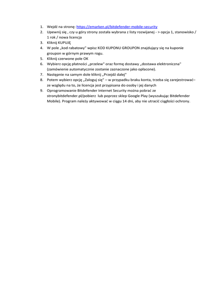 1. Wejdź na stronę: https://emarken.pl/bitdefender-mobile-security 2. Upewnij się , czy u góry strony została wybrana z listy rozwijanej - > opcja 1, stanowisko / 1 rok / nowa licencja 3. Kliknij KUPUJĘ 4. W pole „kod rabatowy" wpisz KOD KUPONU GROUPON znajdujący się na kuponie groupon w górnym prawym rogu. 5. Kliknij czerwone pole OK 6. Wybierz opcję płatności „przelew" oraz formę dostawy „dostawa elektroniczna" (zamówienie automatycznie zostanie zaznaczone jako opłacone). 7. Następnie na samym dole kliknij „Przejdź dalej" 8. Potem wybierz opcję „Zaloguj się" – w przypadku braku konta, trzeba się zarejestrować– ze względu na to, że licencja jest przypisana do osoby i jej danych 9. Oprogramowanie Bitdefender Internet Security można pobrać ze stronybitdefender.pl/pobierz lub poprzez sklep Google Play (wyszukując Bitdefender Mobile). Program należy aktywować w ciągu 14 dni, aby nie utracić ciągłości ochrony.
