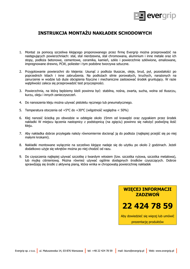 INSTRUKCJA MONTAŻU NAKŁADEK SCHODOWYCH 1. Montaż za pomocą szczeliwa klejącego proponowanego przez firmę Evergrip można przeprowadzić na następujących powierzchniach: stal, stal nierdzewna, stal chromowana, aluminium i inne metale oraz ich stopy, podłoża betonowe, cementowe, ceramika, kamień, szkło i powierzchnie szkliwione, emaliowane, impregnowane drewno, PCW, poliester i tym podobne tworzywa sztuczne. 2. Przygotowanie powierzchni do klejenia: Usunąć z podłoża tłuszcze, oleje, brud, pył, pozostałości po poprzednich kitach i inne zabrudzenia. Na podłożach silnie porowatych, kruchych, narażonych na zanurzenie w wodzie lub duże obciążenia fizyczne i mechaniczne zastosować środek gruntujący. W razie wątpliwości zaleca się przeprowadzić test przyczepności. 3. Powierzchnia, na którą będziemy kleili powinna być: stabilna, nośna, zwarta, sucha, wolna od tłuszczu, kurzu, oleju i innych zanieczyszczeń. 4. Do nanoszenia kleju można używać pistoletu ręcznego lub pneumatycznego. 5. Temperatura otoczenia od +5°C do +30°C (wilgotność względna < 50%) 6. Klej nanosić ścieżką po obwodzie w odstępie około 15mm od krawędzi oraz zygzakiem przez środek nakładki W miejscu łączenia nastopnicy z podstopnicą (na zgięciu) powinno się nałożyć podwójną ilość kleju. 7. Aby nakładka dobrze przylegała należy równomiernie docisnąć ją do podłoża (najlepiej przejść się po niej małymi krokami). 8. Nakładki montowane wyłącznie na szczeliwo klejące nadaje się do użytku po około 2 godzinach. Jeżeli dodatkowo użyje się wkrętów można po niej chodzić od razu. 9. Do czyszczenia najlepiej używać szczotkę z twardym włosiem (tzw. szczotka ryżowa, szczotka metalowa), lub myjkę ciśnieniową. Można również używać ogólnie dostępnych środków czyszczących. Dobrze sprawdzają się środki z aktywną pianą, która wnika w chropowatą powierzchnię nakładek WIĘCEJ INFORMACJI ZADZWOŃ 22 424 78 59 Aby dowiedzieć się więcej lub umówić prezentację produktów Evergrip sp. z o.o. ul. Matuszewska 14, 03-876 Warszawa tel: +48 22 424 78 59 mail: [email protected] Web: www.evergrip.pl