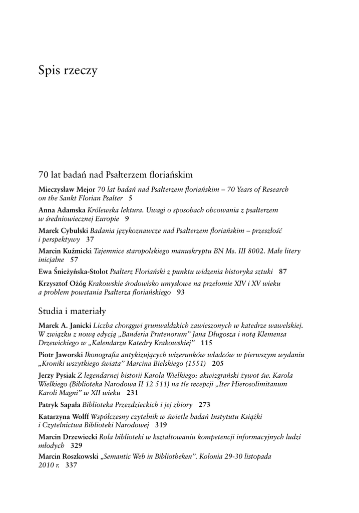 Spis rzeczy 70 lat badaƒ nad Psałterzem floriaƒskim Mieczysław Mejor 70 lat badaƒ nad Psałterzem floriaƒskim – 70 Years of Research on the Sankt Florian Psalter 5 Anna Adamska Królewska lektura. Uwagi o sposobach obcowania z psałterzem w Êredniowiecznej Europie 9 Marek Cybulski Badania j´zykoznawcze nad Psałterzem floriaƒskim – przeszłoÊç i perspektywy 37 Marcin Kuêmicki Tajemnice staropolskiego manuskryptu BN Ms. III 8002. Małe litery inicjalne 57 Ewa Ânie˝yƒska-Stolot Psałterz Floriaƒski z punktu widzenia historyka sztuki 87 Krzysztof O˝óg Krakowskie Êrodowisko umysłowe na przełomie XIV i XV wieku a problem powstania Psałterza floriaƒskiego 93 Studia i materiały Marek A. Janicki Liczba choràgwi grunwaldzkich zawieszonych w katedrze wawelskiej. W zwiàzku z nowà edycjà „Banderia Prutenorum” Jana Długosza i notà Klemensa Drzewickiego w „Kalendarzu Katedry Krakowskiej” 115 Piotr Jaworski Ikonografia antykizujàcych wizerunków władców w pierwszym wydaniu „Kroniki wszytkiego Êwiata” Marcina Bielskiego (1551) 205 Jerzy Pysiak Z legendarnej historii Karola Wielkiego: akwizgraƒski ˝ywot Êw. Karola Wielkiego (Biblioteka Narodowa II 12 511) na tle recepcji „Iter Hierosolimitanum Karoli Magni” w XII wieku 231 Patryk Sapała Biblioteka Przezdzieckich i jej zbiory 273 Katarzyna Wolff Współczesny czytelnik w Êwietle badaƒ Instytutu Ksià˝ki i Czytelnictwa Biblioteki Narodowej 319 Marcin Drzewiecki Rola biblioteki w kształtowaniu kompetencji informacyjnych ludzi młodych 329 Marcin Roszkowski „Semantic Web in Bibliotheken”. Kolonia 29-30 listopada 2010 r. 337 384 Spis rzeczy Recenzje i omówienia F. Sarıcıoğlu, C. Yılmaz, Müteferrika. Basmacı Ibrahim Efendi ve Müteferrika · Matbaası. Basmacı Ibrahim Efendi and the Müteferrika Press, Istanbul 2009 (Natalia Królikowska) 341 Polonika ze zbiorów Zamku Skokloster. Katalog, oprac. M. Eder przy współpracy E. Westin Berg, red. naukowa tomu D. Chemperek, Warszawa 2008 (Edward Ró˝ycki) 345 Polonika ze zbiorów Zamku Skokloster. Katalog, oprac. M. Eder przy współpracy E. Westin Berg, red. naukowa tomu D. Chemperek, Warszawa 2008 (Paulina Buchwald-Pelcowa) 350 I. Marszakowa Szajkiewicz, Badania iloÊciowe nauki: podejÊcie bibliometryczne i webometryczne, Poznaƒ 2009 (Bartłomiej Siek) 354 W. Boƒkowski, Dziewi´tnastowieczne edycje dzieł Fryderyka Chopina jako aspekt historii recepcji, Wrocław 2009 (Alina Màdry) 358 P. Rodak, Pismo, ksià˝ka, lektura. Rozmowy: Le Goff, Chartier, Hébrard, Fabre, Lejeune, Warszawa 2009 (Piotr Kanizy Morawski) 368 The Archive in Motion: New Conceptions of the Archive in Contemporary and New Media Practices, ed. by E. Røssaak, Oslo 2010 (Anna Wasilewska) 377 Contents 70 Years of Research on the Sankt Florian Psalter Mieczysław Mejor 70 Years of Research on the Sankt Florian Psalter 5 Anna Adamska Royal Reading Matter: Some Remarks on Dealing with the Psalter in Medieval Europe 9 Marek Cybulski Linguistic Studies on the Sankt Florian Psalter – the Past and Perspectives 37 Marcin Kuêmicki Secrets of the Old Polish Manuscript – National Library Ms. III 8002. The Initial Lowercase Letters 57 Ewa Ânie˝yƒska-Stolot The Sankt Florian Psalter From the Art Historian’s Perspective 87 Krzysztof O˝óg The Intellectual Circles in Kraków at the Turn of the Fourteenth and Fifteenth Centuries and the Problem of the Creation of the Sankt Florian Psalter 93 Studies and Materials Marek A. Janicki Regarding the Number of Grunwald Banners Hung in the Wawel Cathedral in Relation to the Banderia Prutenorum of Jan Długosz, and Klemens Drzewicki’s note in Kalendarz Katedry Krakowskiej 115 Piotr Jaworski Iconography of Antiquating Ruler’s Images in the First Edition of “Kronika wszytkiego Êwiata” of Marcin Bielski (1551) 205 Jerzy Pysiak From the Legendary History of Charlemagne: the Aachen Life of Saint Charlemagne (National Library II 12 511) on the Background of the Reception of the “Iter Hierosolimitanum Karoli Magni” in the Twelfth Century 231 Patryk Sapała Przezdziecki Library and its Collection 273 Katarzyna Wolff The Contemporary Reader in the Research of the Institute of the Book and Readership 319 Marcin Drzewiecki The Role of Libraries in the Development of Young People’s Information Competencies 329 Marcin Roszkowski The Semantic Web in Bibliotheken. Cologne (Germany) 29-30th November 2010 337 386 Contens Reviews F. Sarıcıoğlu, C. Yılmaz, Müteferrika. Basmacı Ibrahim Efendi ve Müteferrika · Matbaası. Basmacı Ibrahim Efendi and the Müteferrika Press, Istanbul 2009 (Natalia Królikowska) 341 Polonika ze zbiorów Zamku Skokloster. Katalog, oprac. M. Eder przy współpracy E. Westin Berg, red. naukowa tomu D. Chemperek, Warszawa 2008 (Edward Ró˝ycki) 345 Polonika ze zbiorów Zamku Skokloster. Katalog, oprac. M. Eder przy współpracy E. Westin Berg, red. naukowa tomu D. Chemperek, Warszawa 2008 (Paulina Buchwald-Pelcowa) 350 I. Marszakowa Szajkiewicz, Badania iloÊciowe nauki: podejÊcie bibliometryczne i webometryczne, Poznaƒ 2009 (Bartłomiej Siek) 354 W. Boƒkowski, Dziewi´tnastowieczne edycje dzieł Fryderyka Chopina jako aspekt historii recepcji, Wrocław 2009 (Alina Màdry) 358 P. Rodak, Pismo, ksià˝ka, lektura. Rozmowy: Le Goff, Chartier, Hébrard, Fabre, Lejeune, Warszawa 2009 (Piotr Kanizy Morawski) 368 The Archive in Motion: New Conceptions of the Archive in Contemporary and New Media Practices, ed. by E. Røssaak, Oslo 2010 (Anna Wasilewska) 377