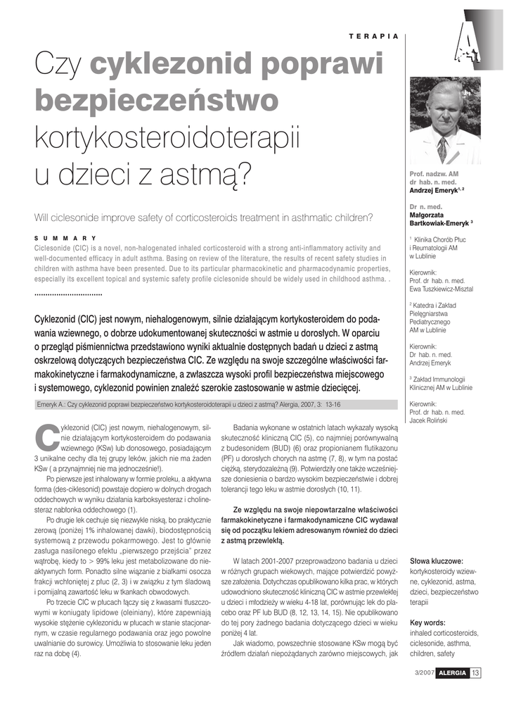 T E R A P I A Czy cyklezonid poprawi bezpieczeństwo kortykosteroidoterapii u dzieci z astmą? Will ciclesonide improve safety of corticosteroids treatment in asthmatic children? S U M M A R Y Ciclesonide (CIC) is a novel, non-halogenated inhaled corticosteroid with a strong anti-inflammatory activity and well-documented efficacy in adult asthma. Basing on review of the literature, the results of recent safety studies in children with asthma have been presented. Due to its particular pharmacokinetic and pharmacodynamic properties, especially its excellent topical and systemic safety profile ciclesonide should be widely used in childhood asthma. . ............................... Cyklezonid (CIC) jest nowym, niehalogenowym, silnie działającym kortykosteroidem do podawania wziewnego, o dobrze udokumentowanej skuteczności w astmie u dorosłych. W oparciu o przegląd piśmiennictwa przedstawiono wyniki aktualnie dostępnych badań u dzieci z astmą oskrzelową dotyczących bezpieczeństwa CIC. Ze względu na swoje szczególne właściwości farmakokinetyczne i farmakodynamiczne, a zwłaszcza wysoki profil bezpieczeństwa miejscowego i systemowego, cyklezonid powinien znaleźć szerokie zastosowanie w astmie dziecięcej. Emeryk A.: Czy cyklezonid poprawi bezpieczeństwo kortykosteroidoterapii u dzieci z astmą? Alergia, 2007, 3: 13-16 C yklezonid (CIC) jest nowym, niehalogenowym, silnie działającym kortykosteroidem do podawania wziewnego (KSw) lub donosowego, posiadającym 3 unikalne cechy dla tej grupy leków, jakich nie ma żaden KSw ( a przynajmniej nie ma jednocześnie!). Po pierwsze jest inhalowany w formie proleku, a aktywna forma (des-ciklesonid) powstaje dopiero w dolnych drogach oddechowych w wyniku działania karboksyesteraz i cholinesteraz nabłonka oddechowego (1). Po drugie lek cechuje się niezwykle niską, bo praktycznie zerową (poniżej 1% inhalowanej dawki), biodostępnością systemową z przewodu pokarmowego. Jest to głównie zasługa nasilonego efektu „pierwszego przejścia” przez wątrobę, kiedy to > 99% leku jest metabolizowane do nieaktywnych form. Ponadto silne wiązanie z białkami osocza frakcji wchłoniętej z płuc (2, 3) i w związku z tym śladową i pomijalną zawartość leku w tkankach obwodowych. Po trzecie CIC w płucach łączy się z kwasami tłuszczowymi w koniugaty lipidowe (oleiniany), które zapewniają wysokie stężenie cyklezonidu w płucach w stanie stacjonarnym, w czasie regularnego podawania oraz jego powolne uwalnianie do surowicy. Umożliwia to stosowanie leku jeden raz na dobę (4). Prof. nadzw. AM dr hab. n. med. Andrzej Emeryk1, 2 Dr n. med. Małgorzata Bartkowiak-Emeryk 3 1 Klinika Chorób Płuc i Reumatologii AM w Lublinie Kierownik: Prof. dr hab. n. med. Ewa Tuszkiewicz-Misztal 2 Katedra i Zakład Pielęgniarstwa Pediatrycznego AM w Lublinie Kierownik: Dr hab. n. med. Andrzej Emeryk 3 Zakład Immunologii Klinicznej AM w Lublinie Kierownik: Prof. dr hab. n. med. Jacek Roliński Badania wykonane w ostatnich latach wykazały wysoką skuteczność kliniczną CIC (5), co najmniej porównywalną z budesonidem (BUD) (6) oraz propionianem flutikazonu (PF) u dorosłych chorych na astmę (7, 8), w tym na postać ciężką, sterydozależną (9). Potwierdziły one także wcześniejsze doniesienia o bardzo wysokim bezpieczeństwie i dobrej tolerancji tego leku w astmie dorosłych (10, 11). Ze względu na swoje niepowtarzalne właściwości farmakokinetyczne i farmakodynamiczne CIC wydawał się od początku lekiem adresowanym również do dzieci z astmą przewlekłą. W latach 2001-2007 przeprowadzono badania u dzieci w różnych grupach wiekowych, mające potwierdzić powyższe założenia. Dotychczas opublikowano kilka prac, w których udowodniono skuteczność kliniczną CIC w astmie przewlekłej u dzieci i młodzieży w wieku 4-18 lat, porównując lek do placebo oraz PF lub BUD (8, 12, 13, 14, 15). Nie opublikowano do tej pory żadnego badania dotyczącego dzieci w wieku poniżej 4 lat. Jak wiadomo, powszechnie stosowane KSw mogą być źródłem działań niepożądanych zarówno miejscowych, jak Słowa kluczowe: kortykosteroidy wziewne, cyklezonid, astma, dzieci, bezpieczeństwo terapii Key words: inhaled corticosteroids, ciclesonide, asthma, children, safety 3/2007 ALERGIA 13 T E R A P I A i układowych (16). O zakresie i częstości tych działań decyduje wiele elementów: właściwości farmakokinetyczne i farmakodynamiczne leku, rodzaj inhalatora, stosowana przez chorego technika inhalacji, wielkość dawki, czas stosowania leku, podatność chorego i szereg innych czynników (17, 18). Aktualne poglądy na temat możliwych działań niepożądanych u dzieci leczonych KSw z powodu astmy przewlekłej przedstawiono w niedawno opublikowanych opracowaniach (19, 20). 1 TABELA Odsetek objawów ubocznych wymagających terapii (TEAEs) oraz objawów ubocznych prawdopodobnie związanych ze stosowanym lekiem (PAEs) w poszczególnych grupach terapeutycznych (13). Odsetek chorych w % Placebo n=257 CIC 40 n=255 CIC 80 n=260 CIC 160 n=253 Razem n=768 Chorzy z TEAEs 69,6 62,0 61,5 69,2 64,2 Chorzy z PAEs 1,2 3,1 3,6 4,3 2,9 Celem niniejszej publikacji było omówienie wyników aktualnie dostępnych badań na temat bezpieczeństwa i tolerancji CIC u dzieci. Posłużono się przeglądem piśmiennictwa, 5 w oparciu o najważniejsze bazy medyczne. We wszystkich omawianych poniżej badaniach CIC u dzieci był inhalowany z inhalatora ciśnieniowego z dozownikiem (pMDI), w którym lek występował w postaci roztworu z nośnikiem hyrofluorokalkanowym (pMDI-HFA), w części badań w połączeniu z komorą inhalacyjną typu Aerochamber Plus™. Miejscowe działania niepożądane Lokalna depozycja KSw w obrębie górnych dróg oddechowych jest odpowiedzialna za efekt podrażnienia, kaszlu, chrypki i rozwoju zakażenia Candida albicans. Częstość występowania miejscowych działań niepożądanych szacowana jest nawet do 50% dzieci leczonych KSw. Drożdż