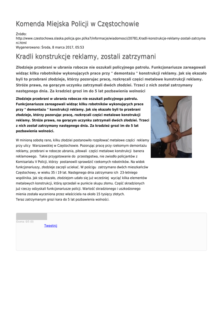 Komenda Miejska Policji w Częstochowie Źródło: http://www.czestochowa.slaska.policja.gov.pl/ka7/informacje/wiadomosci/20781,Kradli-konstrukcje-reklamy-zostali-zatrzyma ni.html Wygenerowano: Środa, 8 marca 2017, 05:53 Kradli konstrukcje reklamy, zostali zatrzymani Złodzieje przebrani w ubrania robocze nie oszukali policyjnego patrolu. Funkcjonariusze zareagowali widząc kilku robotników wykonujących prace przy " demontażu " konstrukcji reklamy. Jak się okazało byli to przebrani złodzieje, którzy pozorujac pracę, rozkręcali części metalowe kunstrukcji reklamy. Stróże prawa, na gorącym uczynku zatrzymali dwóch złodziei. Trzeci z nich został zatrzymany następnego dnia. Za kradzież grozi im do 5 lat pozbawienia wolności Złodzieje przebrani w ubrania robocze nie oszukali policyjnego patrolu. Funkcjonariusze zareagowali widząc kilku robotników wykonujących prace przy " demontażu " konstrukcji reklamy. Jak się okazało byli to przebrani złodzieje, którzy pozorując pracę, rozkręcali części metalowe konstrukcji reklamy. Stróże prawa, na gorącym uczynku zatrzymali dwóch złodziei. Trzeci z nich został zatrzymany następnego dnia. Za kradzież grozi im do 5 lat pozbawienia wolności. W minioną sobotę rano, kilku złodziei postanowiło rozpiłować metalowe części reklamy przy ulicy Warszawskiej w Częstochowie. Pozorując pracę przy rzekomym demontażu reklamy, przebrani w robocze ubrania, piłowali części metalowe konstrukcji banera reklamowego. Takie przygotowanie do przestępstwa, nie zwiodło policjantów z Komisariatu V Policji, którzy postanowili sprawdzić rzekomych robotników. Na widok funkcjonariuszy, złodzieje zaczęli uciekać. W pościgu zatrzymano dwóch mieszkańców Częstochowy, w wieku 35 i 19 lat. Następnego dnia zatrzymano ich 23-letniego wspólnika. Jak się okazało, złodziejom udało się już wcześniej wyciąć kilka elementów metalowych konstrukcji, którą sprzedali w punkcie skupu złomu. Część skradzionych już rzeczy odzyskali funkcjonariusze policji. Wartość skradzionego i uszkodzonego mienia została wyceniona przez właściciela na około 15 tysięcy złotych. Teraz zatrzymanym grozi kara do 5 lat pozbawienia wolności. Ocena: 0/5 (0) Tweetnij