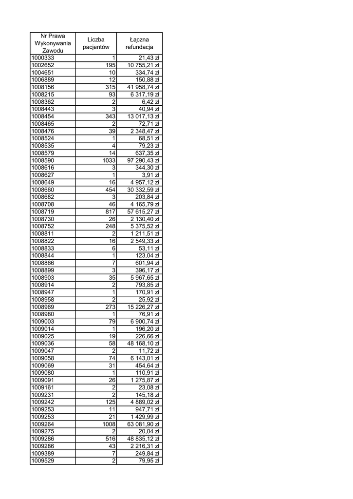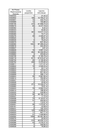 Nr Prawa Wykonywania Zawodu 1000333 1002652 1004651 1006889 1008156 1008215 1008362 1008443 1008454 1008465 1008476 1008524 1008535 1008579 1008590 1008616 1008627 1008649 1008660 1008682 1008708 1008719 1008730 1008752 1008811 1008822 1008833 1008844 1008866 1008899 1008903 1008914 1008947 1008958 1008969 1008980 1009003 1009014 1009025 1009036 1009047 1009058 1009069 1009080 1009091 1009161 1009231 1009242 1009253 1009253 1009264 1009275 1009286 1009286 1009389 1009529 Liczba pacjentów 1 195 10 12 315 93 2 3 343 2 39 1 4 14 1033 3 1 16 454 3 46 817 26 248 2 16 6 1 7 3 35 2 1 2 273 1 79 1 19 58 2 74 31 1 26 2 2 125 11 21 1008 2 516 43 7 2 Łączna refundacja 21,43 zł 10 755,21 zł 334,74 zł 150,88 zł 41 958,74 zł 6 317,19 zł 6,42 zł 40,94 zł 13 017,13 zł 72,71 zł 2 348,47 zł 68,51 zł 79,23 zł 637,35 zł 97 290,43 zł 344,30 zł 3,91 zł 4 957,12 zł 30 332,59 zł 203,84 zł 4 165,79 zł 57 615,27 zł 2 130,40 zł 5 375,52 zł 1 211,51 zł 2 549,33 zł 53,11 zł 123,04 zł 601,94 zł 396,17 zł 5 967,65 zł 793,85 zł 170,91 zł 25,92 zł 15 226,27 zł 76,91 zł 6 900,74 zł 196,20 zł 226,66 zł 48 168,10 zł 11,72 zł 6 143,01 zł 454,64 zł 110,91 zł 1 275,87 zł 23,08 zł 145,18 zł 4 889,02 zł 947,71 zł 1 429,99 zł 63 081,90 zł 20,04 zł 48 835,12 zł 2 216,31 zł 249,84 zł 79,95 zł 1009551 1009573 1009676 1009757 1009816 1009849 1009871 1009882 1009919 1010178 1010270 1010281 1010421 1010730 1011529 1011827 1030012 1030045 1030056 1030067 1030089 1030104 1030126 1030137 1030192 1030229 1030251 1030273 1030321 1030343 1030354 1030365 1030402 1030424 1030435 1030446 1030457 1030479 1030505 1030582 1030593 1030619 1030630 1030663 1030685 1030696 1030700 1030711 1030755 1030766 1030777 1030803 1030814 1030836 1030847 1030869 1030880 1030939 1030983 34 14 39 44 41 2 3 46 9 1 11 18 854 100 4 60 21 2 384 2 1 2 9 36 1 3 4 2 114 1 5 3 130 205 3 1 1 2 2 1 2 108 1 1 2 2198 8 3 114 1151 854 3 56 10 2 2 9 9 1 1 814,82 zł 244,29 zł 469,17 zł 3 782,53 zł 2 047,58 zł 99,18 zł 85,48 zł 3 534,91 zł 358,72 zł 12,46 zł 143,68 zł 903,51 zł 59 256,30 zł 5 381,25 zł 47,48 zł 18 362,67 zł 785,18 zł 83,64 zł 114 265,79 zł 315,16 zł 5,88 zł 2 522,66 zł 241,49 zł 1 577,29 zł 13,36 zł 95,69 zł 121,03 zł 50,16 zł 13 391,69 zł 15,83 zł 413,78 zł 35,00 zł 23 046,59 zł 9 509,47 zł 113,65 zł 773,23 zł 308,01 zł 124,32 zł 73,66 zł 60,52 zł 93,27 zł 4 474,92 zł 43,30 zł 306,47 zł 334,26 zł 127 632,62 zł 525,54 zł 219,98 zł 3 003,37 zł 98 898,31 zł 48 444,74 zł 769,19 zł 4 560,72 zł 968,28 zł 285,82 zł 310,83 zł 261,14 zł 441,28 zł 24,92 zł 1031006 1031083 1031094 1031131 1031142 1031164 1031245 1031267 1031440 1031495 1031521 1031565 1031602 1031657 1031771 1031874 1031966 1031977 1031999 1032033 1032044 1032066 1032099 1032180 1032217 1032228 1033303 1033369 1033483 1033494 1033509 1033520 1033531 1033542 1033597 1033601 1033748 1033759 1033818 1033840 1033851 1033921 1033954 1033976 1033976 1034010 1034032 1036292 1036307 1037312 1040019 1040030 1040074 1041230 1041311 1041399 1041701 1041940 1041995 1 1 10 535 4 2 1 1 2 1 2 1 3 7 1 6 15 1 2 4 4 1129 805 3 1 1 1 2 1 7 1 2 2 2 1 4 259 42 4 1 2 1 1 1 2 31 57 1 1 38 22 62 3 30 501 448 472 60 38 45,71 zł 43,55 zł 394,43 zł 33 766,22 zł 159,13 zł 245,69 zł 55,72 zł 23,24 zł 560,16 zł 33,34 zł 199,28 zł 66,85 zł 813,70 zł 131,74 zł 14,12 zł 5 723,83 zł 6 618,75 zł 14,55 zł 2 374,62 zł 141,56 zł 161,69 zł 74 821,33 zł 39 178,91 zł 1 823,81 zł 19,68 zł 602,44 zł 2 096,74 zł 216,60 zł 577,76 zł 105,97 zł 43,64 zł 1 151,40 zł 336,89 zł 12,79 zł 28,72 zł 724,97 zł 116 084,25 zł 3 483,14 zł 512,83 zł 19,10 zł 272,46 zł 35,28 zł 12,76 zł 55,20 zł 424,98 zł 911,64 zł 36 787,00 zł 55,51 zł 12,40 zł 9 005,22 zł 566,92 zł 1 299,66 zł 302,84 zł 3 943,41 zł 31 886,75 zł 72 976,47 zł 125 174,22 zł 2 373,45 zł 745,36 zł 1042224 1042441 1042522 1042680 1042842 1043012 1043045 1043148 1043240 1043310 1043413 1043972 1044164 1044705 1044771 1045217 1045250 1045489 1045629 1045695 1045890 1046211 1046255 1046417 1046428 1046472 1046542 1046678 1046895 1046910 1046965 1047087 1047102 1047124 1047157 1047628 1047694 1047731 1047823 1047867 1048151 1048493 1048703 1048769 1048942 1048964 1048975 1049053 1049454 1049476 1049535 1049546 1049605 1049627 1049855 1049925 1050004 1050026 1050048 168 271 53 62 2 599 165 57 56 665 66 216 178 45 8 404 11 1 7 473 27 77 31 20 81 88 754 3 1 1565 89 85 3 106 24 181 136 17 418 131 7 12 54 61 730 26 18 51 5 110 42 461 17 206 5 239 579 470 8 14 705,43 zł 12 729,29 zł 2 050,35 zł 1 647,05 zł 35,07 zł 76 995,42 zł 5 936,17 zł 9 207,15 zł 1 072,31 zł 20 676,78 zł 6 887,82 zł 6 507,64 zł 10 783,23 zł 3 704,48 zł 111,15 zł 14 617,60 zł 220,78 zł 8,87 zł 1 368,45 zł 31 750,93 zł 825,67 zł 3 528,32 zł 1 845,05 zł 970,77 zł 974,03 zł 5 309,09 zł 292 679,85 zł 246,80 zł 17,00 zł 133 107,31 zł 17 059,97 zł 13 279,11 zł 96,11 zł 9 936,91 zł 886,73 zł 8 254,23 zł 4 214,94 zł 606,05 zł 22 551,21 zł 7 489,37 zł 604,04 zł 1 155,54 zł 7 266,24 zł 4 593,11 zł 45 151,58 zł 855,49 zł 1 712,95 zł 883,25 zł 79,89 zł 8 219,84 zł 3 201,63 zł 77 222,63 zł 901,24 zł 6 636,13 zł 268,41 zł 3 913,41 zł 35 942,58 zł 23 834,22 zł 151,59 zł 1050405 1051774 1051914 1051991 1053063 1053155 1053523 1056413 1056490 1056538 1058721 1058949 1059840 1061211 1061233 1061325 1061336 1061667 1061678 1062411 1062433 1062455 1062477 1062488 1062915 1062970 1063162 1063243 1063265 1063287 1063471 1064009 1064101 1064708 1065003 1065025 1065058 1065080 1065275 1065286 1065459 1065492 1065529 1065551 1065595 1065963 1066041 1066100 1066133 1066328 1066501 1066968 1067127 1067517 1067892 1068095 1068408 1068419 1068658 9 7 748 50 9 92 1 13 1067 79 2 6 17 825 912 1224 883 2 1078 826 432 129 86 499 69 16 12 21 303 35 19 11 100 865 20 136 468 423 1 67 4 619 4 11 1 69 8 857 180 21 398 2 89 40 7 1 1197 115 44 291,4