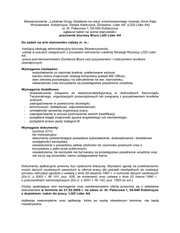 Stowarzyszenie ,,Lokalnej Grupy Działania na rzecz zrównoważonego rozwoju Gmin Kąty Wrocławskie, Kobierzyce, Święta Katarzyna, Żórawina- Lider A4” (LGD Lider A4) ul. Al. Pałacowa 1, 55-040 Kobierzyce ogłasza nabór na wolne stanowisko: pracownik biurowy Biura LGD Lider A4 Do zadań na w/w stanowisku należy m. in.: -bieżącą obsługę administracyjno-biurową Stowarzyszenia; -udział w pracach związanych z procesem wdrożenia Lokalnej Strategii Rozwoju LGD Lider A4; -praca pod kierownictwem Dyrektora Biura nad pozyskaniem i rozliczeniem środków zewnętrznych; Wymagania niezbędne: wykształcenie co najmniej średnie, preferowane wyższe; bardzo dobra znajomość obsługi komputera (pakiet MS Office); stan zdrowia pozwalający na zatrudnienie na ww. stanowisku; niekaralność oraz korzystanie za przestępstwa popełnione umyślnie; Wymagania dodatkowe: doświadczenie związane ze stażem/praktyką/pracą w Jednostkach Samorządu Terytorialnego, organizacjach pozarządowych lub związaną z pozyskiwaniem środków unijnych; zaangażowanie w powierzone obowiązki; - terminowość, dokładność, odpowiedzialność; - umiejętność sprawnej organizacji pracy; - zaangażowanie w proces podnoszenia swoich kwalifikacji; - pożądana biegła znajomość języka angielskiego lub niemieckiego; - pożądane prawo jazdy kategorii B. Wymagane dokumenty: życiorys (CV); list motywacyjny; dokumenty potwierdzające posiadane wykształcenie, doświadczenie i dodatkowe umiejętności kandydata; oświadczenie o posiadaniu pełnej zdolności do czynności prawnych oraz o korzystaniu z pełni praw publicznych; oświadczenie, że kandydat nie był karany za przestępstwo popełnione umyślnie oraz nie toczy się przeciwko niemu postępowanie karne. Dokumenty aplikacyjne powinny być opatrzone klauzulą: Wyrażam zgodę na przetwarzanie moich danych osobowych zawartych w ofercie pracy dla potrzeb niezbędnych do realizacji procesu rekrutacji zgodnie z ustawą z dnia 29 sierpnia 1997 r. o ochronie danych osobowych (Dz.U. z 2002 r. Nr 101, poz. 926, ze zmianami) oraz ustawą z dnia 22 marca 1990 r. o pracownikach samorządowych (Dz.U. z 2001 r. Nr 142, poz. 1593 ze zm.) Osoby spełniające w/w wymagania oraz zainteresowane ofertą proszone są o składanie dokumentów w terminie do 21.02.2009 r. na adres ul. Al. Pałacowa 1, 55-040 Kobierzyce z dopiskiem: nabór do pracy- LGD Lider A4. Aplikacje niekompletne oraz aplikacje, które po wyżej określonym terminie, nie będą rozpatrywane.