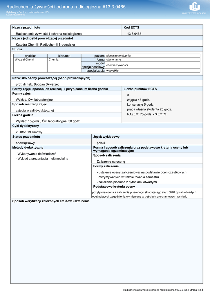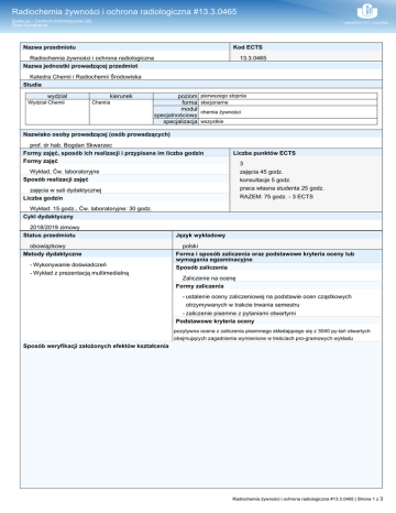 Radiochemia żywności i ochrona radiologiczna #13.3.0465 Sylabusy - Centrum Informatyczne UG Dział Kształcenia Nazwa przedmiotu Kod ECTS Radiochemia żywności i ochrona radiologiczna Nazwa jednostki prowadzącej przedmiot 13.3.0465 Katedra Chemii i Radiochemii Środowiska Studia wydział Wydział Chemii kierunek Chemia poziom forma moduł specjalnościowy specjalizacja pierwszego stopnia stacjonarne chemia żywności wszystkie Nazwisko osoby prowadzącej (osób prowadzących) prof. dr hab. Bogdan Skwarzec Formy zajęć, sposób ich realizacji i przypisana im liczba godzin Formy zajęć Liczba punktów ECTS 3 zajęcia 45 godz. konsultacje 5 godz. praca własna studenta 25 godz. RAZEM: 75 godz. - 3 ECTS Wykład, Ćw. laboratoryjne Sposób realizacji zajęć zajęcia w sali dydaktycznej Liczba godzin Wykład: 15 godz., Ćw. laboratoryjne: 30 godz. Cykl dydaktyczny 2018/2019 zimowy Status przedmiotu obowiązkowy Metody dydaktyczne - Wykonywanie doświadczeń - Wykład z prezentacją multimedialną Język wykładowy polski Forma i sposób zaliczenia oraz podstawowe kryteria oceny lub wymagania egzaminacyjne Sposób zaliczenia Zaliczenie na ocenę Formy zaliczenia - ustalenie oceny zaliczeniowej na podstawie ocen cząstkowych otrzymywanych w trakcie trwania semestru - zaliczenie pisemne z pytaniami otwartymi Podstawowe kryteria oceny pozytywna ocena z zaliczenia pisemnego składającego się z 3040 py-tań otwartych obejmujących zagadnienia wymienione w treściach pro-gramowych wykładu Sposób weryfikacji założonych efektów kształcenia Radiochemia żywności i ochrona radiologiczna #13.3.0465 | Strona 1 z 3 Radiochemia żywności i ochrona radiologiczna #13.3.0465 Sylabusy - Centrum Informatyczne UG Dział Kształcenia Sposób weryfikacji przyswojenia wiedzy: Podczas pytań zaliczeniowych sprawdzana jest wiedza studenta, czy zna i rozumie podstawowe pojęcia związane z radiochemią, radiologią i radiotoksycznością, posiada wiedzę na temat wpływu promieniowania jonizującego na materię żywą (K_W02); zna naturalne oraz sztuczne pierwiastki promieniotwórcze w środowisku i źródła ich pochodzenia, rozumie pojęcie radiotoksyczności i zna jej grupy, posiada wiedzę o źródłach pochodzenia radionuklidów w organizmie człowieka, rozumie radiologiczne skutki pobierania radionuklidów przez człowieka w wyniku oddychania, spożywania pokarmów i palenia papierosów, wie jakie są radiologiczne skutki zawartości radionuklidów w materiałach budowlanych (K_W05) i zna radiologiczne skutki katastrof w elektrowniach jądrowych w Czarnobylu i Fukushimie, posiada wiedze o radiochemicznych zagrożeniach środowiska i ludzi wokół hałdy fosfogipsów w Wiślince, zna cele i zadania monitoringu skażeń radioaktywnych środowiska (K_W11). Sposób weryfikacji nabycia umiejętności: Podczas zajęć laboratoryjnych sprawdzane są przez prowadzącego zajęcia (obserwacja, pytania i organizacja stanowiska pracy) umiejętności studenta dotyczące zrozumienia podstawowych pojęć z radiochemii i radiotoksykologii oraz rozpoznawania najważniejszych naturalnych i sztucznych radionuklidów zawartych w człowieku (K_U04), czy umie oszacować skutki radiologiczne wchłonięcia przez człowieka radionuklidów z powietrza, wody i żywności oraz w wyniku palenia papierosów, potrafi ocenić wpływ materiałów budowlanych na dawkę radiacyjną pochodzącą z inhalacji radonu i widzi potrzebę wprowadzenia normy radonowej (K_U02) i czy potrafi ocenić najważniejsze radioaktywne zagrożenia dla człowieka i zna sposoby ich ograniczenia, potrafi ocenić zagrożenia radiologiczne powstałe w wyniku lokalnej, lub globalnej kontaminacji radioaktywności (K_U08). Sposób weryfikacji nabrania kompetencji społecznych: Student podczas konsultacji z prowadzącym zajęcia oraz rozmów z innymi studentami pogłębia swoją wiedzę ze studiowanego przedmiotu (K_K01 przygotowanie do zaliczeń); ma świadomość w jakis sposób ograniczać wchłanianie radionuklidów przez człowieka (K_K08) oraz uświadamia społeczeństwo (m.in. rozmowy z kolegami)o skutkach nadmiernej inkorporacji radionuklidów, potrafi przekazywać wiedzę w społeczeństwie o źródłach skażeń radiochemicznych w materiałach budowlanych (K_K07) Określenie przedmiotów wprowadzających wraz z wymogami wstępnymi A. Wymagania formalne chemia analityczna B. Wymagania wstępne brak Cele kształcenia • zapoznanie studentów z wszystkimi zagadnieniami wymienionymi w treściach programowych wykładu, Treści programowe A. Problematyka wykładu: Pierwiastki promieniotwórcze w przyrodzie. Dawki promieniowania jonizującego. Radiotoksyczność i jej grupy. Źródła skażeń promieniotwórczych w środowisku naturalnym. Wchłanianie przez człowieka radionuklidów z powietrza, pokarmu i wody oraz ocena dawek radiacyjnych. Radiologiczne skutki palenia papierosów. Wpływ katastrof w elektrowniach jądrowych w Czarnoby-lu i Fukushimie na radioaktywne skażenie żywności. Radioaktywność materiałów budowlanych. Radioaktywność hałdy fosfo-gipsów w Wiślince i jej wpływ na środowisko i ludzi. Monitoring skażeń promieniotwórczych. B. Problematyka ćwiczeń laboratoryjnych: pobieranie próbek żywności do analizy radiochemicznej, mineralizacja próbek żywności, rozdzielanie i separacja polonu, uranu i plutonu z próbek żywności, oznaczanie aktywności 210Po, 234U, 238U oraz 239+240 Pu w próbkach żywności Wykaz literatury A. Literatura wymagana do ostatecznego zaliczenia zajęć (zdania egzaminu): A.1. wykorzystywana podczas zajęć B. Skwarzec, Radiochemia środowiska i ochrona radiologiczna, Wydawnictwo DJ s.c, Gdańska, 2002 J. Sobkowski i M. Jelińska-Każmierczuk, Chemia jądrowa, Wydawnictwo Adamantan, Warszawa, 2006 A.2. studiowana samodzielnie przez studenta B. Skwarzec, Radiochemia środowiska i ochrona radiologiczna, Wydawnictwo DJ s.c, Gdańska, 2002 J. Sobkowski i M. Jelińska-Każmierczuk, Chemia jądrowa, Wydaw