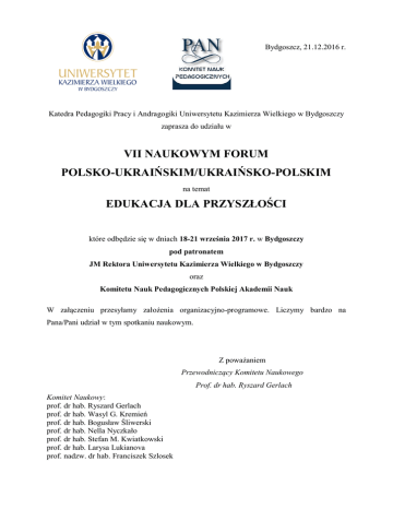 Bydgoszcz, 21.12.2016 r. Katedra Pedagogiki Pracy i Andragogiki Uniwersytetu Kazimierza Wielkiego w Bydgoszczy zaprasza do udziału w VII NAUKOWYM FORUM POLSKO-UKRAIŃSKIM/UKRAIŃSKO-POLSKIM na temat EDUKACJA DLA PRZYSZŁOŚCI które odbędzie się w dniach 18-21 września 2017 r. w Bydgoszczy pod patronatem JM Rektora Uniwersytetu Kazimierza Wielkiego w Bydgoszczy oraz Komitetu Nauk Pedagogicznych Polskiej Akademii Nauk W załączeniu przesyłamy założenia organizacyjno-programowe. Liczymy bardzo na Pana/Pani udział w tym spotkaniu naukowym. Z poważaniem Przewodniczący Komitetu Naukowego Prof. dr hab. Ryszard Gerlach Komitet Naukowy: prof. dr hab. Ryszard Gerlach prof. dr hab. Wasyl G. Kremień prof. dr hab. Bogusław Śliwerski prof. dr hab. Nella Nyczkało prof. dr hab. Stefan M. Kwiatkowski prof. dr hab. Larysa Lukianova prof. nadzw. dr hab. Franciszek Szlosek ZAŁOŻENIA ORGANIZACYJNO-PROGRAMOWE VII NAUKOWEGO FORUM POLSKO-UKRAIŃSKIEGO/UKRAIŃSKO-POLSKIEGO na temat EDUKACJA DLA PRZYSZŁOŚCI Rodząca się cywilizacja oparta jest na szczególnym zasobie, jakim jest wiedza, z kolei głównym, chociaż nie jedynym mechanizmem tworzącym społeczeństwo wiedzy, jest edukacja. Wiedza nagromadzona w przeszłości, a także w świadomości społecznej, musi być stale wzbogacana i modernizowana, dlatego w cywilizacji wiedzy edukacja musi zostać oparta na idei uczenia się przez całe życie i budowania kompetencji potrzebnych do jej rzeczywistej implementacji. Komitet Prognoz „Polska 2000 Plus” przy Polskiej Akademii Nauk w raporcie „Polska 2050” wskazuje, iż nowoczesny system edukacji jest jedną z głównych ścieżek prowadzących do zmniejszenia dystansu cywilizacyjnego w stosunku do rozwiniętych państw Unii Europejskiej. Dotyczy to zarówno Polski, jak i Ukrainy. Edukacja uznawana jest za ważny element społeczeństwa wiedzy, w którym zakładając wydłużenie średniej wieku życia, w tym wieku produkcyjnego, „uczenie się” towarzyszyć będzie biografiom ludzkim jako stały ich element. Dotyczy to zarówno edukacji dzieci i młodzieży, jak i edukacji osób dorosłych będących w okresie aktywności zawodowej, a także w tzw. trzecim wieku. Dotyczy to edukacji szkolnej, ale też pozaszkolnej, ogólnej i zawodowej, realizowanej w specjalnie do tego celu powołanych instytucjach, ale także w sposób samodzielny. Zagadnienie EDUKACJI DLA PRZYSZŁOŚCI powinno być zatem rozpatrywane w wielu perspektywach i kontekstach. Mając na uwadze funkcje edukacji oraz jej rolę zarówno dla społeczeństwa jako całości, jak i dla poszczególnych jednostek, Organizatorzy pod rozwagę proponują poddać następujące obszary problemowe: 1. Czynniki wpływające na edukację, w tym szczególnie: procesy demograficzne, starzenie się społeczeństwa oraz niedobór siły roboczej; rozwój technologii informacyjno-komunikacyjnych; finansowanie i reformowanie edukacji; potrzeby globalnego rynku pracy; rozwój kultury prefiguratywnej. 2. Preferencje i potrzeby edukacyjne społeczeństwa, w tym m.in.: indywidualizacja i personalizacja edukacji; kształcenie, dokształcanie i doskonalenie nauczycieli dla przyszłości; szkoła jako organizacja ucząca się i wspólnota uczących się podmiotów; doradztwo edukacyjno-zawodowe we wspieraniu ucznia, studenta, pracownika; edukacja na odległość; aktywność edukacyjna ludzi dorosłych; uczenie się jako kluczowa kompetencja XXI wieku; nowe formy i metody edukacji; dylematy współczesnych pedagogów. 3. (R)ewolucja edukacji: rozwój społeczeństwa wiedzy i gospodarki opartej na wiedzy, rozwój społeczeństwa uczącego się; kierunki zmian w obszarze edukacji formalnej, pozaformalnej i nieformalnej; analfabetyzm informacyjny, zjawisko przedwczesnego kończenia nauki, pokolenie „Neet”; przeciwdziałanie marginalizacji i wykluczeniu społecznemu. 4. Przyszłość edukacji: przewidywane scenariusze, trendy, wyzwania; poszukiwanie nowej wizji. Powyższa problematyka pozostaje oczywiście otwarta z nadzieją, że Uczestnicy znacznie ją wzbogacą zgodnie z ich zainteresowaniami naukowymi. Dzień 18 września goście z Ukrainy spędzą w Warszawie pod opieką pracowników Akademii Pedagogiki Specjalnej im. Marii Grzegorzewskiej, realizując przygotowany oddzielny program pobytu. Przyjazd do Bydgoszczy nastąpi w dniu 19 września. Podczas spotkania w Uniwersytecie Kazimierza Wielkiego (w dniach 19-21.09.2017 r.) przewidujemy obrady plenarne i pracę w zespołach problemowych. Przygotowane przez Uczestników referaty i komunikaty, które zostaną opublikowane w monografii redakcyjnej i/lub czasopiśmie naukowym „Szkoła-Zawód-Praca”, stanowić będą podstawę do dyskusji, na którą planujemy poświęcić najwięcej czasu. Jeśli przyjmie Pan/Pani nasze zaproszenie to uprzejmie prosimy o wypełnienie załączonego druku zgłoszenia i przesłanie na adres Katedry Pedagogiki Pracy i Andragogiki UKW (ul. Jana Karola Chodkiewicza 30; 85-064 Bydgoszcz) lub pocztą elektroniczną na jeden z podanych adresów mailowych Sekretariatu Forum do 15.02.2017 r. Opłatę konferencyjną należy wpłacić na konto UKW: 92150013601213600186020000 z dopiskiem „Forum” do 30.04.2017 r. Koszt udziału w Forum wynosi 500 zł i obejmuje wyżywienie (bez śniadań), materiały oraz publikację pozytywnie zrecenzowanego tekstu. Organizatorzy przewidują przygotowanie publikacji przed Forum. W związku z powyższym prosimy o przesłanie tekstów referatów o objętości do 0,5 arkusza wydawniczego według załączonych wytycznych do 15.02.2017 r. Miejsce i koszt noclegów pozostawiamy do decyzji Uczestnika (w załączeniu propozycje hoteli położonych w pobliżu miejsca obrad). Korespondencję prosimy kierować na adres Komitetu Organizacyjnego, który udziela wszelkich dodatkowych informacji: Przewodnicząca Komitetu Organizacyjnego: dr Renata Tomaszewska-Lipiec, tel. 605-609-669; [email protected] Sekretariat Forum: dr Ewa Krause, tel. 669 955 666