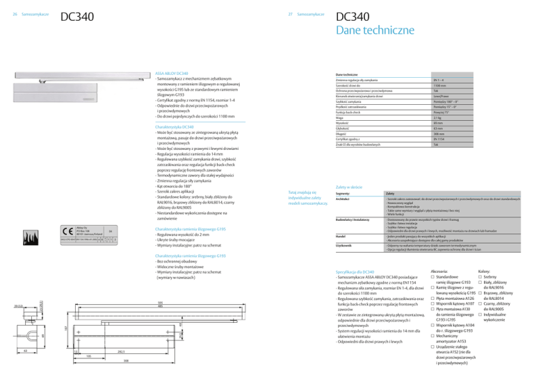 26 Samozamykacze DC340 27 Samozamykacze ASSA ABLOY DC340 · Samozamykacz z mechanizmem zębatkowym montowany z ramieniem ślizgowym o regulowanej wysokości G195 lub ze standardowym ramieniem ślizgowym G193 · Certyfikat zgodny z normą EN 1154, rozmiar 1-4 · Odpowiednie do drzwi przeciwpożarowych i przeciwdymowych · Do drzwi pojedynczych do szerokości 1100 mm Charakterystyka DC340 · Może być stosowany ze zintegrowaną ukrytą płytą montażową, pasuje do drzwi przeciwpożarowych i przeciwdymowych · Może być stosowany z prawymi i lewymi drzwiami · Regulacja wysokości ramienia do 14 mm · Regulowana szybkość zamykania drzwi, szybkość zatrzaskiwania oraz regulacja funkcji back-check poprzez regulację frontowych zaworów · Termodynamiczne zawory dla stałej wydajności · Zmienna regulacja siły zamykania · Kąt otwarcia do 180° · Szeroki zakres aplikacji · Standardowe kolory: srebrny, biały zbliżony do RAL9016, brązowy zbliżony do RAL8014, czarny zbliżony do RAL9005 · Niestandardowe wykończenia dostępne na zamówienie Abloy Oy PO Box 108 80101 Joensuu,Finland 0432-CPD-0047 EN1154:1996+A1:2002 F Charakterystyka ramienia ślizgowego G195 · Regulowana wysokość do 2 mm · Ukryte śruby mocujące · Wymiary instalacyjne: patrz na schemat 04 4 8 41 1 1 3 23(20,5) Charakterystyka ramienia ślizgowego G193 · Bez ochronnej obudowy · Widoczne śruby montażowe · Wymiary instalacyjne: patrz na schemat (wymiary w nawiasach) 48 505 485 69 25,5 107 39 (32) 63 13 282,5 105 308 DC340 Dane techniczne Dane techniczne Zmienna regulacja siły zamykania EN 1 – 4 Szerokość drzwi do 1100 mm Ochrona przeciwpożarowa i przeciwdymowa Tak Kierunek otwierania/zamykania drzwi Lewe/Prawe Szybkość zamykania Pomiędzy 180° – 0° Prędkość zatrzaskiwania Pomiędzy 15° – 0° Funkcja back-check Powyżej 75° Waga 2.1 kg Wysokość 69 mm Głębokość 63 mm Długość 308 mm Certyfikat zgodny z EN 1154 Znak CE dla wyrobów budowlanych Tak Zalety w skrócie Tutaj znajdują się indywidualne zalety modeli samozamykaczy. Segmenty: Zalety Architekci - Szeroki zakres zastosowań: do drzwi przeciwpożarowych i przeciwdymowych oraz do drzwi standardowych - Nowoczesny wygląd - Kompaktowa konstrukcja - Takie same wymiary i wygląd z płytą montażową i bez niej - Wiele funkcji Budowlańcy i Instalatorzy - Dostosowany do prawie wszystkich typów drzwi i framug - Szybka i łatwa instalacja - Szybka i łatwa regulacja - Odpowiedni dla drzwi prawych i lewych, możliwość montażu na drzwiach lub framudze Handel - Jeden produkt pasujący do wszystkich aplikacji - Akcesoria uzupełniające dostępne dla całej gamy produktów Użytkownik - Odporny na wahania temperatury dzięki zaworom termodynamicznym - Opcja regulacji tłumienia otwierania BC zapewnia ochronę dla drzwi i ścian Specyfikacja dla DC340 · Samozamykacze ASSA ABLOY DC340 posiadające mechanizm zębatkowy zgodne z normą EN1154 · Regulowana siła zamykania, rozmiar EN 1-4, dla drzwi do szerokości 1100 mm · Regulowana szybkość zamykania, zatrzaskiwania oraz funkcja back-check poprzez regulację frontowych zaworów · W zestawie ze zintegrowaną ukrytą płytą montażową, odpowiednie dla drzwi przeciwpożarowych i przeciwdymowych · System regulacji wysokości ramienia do 14 mm dla ułatwienia montażu · Odpowiedni dla drzwi prawych i lewych Kolory: Akcesoria: ! Srebrny ! Standardowe ! ! Biały, zbliżony ! ramię ślizgowe G193 do RAL9016 ! Ramię ślizgowe z regu! lowaną wysokością G195 ! Brązowy, zbliżony ! ! Płyta montażowa A126 ! do RAL8014 ! Wspornik kątowy A107 ! Czarny, zbliżony ! Płyta montażowa A130 ! ! do RAL9005 do ramienia ślizgowego ! Indywidualne ! G193 i G195 wykończenie ! Wspornik kątowy A104 ! do r. ślizgowego G193 ! Mechaniczny ! amortyzator A153 ! Urządzenie stałego ! otwarcia A152 (nie dla drzwi przeciwpożarowych i przeciwdymowych)