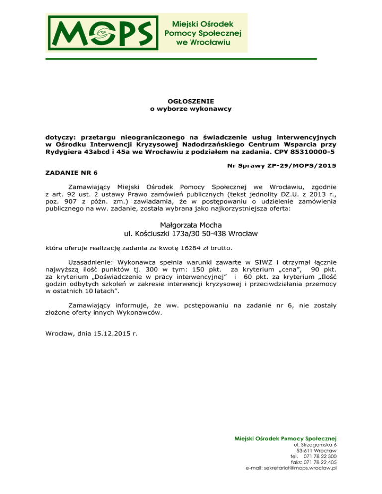OGŁOSZENIE o wyborze wykonawcy dotyczy: przetargu nieograniczonego na świadczenie usług interwencyjnych w Ośrodku Interwencji Kryzysowej Nadodrzańskiego Centrum Wsparcia przy Rydygiera 43abcd i 45a we Wrocławiu z podziałem na zadania. CPV 85310000-5 Nr Sprawy ZP-29/MOPS/2015 ZADANIE NR 6 Zamawiający Miejski Ośrodek Pomocy Społecznej we Wrocławiu, zgodnie z art. 92 ust. 2 ustawy Prawo zamówień publicznych (tekst jednolity DZ.U. z 2013 r., poz. 907 z późn. zm.) zawiadamia, że w postępowaniu o udzielenie zamówienia publicznego na ww. zadanie, została wybrana jako najkorzystniejsza oferta: Małgorzata Mocha ul. Kościuszki 173a/30 50-438 Wrocław która oferuje realizację zadania za kwotę 16284 zł brutto. Uzasadnienie: Wykonawca spełnia warunki zawarte w SIWZ i otrzymał łącznie najwyższą ilość punktów tj. 300 w tym: 150 pkt. za kryterium „cena”, 90 pkt. za kryterium „Doświadczenie w pracy interwencyjnej” i 60 pkt. za kryterium „Ilość godzin odbytych szkoleń w zakresie interwencji kryzysowej i przeciwdziałania przemocy w ostatnich 10 latach”. Zamawiający informuje, że ww. postępowaniu na zadanie nr 6, nie zostały złożone oferty innych Wykonawców. Wrocław, dnia 15.12.2015 r. Miejski Ośrodek Pomocy Społecznej ul. Strzegomska 6 53-611 Wrocław tel. 071 78 22 300 faks: 071 78 22 405 e-mail: [email protected]