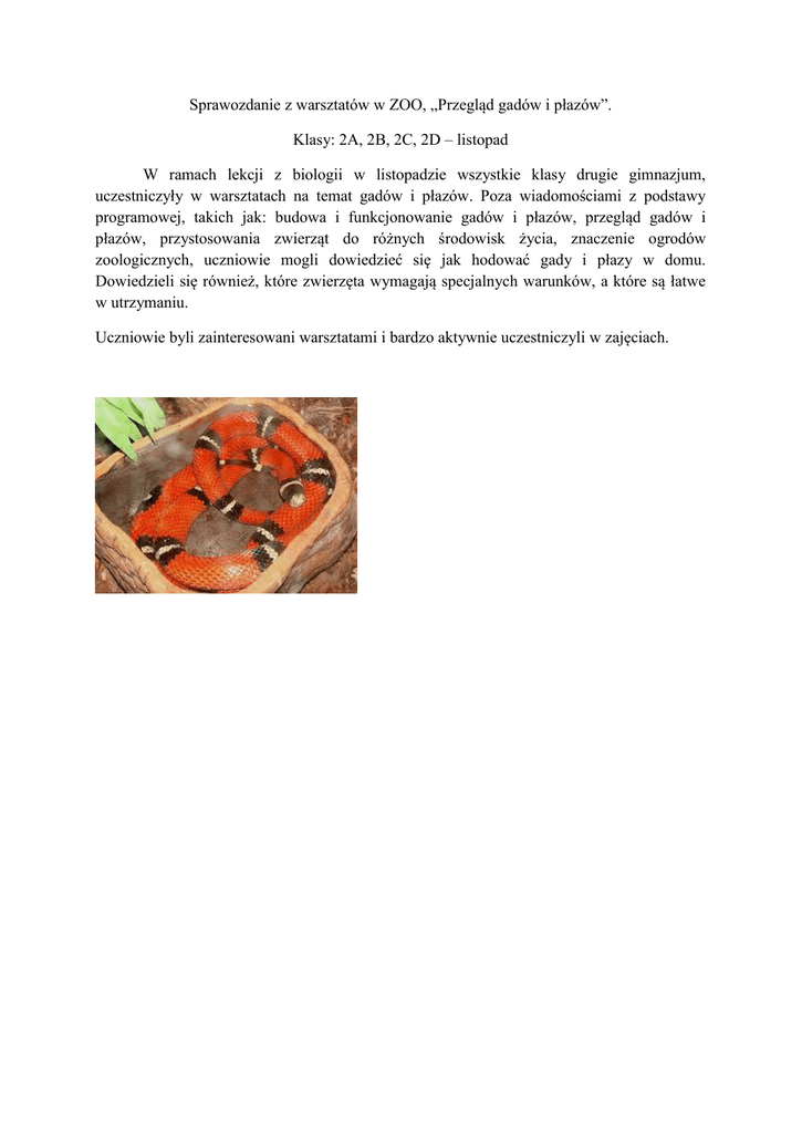 Sprawozdanie z warsztatów w ZOO, „Przegląd gadów i płazów”. Klasy: 2A, 2B, 2C, 2D – listopad W ramach lekcji z biologii w listopadzie wszystkie klasy drugie gimnazjum, uczestniczyły w warsztatach na temat gadów i płazów. Poza wiadomościami z podstawy programowej, takich jak: budowa i funkcjonowanie gadów i płazów, przegląd gadów i płazów, przystosowania zwierząt do różnych środowisk życia, znaczenie ogrodów zoologicznych, uczniowie mogli dowiedzieć się jak hodować gady i płazy w domu. Dowiedzieli się również, które zwierzęta wymagają specjalnych warunków, a które są łatwe w utrzymaniu. Uczniowie byli zainteresowani warsztatami i bardzo aktywnie uczestniczyli w zajęciach.