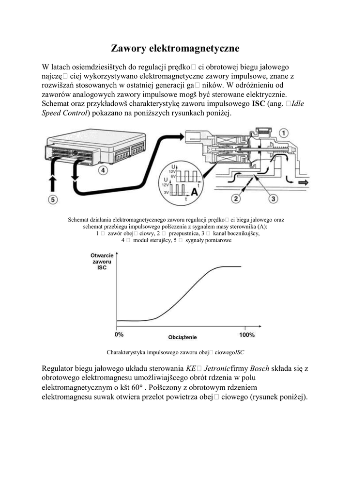 Zawory elektromagnetyczne W latach osiemdziesištych do regulacji prędkoci obrotowej biegu jałowego najczęciej wykorzystywano elektromagnetyczne zawory impulsowe, znane z rozwišzań stosowanych w ostatniej generacji ganików. W odróżnieniu od zaworów analogowych zawory impulsowe mogš być sterowane elektrycznie. Schemat oraz przykładowš charakterystykę zaworu impulsowego ISC (ang. Idle Speed Control) pokazano na poniższych rysunkach poniżej. Schemat działania elektromagnetycznego zaworu regulacji prędkoci biegu jałowego oraz schemat przebiegu impulsowego połšczenia z sygnałem masy sterownika (A): 1 zawór obejciowy, 2 przepustnica, 3 kanał bocznikujšcy, 4 moduł sterujšcy, 5 sygnały pomiarowe Charakterystyka impulsowego zaworu obejciowegoISC Regulator biegu jałowego układu sterowania KEJetronic firmy Bosch składa się z obrotowego elektromagnesu umożliwiajšcego obrót rdzenia w polu elektromagnetycznym o kšt 60 . Połšczony z obrotowym rdzeniem elektromagnesu suwak otwiera przelot powietrza obejciowego (rysunek poniżej). Budowa elektrycznie sterowanego regulatora prędkoci obrotowej biegu jałowego stosowanego w układzie KEJetronic (Robert Bosch): 1 złšcze elektryczne, 2 obudowa, 3 sprężyna ruchu powrotnego, 4 uzwojenie elektromagnesu, obrotowy rdzeń elektromagnesu, 6 kanał powietrza dodatkowego w boczniku przepustnicy (bypass), 7 regulowany zderzak, 8 suwak obrotowy Mimo, że zasada działania zaworów elektromagnetycznych jest bardzo podobna poszczególne typy mogš różnić się budowš. W przypadku zaworów starszego typu możliwych jest wiele wariantów zamocowania zaworu. Najczęciej zawór montowany jest bezporednio na korpusie przepustnicy. W innych wersjach funkcję kanału bocznikujšcego omijajšcego przepustnicę spełnia jeden lub dwa przewody giętkie. W zaworach nowego typu przy braku zasilania zamykanie i otwieranie zaworu odbywa się za porednictwem sprężyny rozprężajšcej rysunek poniżej. Zawory elektromagnetyczne regulacji prędkoci obrotowej biegu jałowego: A zawór nowego typu, B zawór starszego typu, C wlot powietrza,D wylot powietrza, 1 cewka, 2 twornik, 3 sprężyny dociskowe, 4 trzpień zaworu, 5 przepona, 6 złšcze elektryczne Znane sš rozwišzania zaworów, w których połšczono analogowy (mechaniczny) sposób regulacji powietrza z regulacjš elektronicznš. Zawory takie znajdujš się we wspólnej obudowie i nazywane sš skrótem ISCBPA. Schemat budowy układu dolotowego wyposażonego w kombinację zaworów obejciowych ISCBPA firmy Ford Przykładem wielozaworowego układu regulacji biegu jałowego jest zespół zaworów przedstawiony na rysunku obok. Zespół ten został użyty w samochodzie Ford Tracer 1.6L produkowanym w latach 198890. Składa się on z następujšcych zaworów: 1. zespół zaworów ISCBPA sterowanych elektronicznie i analogowo (temperaturš cieczy chłodzšcej), 2. zaworu elektrycznego włšczanego równolegle z klimatyzacjš (A/C), 3. zaworu elektrycznego włšczanego równolegle z układem wspomagania kierownicy (P/S), 4. zaworu elektrycznego włšczanego w zależnoci od obcišżenia elektronicznego (E/L). Zawór ten sterowany jest z jednostki sterujšcej silnika. W jego algorytmie sterowania uwzględniono reakcję na włšczenie: owietlenia, wentylatora, ogrzewania szyb.