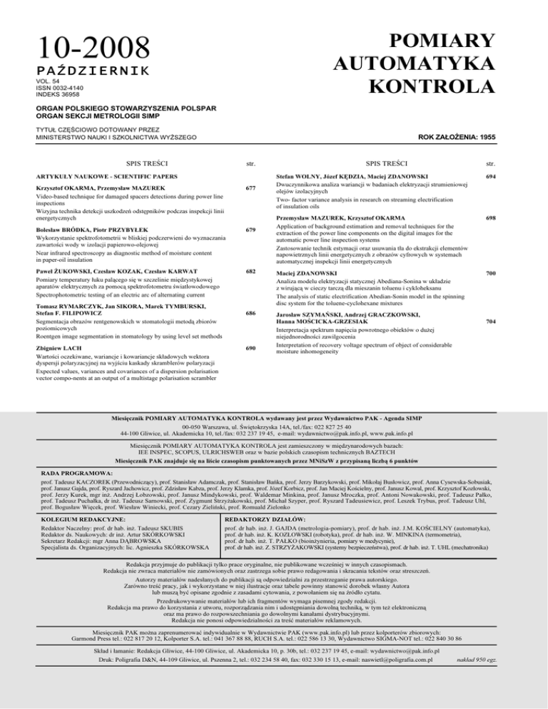 10-2 008 POMIARY AU T OMAT YK A K ON T ROL A PAŹDZIERNIK VOL. 54 I S S N 003 2 -41 40 I N D E K S 3 6 9 58 ORGAN POLSKIEGO STOWARZYSZENIA POLSPAR ORGAN SEKC J I M ETROLOGII SIM P T Y T U Ł C Z Ę Ś C I OW O D OT OW A N Y P R Z E Z M I N I S T E R S T W O N A U K I I S Z K OLN I C T W A W Y Ż S Z E G O ROK ZAŁ OŻ ENIA: 1 9 5 5 S P IS T R E Ś C I s tr. ARTYKUŁY NAUKOWE - S C IENTIF IC P AP ERS Kr z y s z t o f OKARM A, P r z e m y s ł a w M AZ UREK Video-b as ed t ech n iq u e f or dam aged s p acers det ect ion s du rin g p ow er l in e in s p ect ion s Wizyj n a t ech n ik a det ek cj i u s zk odzeń ods t ę p n ik ó w p odczas in s p ek cj i l in ii en erget yczn ych 6 7 7 P a w e ł Ż UKOWS KI, C z e s ł a w KOZ AK, C z e s ł a w KARWAT P om iary t em p erat u ry ł u k u p al ą cego s ię w s zczel in ie m ię dzys t yk ow ej ap arat ó w el ek t ryczn ych za p om ocą s p ek t rof ot om et ru ś w iat ł ow odow ego Sp ect rop h ot om et ric t es t in g of an el ect ric arc of al t ern at in g cu rren t 6 8 2 B o l e s ł a w B RÓ D KA, P i o t r P RZ YB YŁEK Wyk orzys t an ie s p ek t rof ot om et rii w b l is k iej p odczerw ien i do w yzn aczan ia zaw art oś ci w ody w izol acj i p ap ierow o-ol ej ow ej N ear in f rared s p ect ros cop y as diagn os t ic m et h od of m ois t u re con t en t in p ap er-oil in s u l at ion To m a s z RYM ARC Z YK, J a n S IKORA, M a r e k TYM B URS KI, S t e f a n F . F IL IP OWIC Z Segm en t acj a ob razó w ren t gen ow s k ich w s t om at ol ogii m et odą zb ioró w p oziom icow ych R oen t gen im age s egm en t at ion in s t om at ol ogy b y u s in g l ev el s et m et h ods Z b i g n i e w L AC H Wart oś ci oczek iw an e, w arian cj e i k dys p ers j i p ol aryzacyj n ej n a w yj ś ciu E x p ect ed v al u es , v arian ces an d cov v ect or com p o-n en t s at an ou t p u t of ow arian cj e s k ł adow ych k as k ady s k ram b l eró w p arian ces of a dis p ers ion a m u l t is t age p ol aris at ion S P IS T R E Ś C I S t e f a n WOL NY, J ó z e f KĘ D Z IA, M a c i e j Z D ANOWS KI D w u czyn n ik ow a an al iza w arian cj i w b adan iach el ek t ryzacj i s t ru m ien iow ej ol ej ó w izol acyj n ych T w o- f act or v arian ce an al ys is in res earch on s t ream in g el ect rif icat ion of in s u l at ion oil s 6 9 4 M a c i e j Z D ANOWS KI A n al iza m odel u el ek t ryzacj i s t at yczn ej z w iru j ą cą w cieczy t arczą dl a m ies zan T h e an al ys is of s t at ic el ect rif icat ion A b dis c s ys t em f or t h e t ol u en e-cycl oh ex an 7 0 0 P r z e m y s ł a w M AZ UREK, Kr z y s z t o f OKARM A A p p l icat ion of b ack grou n d es t im at ion an d rem ov al t ech n iq u es f or t h e ex t ract ion of t h e p ow er l in e com p on en t s on t h e digit al im ages f or t h e au t om at ic p ow er l in e in s p ect ion s ys t em s Z as t os ow an ie t ech n ik es t ym acj i oraz u s u w an ia t ł a do ek s t rak cj i el em en t ó w n ap ow iet rzn ych l in ii en erget yczn ych z ob razó w cyf row ych w s ys t em ach au t om at yczn ej in s p ek cj i l in ii en erget yczn ych 6 7 9 6 8 6 A b edian a-Son in a w u k ł adzie in t ol u en u i cyk l oh ek s an u edian -Son in m odel in t h e s p in n in g e m ix t u res J a r o s ł a w S Z YM AŃ S KI, An d r z e j G RAC Z KOWS KI, H a n n a M OŚ C IC KA-G RZ ES IAK In t erp ret acj a s p ek t ru m n ap ię cia p ow rot n ego ob iek t ó w o du ż ej n iej edn orodn oś ci zaw il gocen ia In t erp ret at ion of recov ery v ol t age s p ect ru m of ob j ect of con s iderab l e m ois t u re in h om ogen eit y 6 9 0 w ek t ora ol aryzacj i p ol aris at ion s cram b l er s tr. 6 9 8 7 0 4 M i e s i ę c z n i k P OM IARY AUTOM ATYKA KONTROL A w y d a w a n y j e s t p r z e z Wy d a w n i c t w o P AK - Ag e n d a S IM P 0 0 -0 5 0 Wars zaw a, u l . Ś w ię t ok rzys k a 1 4 A , t el . / f ax : 0 2 2 8 2 7 2 5 4 0 4 4 -1 0 0 G l iw ice, u l . A k adem ick a 1 0 , t el . / f ax : 0 3 2 2 3 7 1 9 4 5 , e-m ail : w ydaw n ict w o@ p ak . in f o. p l , w w w . p ak . in f o. p l M ies ię czn ik P O M IA R Y A U T O M A T Y K A K O N T R O L A j es t zam ies zczon y w m ię dzyn arodow ych b azach : IE E IN SP E C , SC O P U S, U L R IC H SWE B oraz w b azie p ol s k ich czas op is m t ech n iczn ych B A Z T E C H RAD A P ROG RAM OWA: p rof . p rof . p rof . p rof . p rof . M i e s i ę c z n i k P AK z n a j d u j e s i ę n a l i ś c i e c z a s o p i s m p u n k t o w a n y c h p r z e z M Ni S z W z p r z y p i s a n ą l i c z b ą 6 p u n k t ó w T adeu s z K A C Z O R E K ( P rzew odn iczą cy), p rof . St an is ł aw A dam czak , p rof . St an is ł aw B ań k a, p rof . J erzy B arzyk ow s k i, p rof . M ik oł aj B u s ł ow icz, p rof . A n n a C ys ew s k a-Sob u s iak , J an u s z G aj da, p rof . R ys zard J ach ow icz, p rof . Z dzis ł aw K ab za, p rof . J erzy K l am k a, p rof . J ó zef K orb icz, p rof . J an M aciej K oś ciel n y, p rof . J an u s z K ow al , p rof . K rzys zt of K ozł ow s k i, J erzy K u rek , m gr in ż . A n drzej Ł ob zow s k i, p rof . J an u s z M in dyk ow s k i, p rof . Wal dem ar M in k in a, p rof . J an u s z M roczk a, p rof . A n t on i N ow ak ow s k i, p rof . T adeu s z P ał k o, T adeu s z P u ch ał k a, dr in ż . T adeu s z Sarn ow s k i, p rof . Z ygm u n t St rzyż ak ow s k i, p rof . M ich ał Szyp er, p rof . R ys zard T adeu s iew icz, p rof . L es zek T ryb u s , p rof . T adeu s z U h l , B ogu s ł aw Wię cek , p rof . Wies ł aw Win ieck i, p rof . C ezary Z iel iń s k i, p rof . R om u al d Z iel on k o KOL EG IUM RED AKC YJ NE: R edak t or N aczel n y: p rof . dr h ab . in ż . R edak t or ds . N au k ow ych : dr in ż . A rt u Sek ret arz R edak cj i: m gr A n n a D Ą B R Sp ecj al is t a ds . O rgan izacyj n ych : l ic. A T adeu s z SK U B IS r SK Ó R K O WSK I O WSK A gn ies zk a SK Ó R K O WSK A RED AKTORZ Y D Z IAŁÓ W: p rof . dr h ab . in ż . J p rof . dr h ab . in ż . 