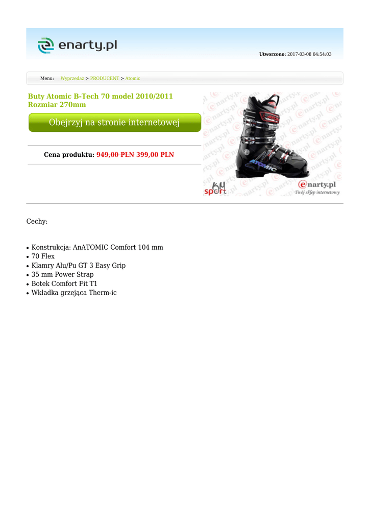 Utworzono: 2017-03-08 04:54:03 Menu: Wyprzedaż > PRODUCENT > Atomic Buty Atomic B-Tech 70 model 2010/2011 Rozmiar 270mm Obejrzyj na stronie internetowej Cena produktu: 949,00 PLN 399,00 PLN Cechy: ● ● ● ● ● ● Konstrukcja: AnATOMIC Comfort 104 mm 70 Flex Klamry Alu/Pu GT 3 Easy Grip 35 mm Power Strap Botek Comfort Fit T1 Wkładka grzejąca Therm-ic Przeznaczenie Typ Męskie Twardość buta (flex) Producent Kolor Adres: www.erowery.pl [email protected] Allmountain - rekreacja 70 Atomic Czarny_#000000 Adres: www.enarty.pl Telefon: 605 515 185, 34 361 16 71 Email: [email protected] Email: