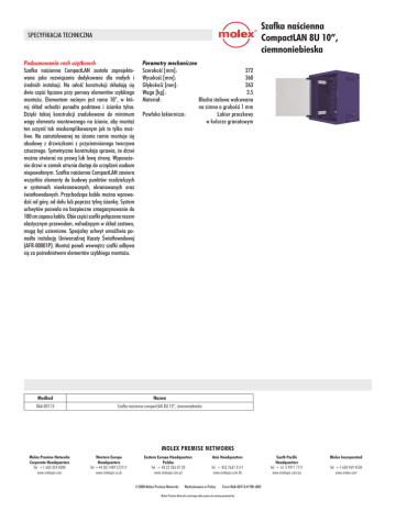 Szafka naścienna CompactLAN 8U 10”, ciemnoniebieska SPECYFIKACJA TECHNICZNA Podsumowanie cech użytkowch Szafka naścienna CompactLAN została zaprojektowana jako rozwiązanie dedykowane dla małych i średnich instalacji. Na całość konstrukcji składają się dwie części łączone przy pomocy elementów szybkiego montażu. Elementem nośnym jest rama 10”, w której skład wchodzi ponadto podstawa i ścianka tylna. Dzięki takiej konstrukcji zredukowano do minimum wagę elementu montowanego na ścianie, aby montaż ten uczynić tak nieskomplikowanym jak to tylko możliwe. Na zainstalowanej na ścianie ramie montuje się obudowę z drzwiczkami z przyciemnionego tworzywa sztucznego. Symetryczna konstrukcja sprawia, że drzwi można otwierać na prawą lub lewą stronę. Wyposażenie drzwi w zamek utrunia dostęp do urządzeń osobom niepowołanym. Szafka naścienna CompactLAN zawiera wszystkie elementy do budowy punktów rozdzielczych w systemach nieekranowanych, ekranowanych oraz światłowodowych. Przychodzące kable można wprowadzić od góry, od dołu lub poprzez tylną ściankę. System uchwytów pozwala na bezpieczne zmagazynowanie do 100 cm zapasu kabla. Obie części szafki połączone razem elastycznym przewodem, wchodzącym w skład zestawu, mogą być uziemione. Specjalny uchwyt umożliwia ponadto instalację Uniwersalnej Kasety Światłowodowej (AFR-00001P). Montaż paneli wewnątrz szafki odbywa się za pośrednictwem elementów szybkiego montażu. Parametry mechaniczne Szerokość [mm]: 272 Wysokość [mm]: 360 Głębokość [mm]: 263 Waga [kg]: 3.5 Materiał: Blacha stalowa walcowana na zimno o grubości 1 mm Powłoka lakiernicza: Lakier proszkowy w kolorze granatowym Modkod Nazwa RAA-00113 Szafka naścienna compactLAN 8U 10”, ciemnoniebieska MOLEX PREMISE NETWORKS Molex Premise Networks Corporate Headquarters Tel. +1 603 324 0200 www.molexpn.com Western Europe Headquarters Tel +44 (0) 1489 572111 www.molexpn.co.uk Eastern Europe Headquarters Polska Tel. + 48 22 326 07 20 www.molexpn.com.pl ©2008 Molex Premise Networks Asia Headquarters Tel. + 852 2637 3111 www.molexpn.com.hk Wydrukowano w Polsce Form RAA-00113#708 v002 Molex Premise Networks zastrzega sobie prawo do zmiany parametrów South Pacific Headquarters Tel. + 61 3 9971 7111 www.molexpn.com.au Molex Incorporated Tel. +1 630 969 4550 www.molex.com