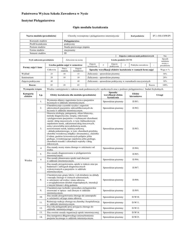 Państwowa Wyższa Szkoła Zawodowa w Nysie Instytut Pielęgniarstwa Opis modułu kształcenia Choroby wewnętrzne i pielęgniarstwo internistyczne Nazwa modułu (przedmiotu) Kierunek studiów Profil kształcenia Poziom studiów Forma studiów Semestr studiów IP.1./OS-CHWiPI Kod podmiotu Pielęgniarstwo praktyczny Studia pierwszego stopnia stacjonarny III Zajęcia z zakresu nauk podstawowych Formy zajęć i inne - Sposoby weryfikacji efektów kształcenia w ramach form zajęć Waga w % Zaliczenie na ocenę Tryb zaliczenia przedmiotu Liczba godzin zajęć w semestrze Nie Sposób ustalania oceny z przedmiotu Liczba punktów ECTS Zajęcia teoretyczne 2 Zajęcia praktyczne 2 Praktyka zawodowa Całkowita Pracy studenta Zajęcia kontaktowe Wykład 25 10 15 Zaliczenie - sprawdzian pisemny 50% Seminarium 20 10 10 Zaliczenie - sprawdzian pisemny 20% Zajęcia praktyczne 40 - 40 Zaliczenie - sprawdzian praktyczny w warunkach rzeczywistych 30% 85 20 65 Razem: Wymagania wstępne Kategoria efektów Lp. 1. 2. 3. 4 5. Wiedza 6 7. 8. 9. 10. 11. 12. 13. 14. Razem 100% Wiedza i umiejętności z zakresu nauk podstawowych i społecznych oraz z podstaw pielęgniarstwa i badań fizykalnych. Efekty kształcenia dla modułu (przedmiotu) Wymienia objawy zagrożenia życia u pacjentów leczonych w oddziale internistycznym. Charakteryzuje czynniki ryzyka i zagrożeń zdrowotnych pacjentów zakwalifikowanych do leczenia w oddziale internistycznym. Omawia etiologię, patogenezę, obraz kliniczny, metody diagnostyczne, terapię, rokowanie i pielęgnowanie pacjentów z wybranymi chorobami: -nerek i dróg moczowych, w tym: kłębuszkowym zapaleniem nerek, zakażeniem dróg moczowych, ostrą i przewlekłą niewydolnością nerek, nowotworami nerek, kamicą nerkową, - układu pokarmowego, w tym: chorobach przełyku, chorobie wrzodowej żołądka i dwunastnicy, chorobie Crohna, guzków krwawniczych polipów jelita grubego, wrzodziejącego zapalenia jelita grubego, chorobach trzustki i chorobach wątroby i dróg żółciowych. Zna zasady oceny stanu chorego w zależności od wieku. Zna zasady diagnozowania w pielęgniarstwie internistycznym. Zna zasady planowania opieki nad chorymi w oddziale internistycznym. Zna zasady przygotowania, opieki w trakcie oraz po badaniach i zabiegach diagnostycznych wykonywanych u pacjentów w oddziale internistycznym. Charakteryzuje grupy leków i ich działanie na układy i narządy chorego w różnych schorzeniach, w zależności od wieku i stanu zdrowia, z uwzględnieniem działań niepożądanych, interakcji z innymi lekami i dróg podania. Charakteryzuje techniki i procedury pielęgniarskie stosowane w opiece nad chorym w oddziale internistycznym. Zna zasady przygotowania chorego do samoopieki w zależności od jego stanu zdrowia. Różnicuje reakcje chorego na chorobę i hospitalizację w oddziale internistycznym. Zna rolę pielęgniarki przy przyjęciu chorego do oddziału internistycznego. Zna swoiste zasady organizacji opieki internistycznej. Zna następstwa długotrwałego unieruchomienia pacjenta leczonego w oddziale internistycznym. Sposoby weryfikacji efektu kształcenia Efekty kierunkowe Sprawdzian pisemny D.W1. Sprawdzian pisemny D.W2. Sprawdzian pisemny D.W3. Sprawdzian pisemny D.W4. D.W5. Sprawdzian pisemny D.W6. Sprawdzian pisemny D.W7. Sprawdzian pisemny D.W8. Sprawdzian pisemny D.W9. Sprawdzian pisemny D.W10. Sprawdzian pisemny D.W11. Sprawdzian pisemny D.W12. Sprawdzian pisemny D.W14. Sprawdzian pisemny D.W25. Uwagi 15. 16. 17. 1. 2. 3. 4. 5. 6. 7. 8. 9. 10. 11. 12. 13. 14. Umiejętności 15. 16. 17. Zna zasady żywienia chorych w poszczególnych schorzeniach internistycznych z uwzględnieniem leczenia dietetycznego. Zna patofizjologię, objawy kliniczne i powikłania chorób nowotworowych. Zna procedurę postępowania z ciałem pacjenta zmarłego. Gromadzi informacje, formułuje diagnozę pielęgniarską, ustala cele i plan opieki nad pacjentem leczonym w oddziale internistycznym. Rozpoznaje uwarunkowania zachowania zdrowia odbiorców opieki w oddziale internistycznym. Prowadzi poradnictwo w zakresie samoopieki pacjentów w różnym wieku i stanie zdrowia, dotyczące chorób i uzależnień w oddziale internistycznym. Motywuje chorego i jego opiekunów do wejścia do grup wsparcia społecznego. Prowadzi profilaktykę powikłań w przebiegu chorób prowadzących do stanu zagrożenia życia. Organizuje izolację chorych zakaźnie w oddziale internistycznym. Diagnozuje stopień ryzyka rozwoju odleżyn i dokonuje ich klasyfikacji. Pobiera materiał do badań diagnostycznych u chorych leczonych w oddziale internistycznym. Ocenia stan ogólny pacjenta w kierunku powikłań po specjalistycznych badaniach diagnostycznych w oddziale internistycznym. Doraźnie podaje tlen, kontroluje stężenie glukozy we krwi oraz modyfikuje dawkę stałą insuliny szybko i krótko działającej. Przygotowuje chorego do badań diagnostycznych pod względem fizycznym i psychicznym. Dokumentuje sytuację zdrowotną pacjenta w oddziale internistycznym, jej dynamikę zmian i realizowaną opiekę pielęgniarską. Rozpoznaje stany nagłego zagrożenia zdrowia i życia u pacjentów leczonych w oddziale internistycznym. Instruuje pacjenta i jego opiekuna w zakresie użytkowania sprzętu pielęgnacyjno-rehabilitacyjnego oraz środków pomocniczych. Prowadzi żywienie enteralne i parenteralne u chorych leczonych w oddziale neurologicznym z wykorzystaniem różnych technik, pielęgnuje pacjenta z założoną sondą do żołądka lub wytworzoną przetoką odżywczą leczonego w oddziale internistycznym. Rozpoznaje powikłania leczenia farmakologicznego, dietetycznego, rehabilitacyjnego i leczniczopielęgnacyjnego u chorych hospitalizowanych w oddziale internistycznym. Prowadzi rozmowę terapeutyczną oraz stosuje techniki kontaktu pozawerbalnego w przypadku chorych leczonych w oddziale internistycznym. 18. Doraźnie tamuje krwawienia i krwotoki. 19. Prowadzi rehabilitację przyłóżkową i usprawnianie ruc
