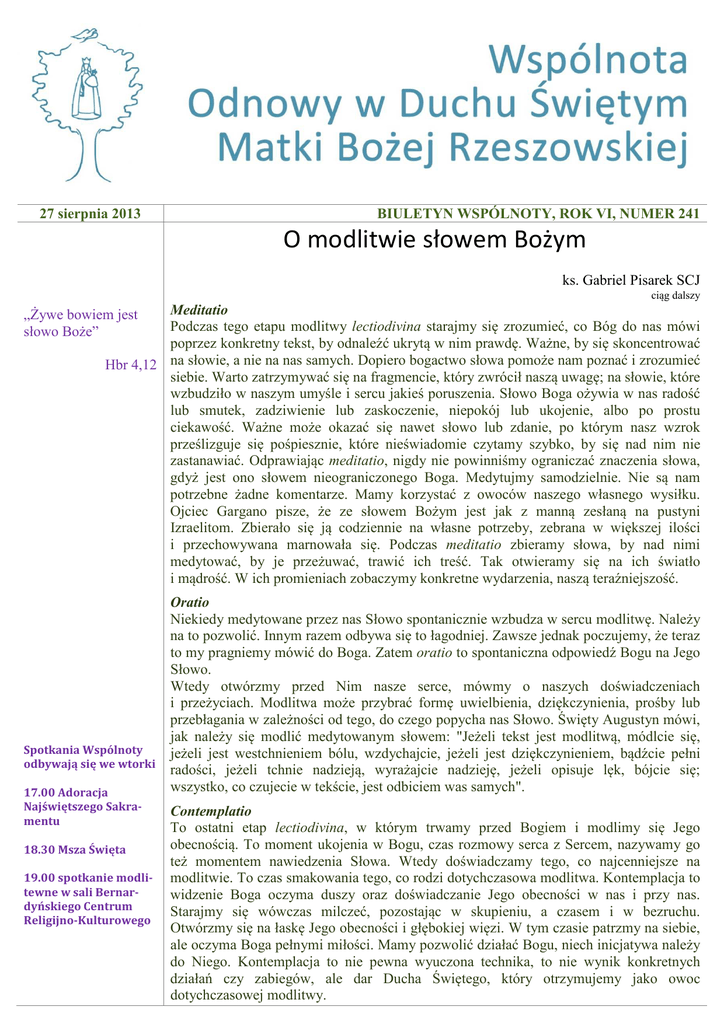 27 sierpnia 2013 BIULETYN WSPÓLNOTY, ROK VI, NUMER 241 O modlitwie słowem Bożym ks. Gabriel Pisarek SCJ ciąg dalszy Meditatio „Żywe bowiem jest Podczas tego etapu modlitwy lectiodivina starajmy się zrozumieć, co Bóg do nas mówi słowo Boże” poprzez konkretny tekst, by odnaleźć ukrytą w nim prawdę. Ważne, by się skoncentrować Hbr 4,12 na słowie, a nie na nas samych. Dopiero bogactwo słowa pomoże nam poznać i zrozumieć siebie. Warto zatrzymywać się na fragmencie, który zwrócił naszą uwagę; na słowie, które wzbudziło w naszym umyśle i sercu jakieś poruszenia. Słowo Boga ożywia w nas radość lub smutek, zadziwienie lub zaskoczenie, niepokój lub ukojenie, albo po prostu ciekawość. Ważne może okazać się nawet słowo lub zdanie, po którym nasz wzrok prześlizguje się pośpiesznie, które nieświadomie czytamy szybko, by się nad nim nie zastanawiać. Odprawiając meditatio, nigdy nie powinniśmy ograniczać znaczenia słowa, gdyż jest ono słowem nieograniczonego Boga. Medytujmy samodzielnie. Nie są nam potrzebne żadne komentarze. Mamy korzystać z owoców naszego własnego wysiłku. Ojciec Gargano pisze, że ze słowem Bożym jest jak z manną zesłaną na pustyni Izraelitom. Zbierało się ją codziennie na własne potrzeby, zebrana w większej ilości i przechowywana marnowała się. Podczas meditatio zbieramy słowa, by nad nimi medytować, by je przeżuwać, trawić ich treść. Tak otwieramy się na ich światło i mądrość. W ich promieniach zobaczymy konkretne wydarzenia, naszą teraźniejszość. Spotkania Wspólnoty odbywają się we wtorki 17.00 Adoracja Najświętszego Sakramentu 18.30 Msza Święta 19.00 spotkanie modlitewne w sali Bernardyńskiego Centrum Religijno-Kulturowego Oratio Niekiedy medytowane przez nas Słowo spontanicznie wzbudza w sercu modlitwę. Należy na to pozwolić. Innym razem odbywa się to łagodniej. Zawsze jednak poczujemy, że teraz to my pragniemy mówić do Boga. Zatem oratio to spontaniczna odpowiedź Bogu na Jego Słowo. Wtedy otwórzmy przed Nim nasze serce, mówmy o naszych doświadczeniach i przeżyciach. Modlitwa może przybrać formę uwielbienia, dziękczynienia, prośby lub przebłagania w zależności od tego, do czego popycha nas Słowo. Święty Augustyn mówi, jak należy się modlić medytowanym słowem: "Jeżeli tekst jest modlitwą, módlcie się, jeżeli jest westchnieniem bólu, wzdychajcie, jeżeli jest dziękczynieniem, bądźcie pełni radości, jeżeli tchnie nadzieją, wyrażajcie nadzieję, jeżeli opisuje lęk, bójcie się; wszystko, co czujecie w tekście, jest odbiciem was samych". Contemplatio To ostatni etap lectiodivina, w którym trwamy przed Bogiem i modlimy się Jego obecnością. To moment ukojenia w Bogu, czas rozmowy serca z Sercem, nazywamy go też momentem nawiedzenia Słowa. Wtedy doświadczamy tego, co najcenniejsze na modlitwie. To czas smakowania tego, co rodzi dotychczasowa modlitwa. Kontemplacja to widzenie Boga oczyma duszy oraz doświadczanie Jego obecności w nas i przy nas. Starajmy się wówczas milczeć, pozostając w skupieniu, a czasem i w bezruchu. Otwórzmy się na łaskę Jego obecności i głębokiej więzi. W tym czasie patrzmy na siebie, ale oczyma Boga pełnymi miłości. Mamy pozwolić działać Bogu, niech inicjatywa należy do Niego. Kontemplacja to nie pewna wyuczona technika, to nie wynik konkretnych działań czy zabiegów, ale dar Ducha Świętego, który otrzymujemy jako owoc dotychczasowej modlitwy. Odpowiedzialni za Wspólnotę o. Wiktor Tokarski OFM pasterz tel. 17.853.34.95 w. 125 Marta Fortuniak lider Wiesława Mac v-ce lider Jacek Fura v-ce lider Animatorzy Diakonii Alicja Smalarz diakonia adoracyjna Marta Fortuniak diakonia prorocka Jacek Fura diakonia modlitwy wstawienniczej i uwolnienia o. Amos Smolarek OFM diakonia nauczania Jolanta Skotnicka diakonia uwielbienia Barbara Siorek diakonia miłosierdzia Anna Ostrowska diakonia wprowadzająca dla kobiet Paweł Kobosz diakonia wprowadzająca dla mężczyzn Wiesława Mac diakonia organizacyjna Daniel Chmiel diakonia porządkowa Marta Fortuniak diakonia medialna Paweł Kobosz diakonia modlitwy osłonowej Dane fundacji: Fundacja Charismata im. św. Pawła Apostoła ul. Sokoła 8 35-010 Rzeszów Maryja patronką lectiodivina Ten, kto pragnie kroczyć drogą lectiodivina, musi najpierw dokonać wyboru, musi postawić na Słowo i umieścić je w centrum swojego życia, uczynić z niego jedyny punkt odniesienia, tak jak to uczyniła Maryja. Ona umiłowała je ponad wszystko, słuchała go i przyjmowała je całą sobą, swoim umysłem, swoim sercem i swoją wolą. Ona słuchając go, zachowywała je i strzegła w swoim sercu, konfrontowała je z własnym życiem i wreszcie je rodziła. Ona jest wzorem tej modlitwy, gdyż kto inny, jak nie ona, miał okazję wpatrywać się w oblicze Chrystusa i kontemplować je? Słowo Boże do medytacji − − − − − śr – Mt 23,27-32 Biada obłudnikom cz – Mk 6,17-29 Ścięcie Jana Chrzciciela pt – Mt 25,1-13 Przypowieść o dziesięciu pannach so – Mt 25,14-30 Przypowieść o talentach n – Łk 14,1.7-14 Kto się wywyższa, będzie poniżony, a kto się poniża, będzie wywyższony − pn – Łk 4,16-30 Jezus nie przyjęty w Nazarecie − wt – Łk 4,31-37 Uzdrowienie opętanego Intencje do modlitwy W intencji Ojca Świętego Franciszka o światło Ducha Świętego i siły fizyczne potrzebne do prowadzenia Kościoła, o zdrowie i błogosławieństwo Boże dla Benedykta XVI i ks. bpa Jana. W intencji wszystkich kapłanów posługujących w Odnowie w naszej Diecezji. O moc Ducha Świętego i światłe oczy serca. O rozpalenie charyzmatów we Wspólnocie, o jedność, o chęć służby i ochronę przed zniechęceniem. O ochronę przed działaniem złych duchów dla członków Wspólnoty, ich rodzin i bliskich. O błogosławieństwo w posłudze modlitwą uwolnienia i dobre owoce ewangelizacji prowadzonej przez Wspólnotę (katechezy aud