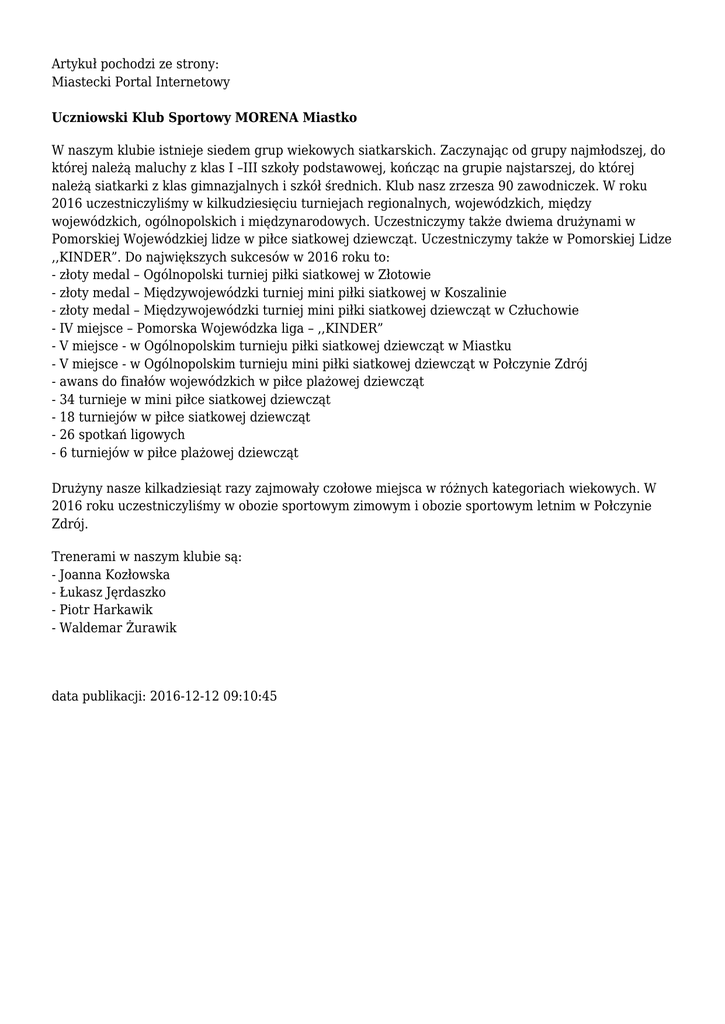 Artykuł pochodzi ze strony: Miastecki Portal Internetowy Uczniowski Klub Sportowy MORENA Miastko W naszym klubie istnieje siedem grup wiekowych siatkarskich. Zaczynając od grupy najmłodszej, do której należą maluchy z klas I –III szkoły podstawowej, kończąc na grupie najstarszej, do której należą siatkarki z klas gimnazjalnych i szkół średnich. Klub nasz zrzesza 90 zawodniczek. W roku 2016 uczestniczyliśmy w kilkudziesięciu turniejach regionalnych, wojewódzkich, między wojewódzkich, ogólnopolskich i międzynarodowych. Uczestniczymy także dwiema drużynami w Pomorskiej Wojewódzkiej lidze w piłce siatkowej dziewcząt. Uczestniczymy także w Pomorskiej Lidze ,,KINDER”. Do największych sukcesów w 2016 roku to: - złoty medal – Ogólnopolski turniej piłki siatkowej w Złotowie - złoty medal – Międzywojewódzki turniej mini piłki siatkowej w Koszalinie - złoty medal – Międzywojewódzki turniej mini piłki siatkowej dziewcząt w Człuchowie - IV miejsce – Pomorska Wojewódzka liga – ,,KINDER” - V miejsce - w Ogólnopolskim turnieju piłki siatkowej dziewcząt w Miastku - V miejsce - w Ogólnopolskim turnieju mini piłki siatkowej dziewcząt w Połczynie Zdrój - awans do finałów wojewódzkich w piłce plażowej dziewcząt - 34 turnieje w mini piłce siatkowej dziewcząt - 18 turniejów w piłce siatkowej dziewcząt - 26 spotkań ligowych - 6 turniejów w piłce plażowej dziewcząt Drużyny nasze kilkadziesiąt razy zajmowały czołowe miejsca w różnych kategoriach wiekowych. W 2016 roku uczestniczyliśmy w obozie sportowym zimowym i obozie sportowym letnim w Połczynie Zdrój. Trenerami w naszym klubie są: - Joanna Kozłowska - Łukasz Jęrdaszko - Piotr Harkawik - Waldemar Żurawik data publikacji: 2016-12-12 09:10:45