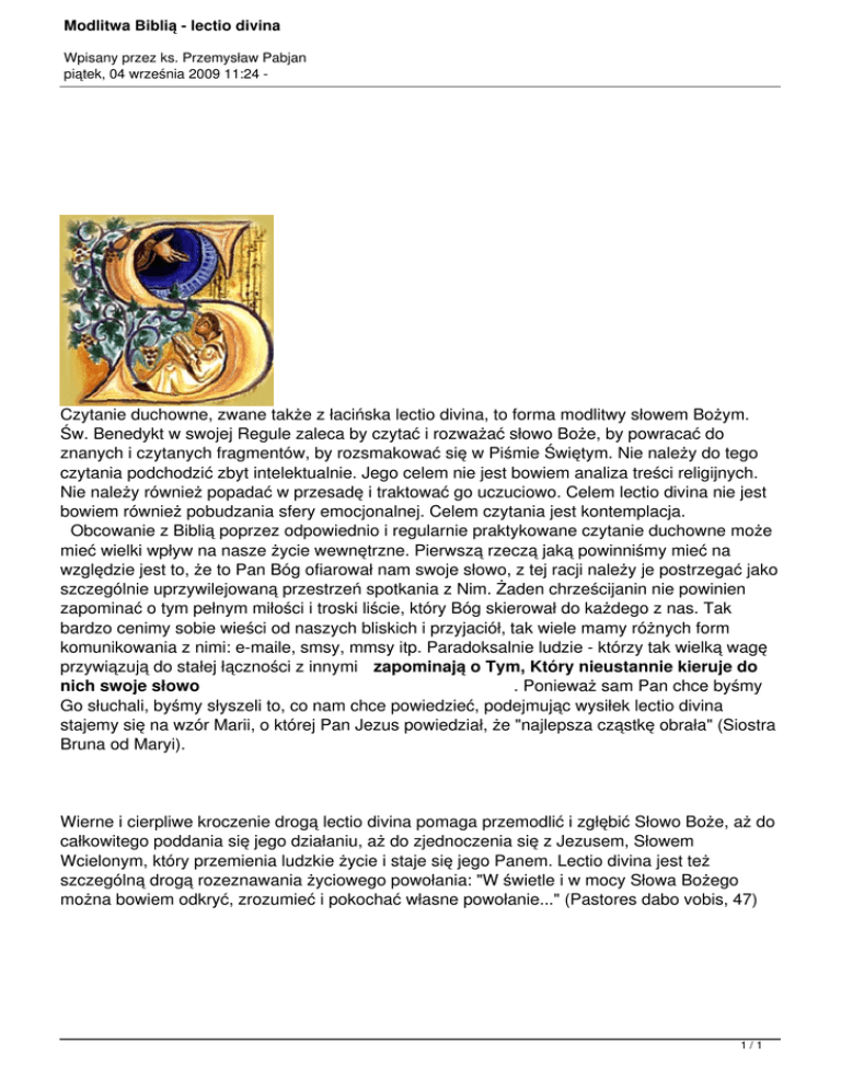 Modlitwa Biblią - lectio divina Wpisany przez ks. Przemysław Pabjan piątek, 04 września 2009 11:24 - Czytanie duchowne, zwane także z łacińska lectio divina, to forma modlitwy słowem Bożym. Św. Benedykt w swojej Regule zaleca by czytać i rozważać słowo Boże, by powracać do znanych i czytanych fragmentów, by rozsmakować się w Piśmie Świętym. Nie należy do tego czytania podchodzić zbyt intelektualnie. Jego celem nie jest bowiem analiza treści religijnych. Nie należy również popadać w przesadę i traktować go uczuciowo. Celem lectio divina nie jest bowiem również pobudzania sfery emocjonalnej. Celem czytania jest kontemplacja. Obcowanie z Biblią poprzez odpowiednio i regularnie praktykowane czytanie duchowne może mieć wielki wpływ na nasze życie wewnętrzne. Pierwszą rzeczą jaką powinniśmy mieć na względzie jest to, że to Pan Bóg ofiarował nam swoje słowo, z tej racji należy je postrzegać jako szczególnie uprzywilejowaną przestrzeń spotkania z Nim. Żaden chrześcijanin nie powinien zapominać o tym pełnym miłości i troski liście, który Bóg skierował do każdego z nas. Tak bardzo cenimy sobie wieści od naszych bliskich i przyjaciół, tak wiele mamy różnych form komunikowania z nimi: e-maile, smsy, mmsy itp. Paradoksalnie ludzie - którzy tak wielką wagę przywiązują do stałej łączności z innymi zapominają o Tym, Który nieustannie kieruje do nich swoje słowo . Ponieważ sam Pan chce byśmy Go słuchali, byśmy słyszeli to, co nam chce powiedzieć, podejmując wysiłek lectio divina stajemy się na wzór Marii, o której Pan Jezus powiedział, że "najlepsza cząstkę obrała" (Siostra Bruna od Maryi). Wierne i cierpliwe kroczenie drogą lectio divina pomaga przemodlić i zgłębić Słowo Boże, aż do całkowitego poddania się jego działaniu, aż do zjednoczenia się z Jezusem, Słowem Wcielonym, który przemienia ludzkie życie i staje się jego Panem. Lectio divina jest też szczególną drogą rozeznawania życiowego powołania: "W świetle i w mocy Słowa Bożego można bowiem odkryć, zrozumieć i pokochać własne powołanie..." (Pastores dabo vobis, 47) 1/1