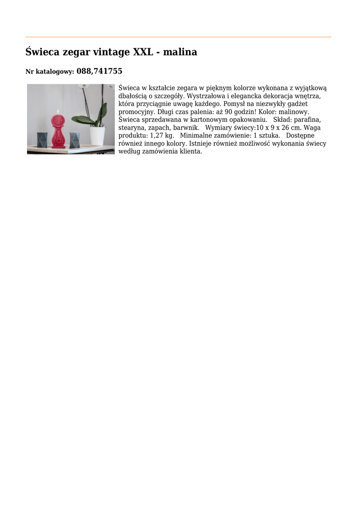Świeca zegar vintage XXL - malina Nr katalogowy: 088,741755 Świeca w kształcie zegara w pięknym kolorze wykonana z wyjątkową dbałością o szczegóły. Wystrzałowa i elegancka dekoracja wnętrza, która przyciągnie uwagę każdego. Pomysł na niezwykły gadżet promocyjny. Długi czas palenia: aż 90 godzin! Kolor: malinowy. Świeca sprzedawana w kartonowym opakowaniu. Skład: parafina, stearyna, zapach, barwnik. Wymiary świecy:10 x 9 x 26 cm. Waga produktu: 1,27 kg. Minimalne zamówienie: 1 sztuka. Dostępne również innego kolory. Istnieje również możliwość wykonania świecy według zamówienia klienta.