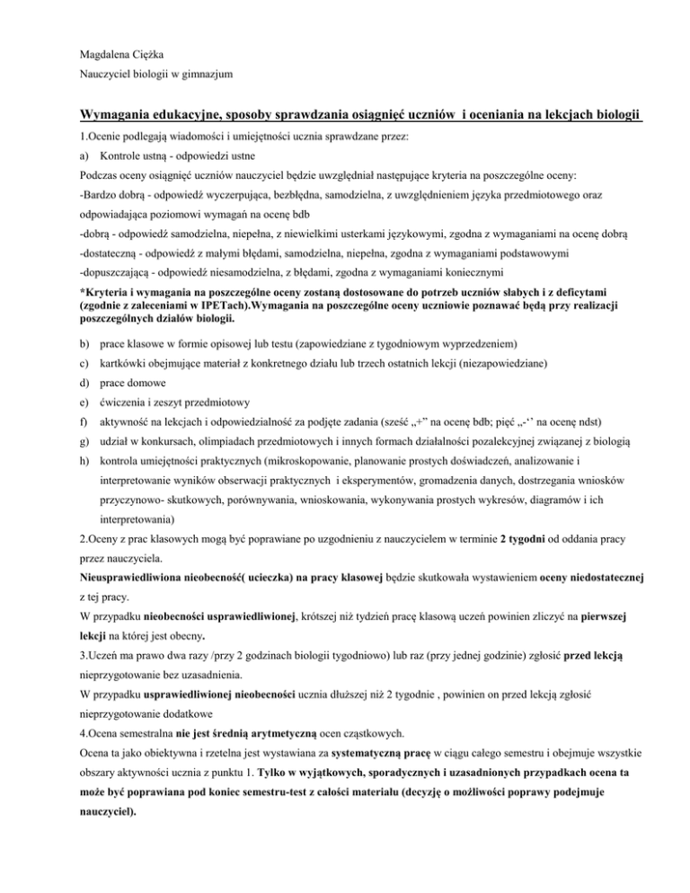 Magdalena Ciężka Nauczyciel biologii w gimnazjum Wymagania edukacyjne, sposoby sprawdzania osiągnięć uczniów i oceniania na lekcjach biologii 1.Ocenie podlegają wiadomości i umiejętności ucznia sprawdzane przez: a) Kontrole ustną - odpowiedzi ustne Podczas oceny osiągnięć uczniów nauczyciel będzie uwzględniał następujące kryteria na poszczególne oceny: -Bardzo dobrą - odpowiedź wyczerpująca, bezbłędna, samodzielna, z uwzględnieniem języka przedmiotowego oraz odpowiadająca poziomowi wymagań na ocenę bdb -dobrą - odpowiedź samodzielna, niepełna, z niewielkimi usterkami językowymi, zgodna z wymaganiami na ocenę dobrą -dostateczną - odpowiedź z małymi błędami, samodzielna, niepełna, zgodna z wymaganiami podstawowymi -dopuszczającą - odpowiedź niesamodzielna, z błędami, zgodna z wymaganiami koniecznymi *Kryteria i wymagania na poszczególne oceny zostaną dostosowane do potrzeb uczniów słabych i z deficytami (zgodnie z zaleceniami w IPETach).Wymagania na poszczególne oceny uczniowie poznawać będą przy realizacji poszczególnych działów biologii. b) prace klasowe w formie opisowej lub testu (zapowiedziane z tygodniowym wyprzedzeniem) c) kartkówki obejmujące materiał z konkretnego działu lub trzech ostatnich lekcji (niezapowiedziane) d) prace domowe e) ćwiczenia i zeszyt przedmiotowy f) aktywność na lekcjach i odpowiedzialność za podjęte zadania (sześć „+” na ocenę bdb; pięć „-‘’ na ocenę ndst) g) udział w konkursach, olimpiadach przedmiotowych i innych formach działalności pozalekcyjnej związanej z biologią h) kontrola umiejętności praktycznych (mikroskopowanie, planowanie prostych doświadczeń, analizowanie i interpretowanie wyników obserwacji praktycznych i eksperymentów, gromadzenia danych, dostrzegania wniosków przyczynowo- skutkowych, porównywania, wnioskowania, wykonywania prostych wykresów, diagramów i ich interpretowania) 2.Oceny z prac klasowych mogą być poprawiane po uzgodnieniu z nauczycielem w terminie 2 tygodni od oddania pracy przez nauczyciela. Nieusprawiedliwiona nieobecność( ucieczka) na pracy klasowej będzie skutkowała wystawieniem oceny niedostatecznej z tej pracy. W przypadku nieobecności usprawiedliwionej, krótszej niż tydzień pracę klasową uczeń powinien zliczyć na pierwszej lekcji na której jest obecny. 3.Uczeń ma prawo dwa razy /przy 2 godzinach biologii tygodniowo) lub raz (przy jednej godzinie) zgłosić przed lekcją nieprzygotowanie bez uzasadnienia. W przypadku usprawiedliwionej nieobecności ucznia dłuższej niż 2 tygodnie , powinien on przed lekcją zgłosić nieprzygotowanie dodatkowe 4.Ocena semestralna nie jest średnią arytmetyczną ocen cząstkowych. Ocena ta jako obiektywna i rzetelna jest wystawiana za systematyczną pracę w ciągu całego semestru i obejmuje wszystkie obszary aktywności ucznia z punktu 1. Tylko w wyjątkowych, sporadycznych i uzasadnionych przypadkach ocena ta może być poprawiana pod koniec semestru-test z całości materiału (decyzję o możliwości poprawy podejmuje nauczyciel).